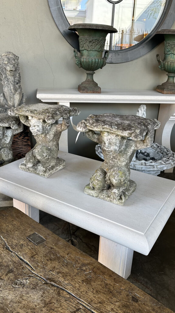 A pair of oversized urns, some charming cement bulldogs, and a little pig with piglets. Also, some faux bois garden furniture from early 20th-century France—cast stone made to look like wood. Each piece with a little personality of its own.