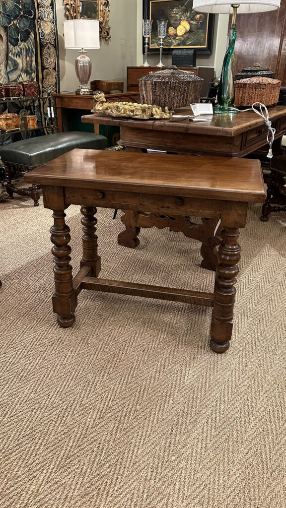 I love them all—but I was especially taken by the early Spanish and Portuguese pieces. Deep turnings, rich woods, fantastic character. One bench sold on day two, which is always bittersweet. And then there are small things, like a framed 1930s Babar print I might keep for myself, or a rustic carved burl bowl. Campaign furniture also stands out—streamlined but elegant, perfect for traditional or modern interiors.