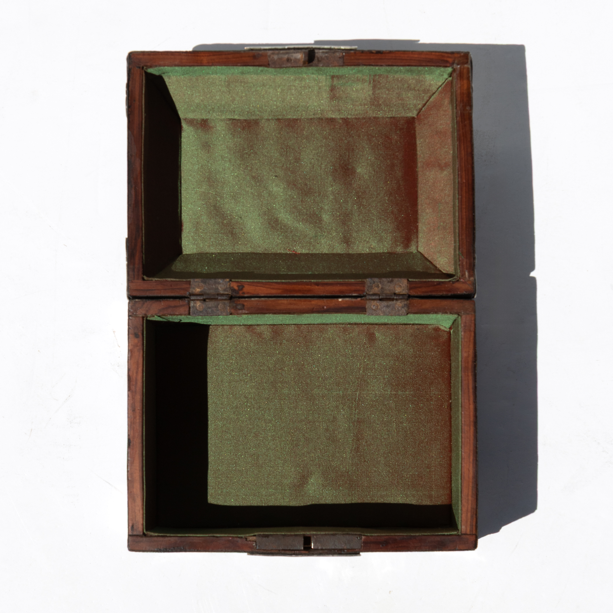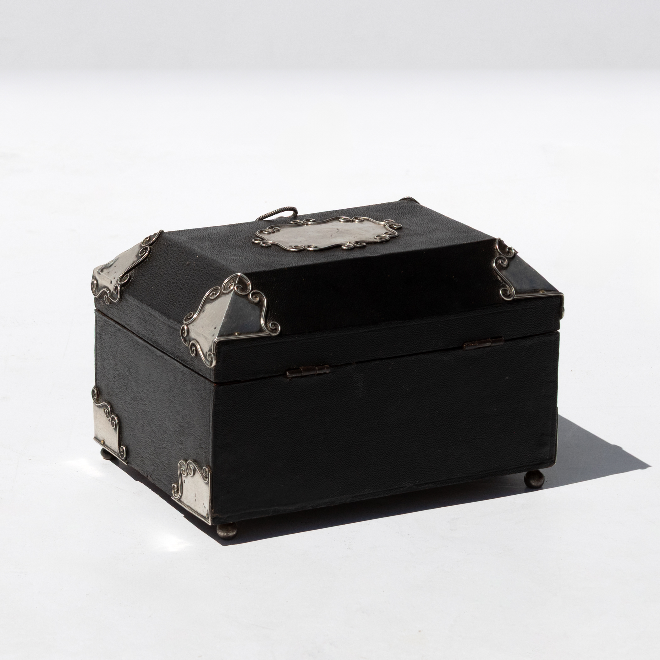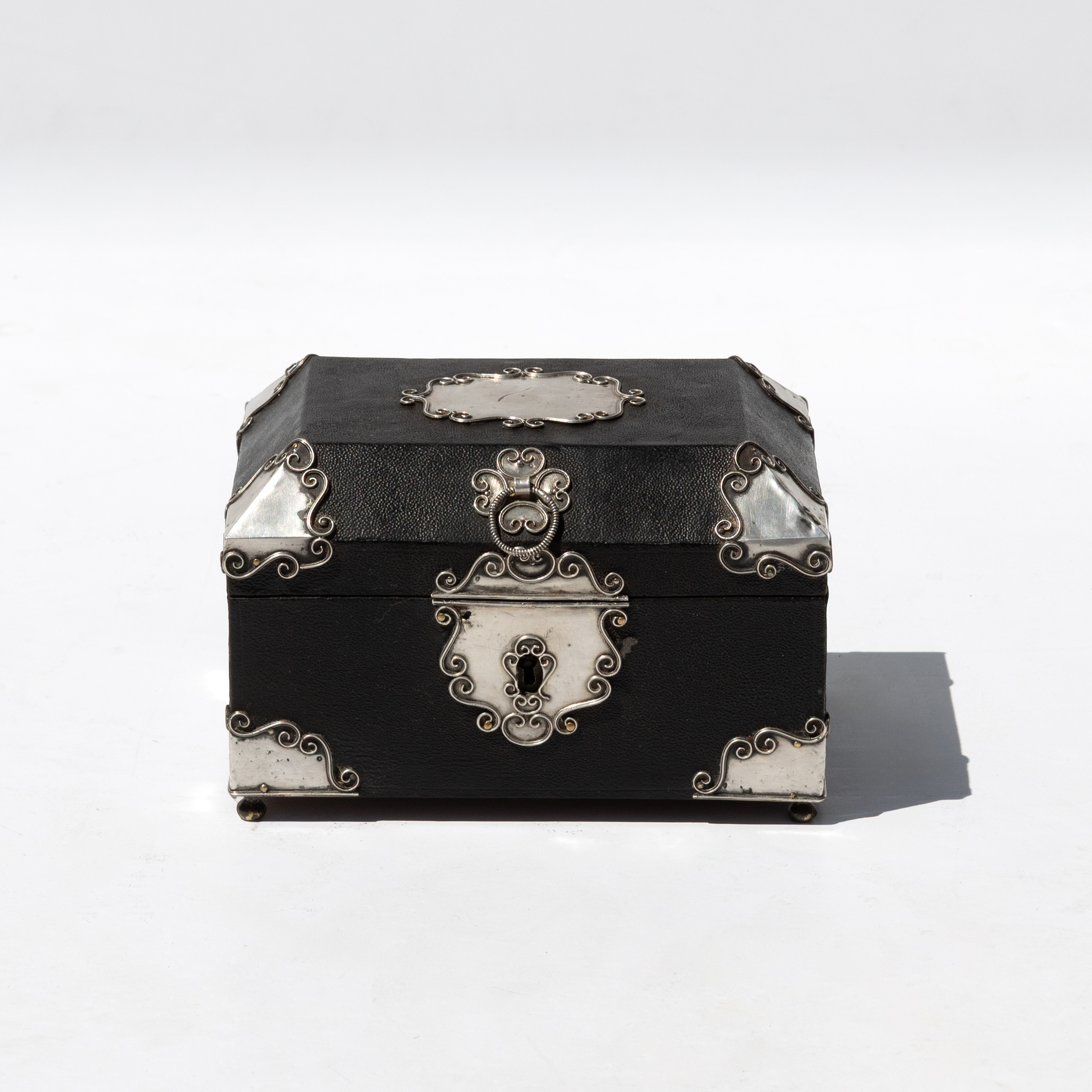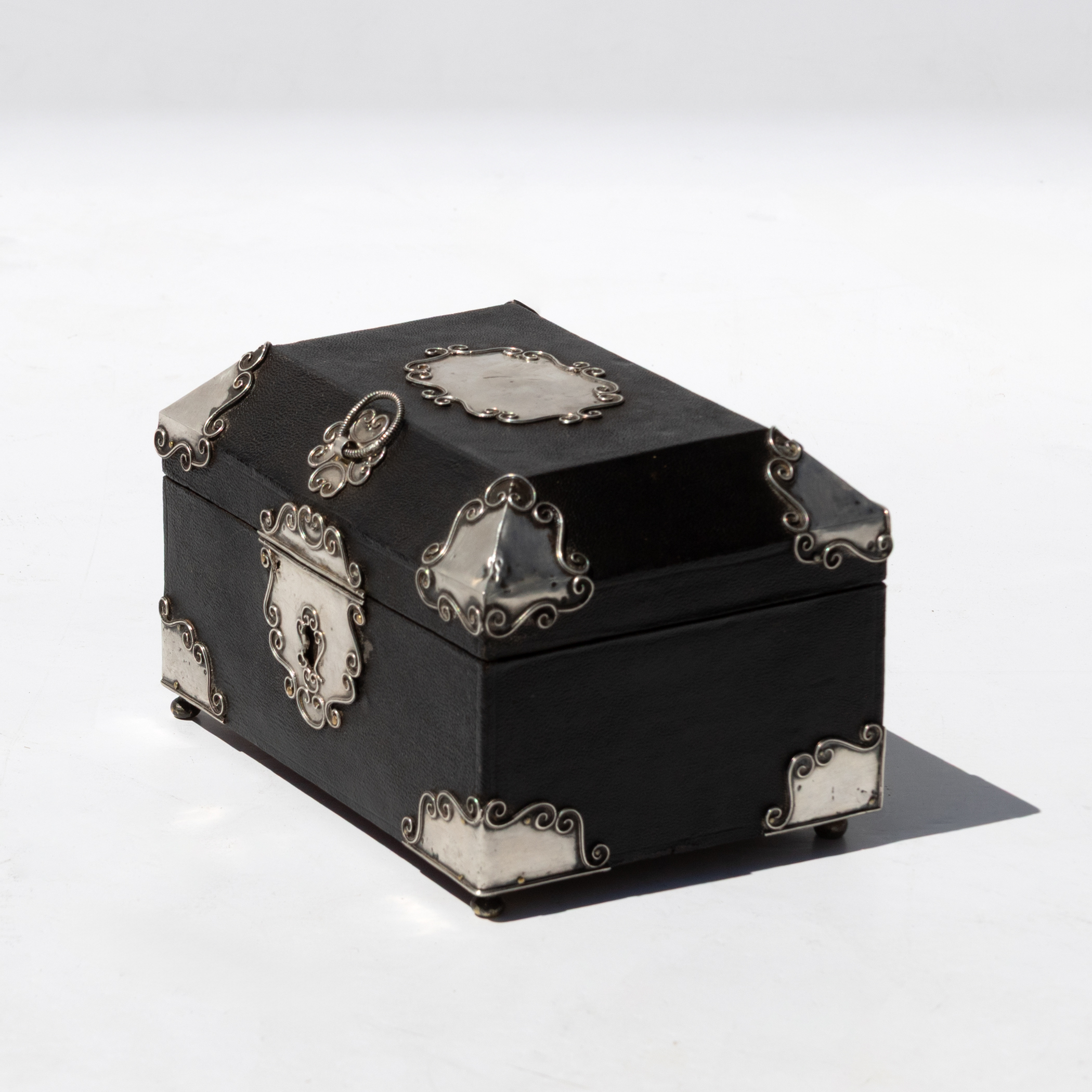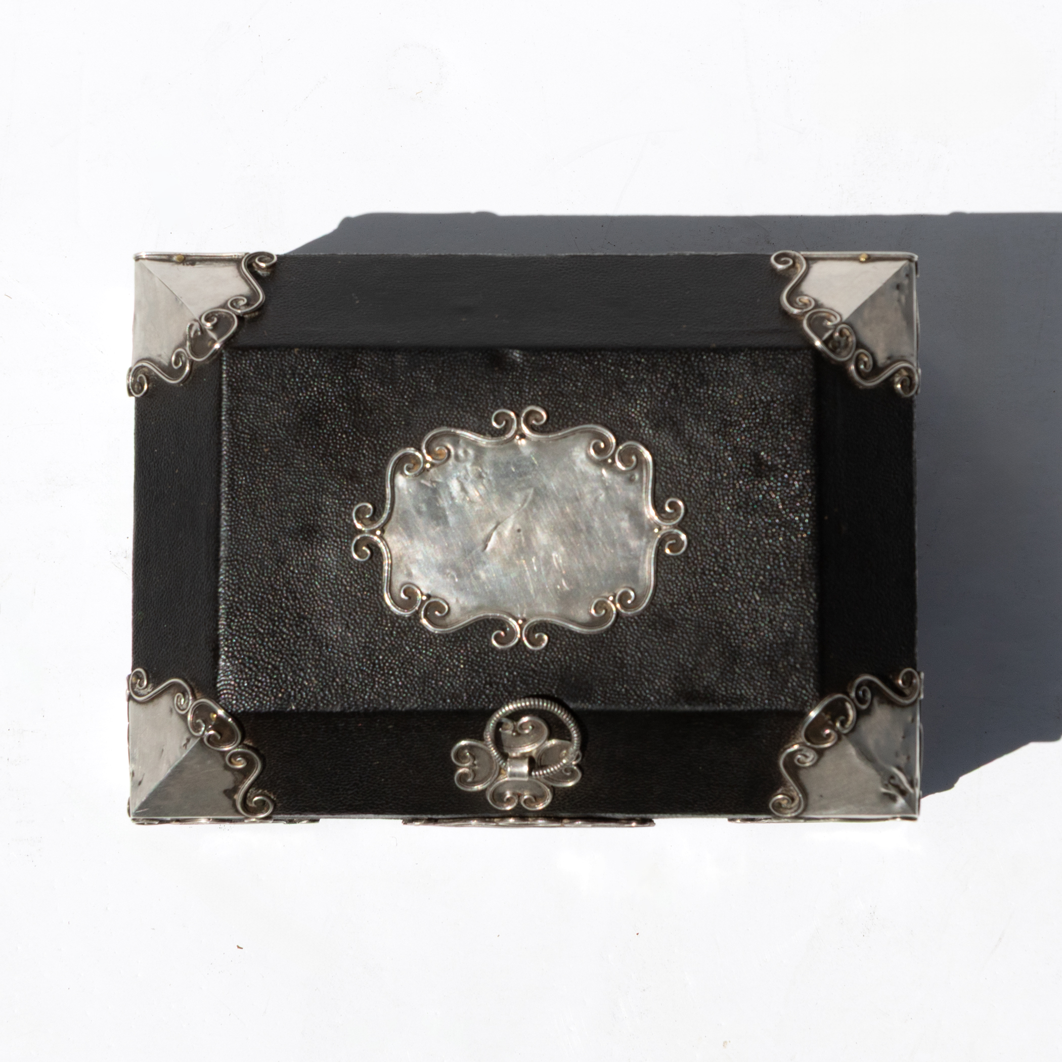 An 18th-century Dutch decorative box with faux shagreen exterior—finely pressed leather—and elegant filigree silver cartouche-shaped mounts bearing multiple rubbed hallmarks. The carcass is solid pearwood, visible to the underside and interior edging.