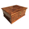 18th Century walnut marquetry box with contrasting dark and light diagonal inlay. Each of the sides including the top having inlaid square walnut panels. Each of these 8 burr walnut side panels are framed with either fruitwood or coramandle. The two panels on the back of the box are separated by a checkered pattern of cherry and maple. Original key and working lock. Repapered insides. ca. 1790, restorations, French polish.