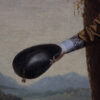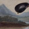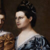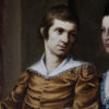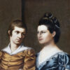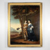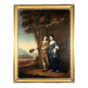 An imposing oil on canvas of a merchant and his wife Portugal circa 1790. The painting features intricate details of the subjects’ attire and the serene landscape around them. The merchant is wearing a mustard-toned doublet with white lace collar, suggesting affluence and social standing. His wife wears a sumptuous navy gown accented with lace; her coiffure styled with pearls in a period-specific manner both indicative of her status. Notable is the tranquil pastoral scene in the backdrop, lending a sense of depth and context. An ornate urn with classical design is a nod to the tastes of the time. This piece is representative of late 18th-century Portuguese portraiture, displaying the sitters’ prosperity and the era’s aesthetic inclinations. Portugal circa 1790.