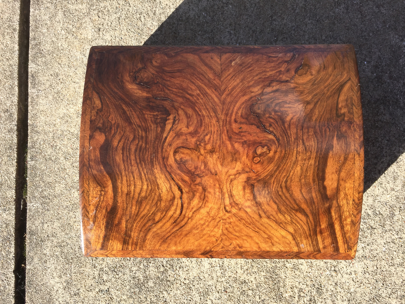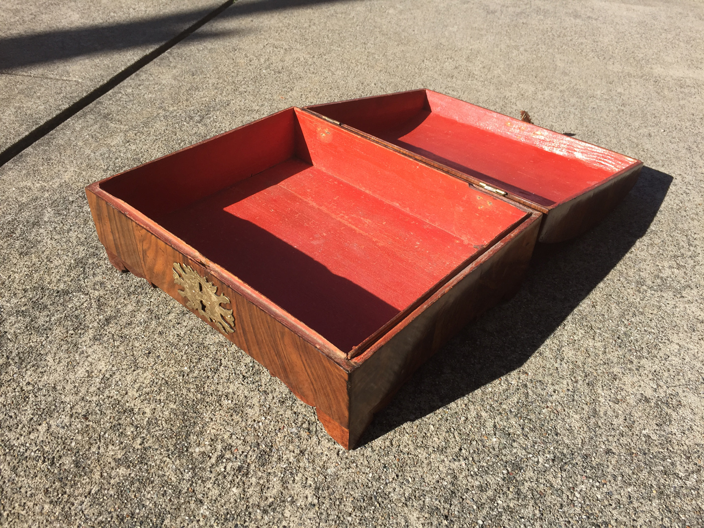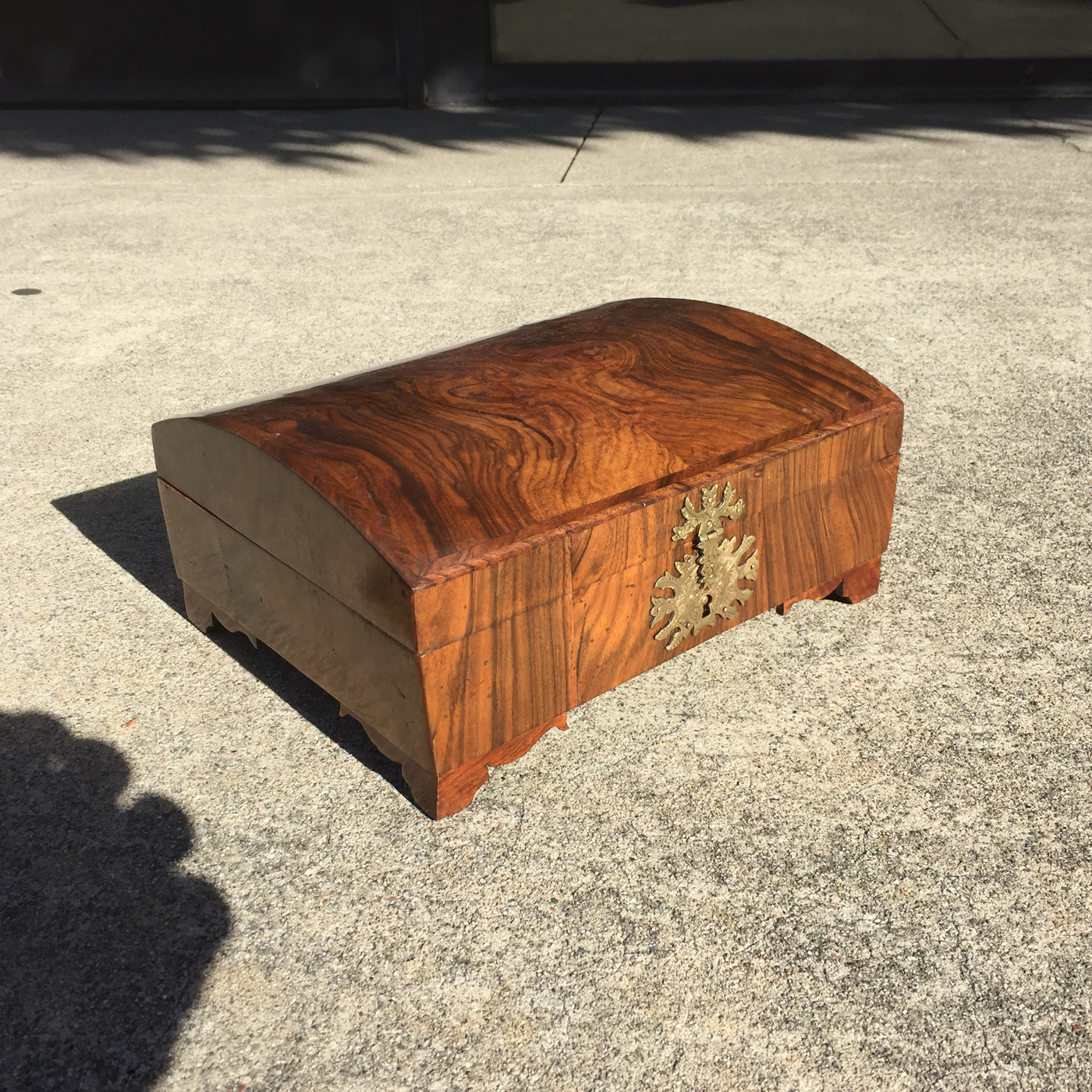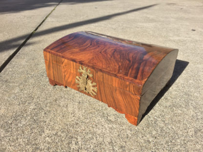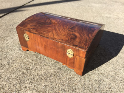 A lovely 18th century English walnut and feather banded dome top box with intricate engraved lock plates on bracket feet; with working lock and key, French polished.