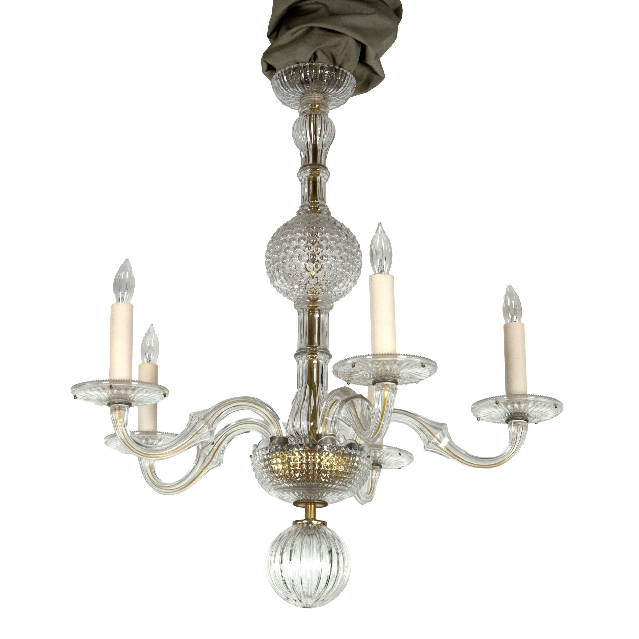 American 20th century, clear-cut crystal and brass chandelier, with five arms and a central stem with a raised dot, studded central sphere, cross-hatched bottom, and matching ribbed, lobed ball finial; the arms extend from the bottom with elegant curvature, terminating with fluted bobeche displaying shallow grooves and channels; 1930's. diameter: 20 in. (51 cm),