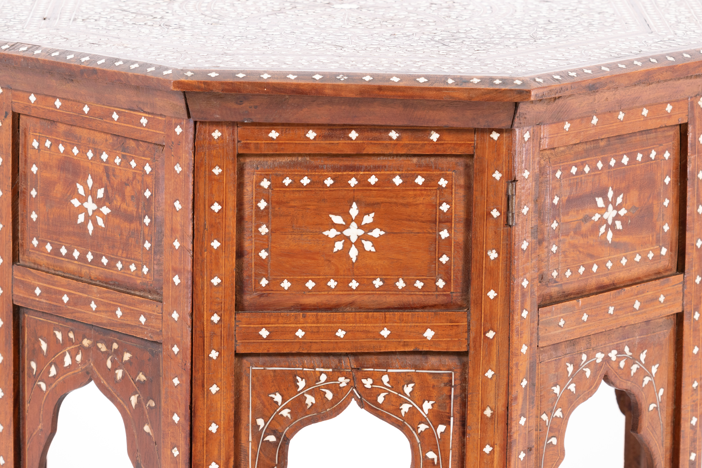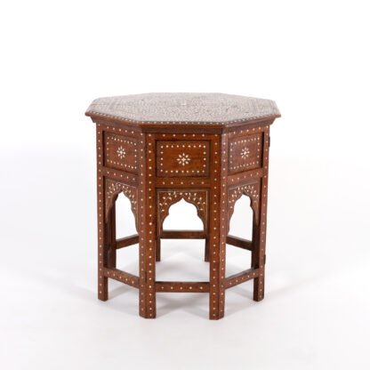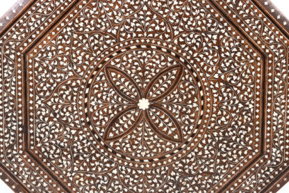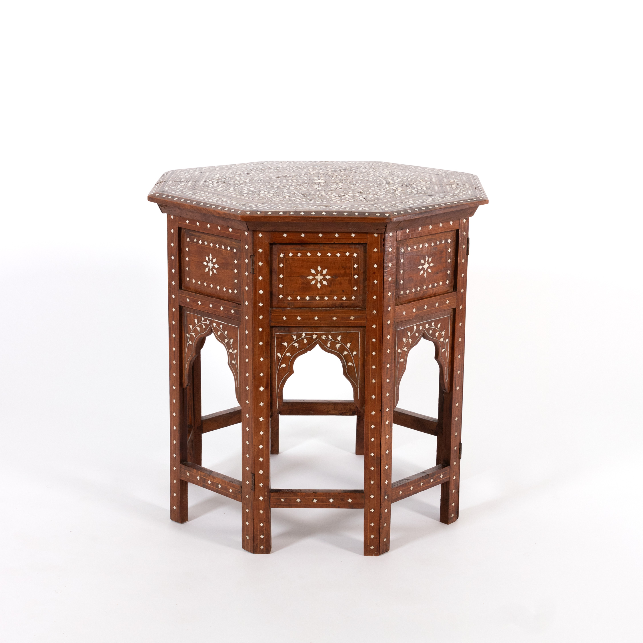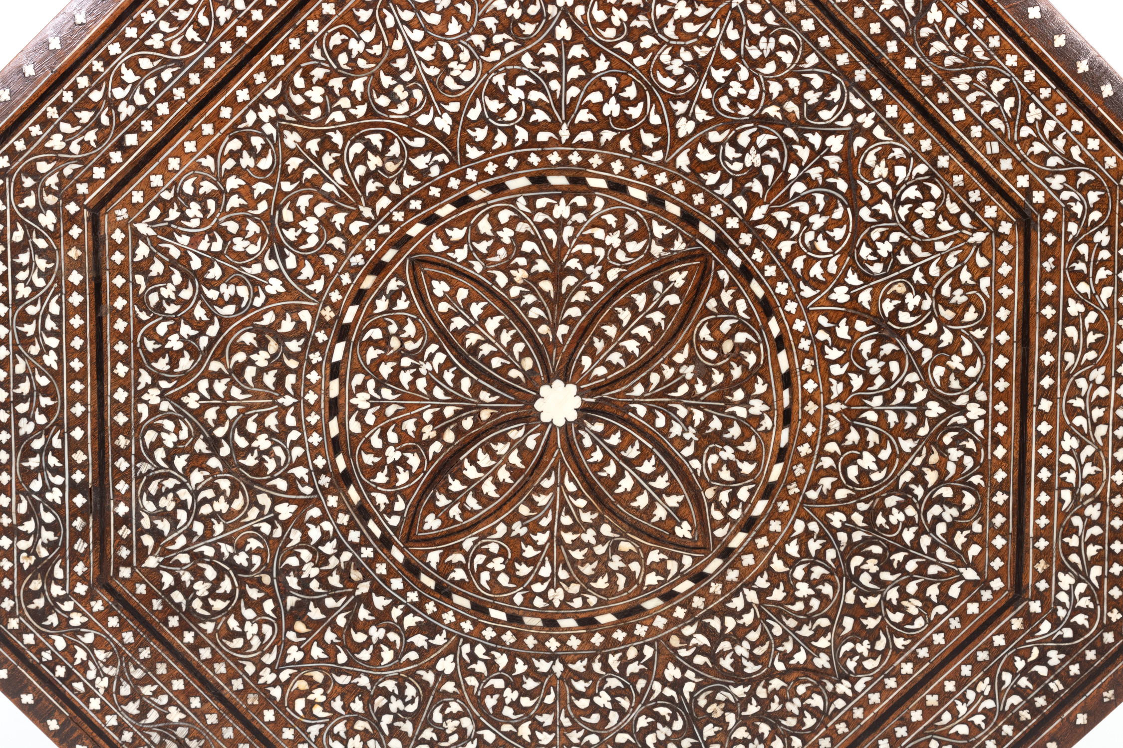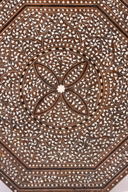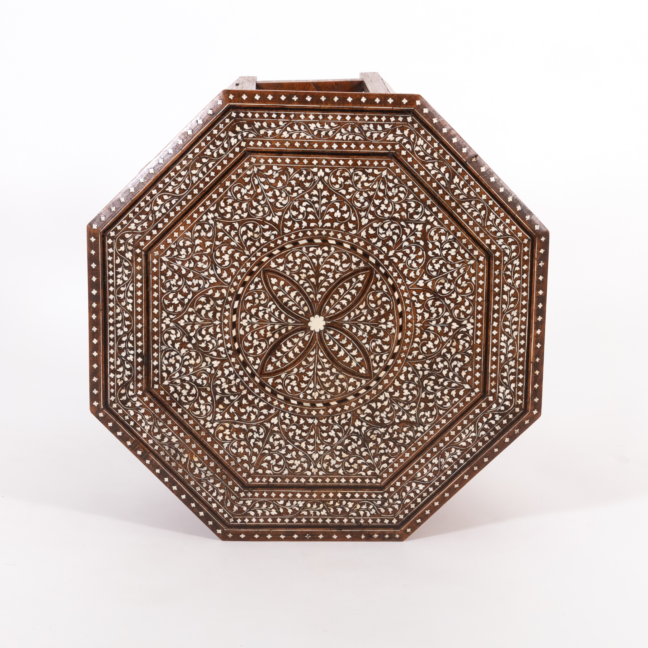 An Anglo-Indian octagonal travel table/end table/taboret with intricate bone and ebony inlay. The octagonal top is decorated with a central medallion of a lotus flower1 encircled by undulating vines, leaves, and flowers. The inlay is edged with a double border design with winding vines and arcaded design panels at the base. The table is made of teak wood with a folding base which is now fixed for greater stability.2 India, circa 1880. 3