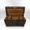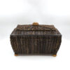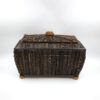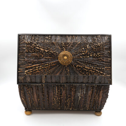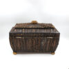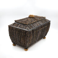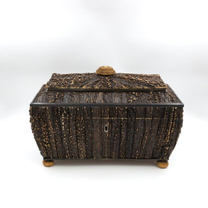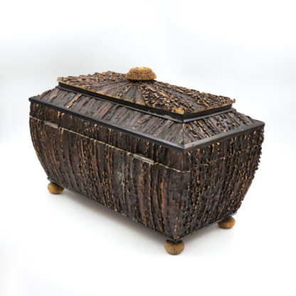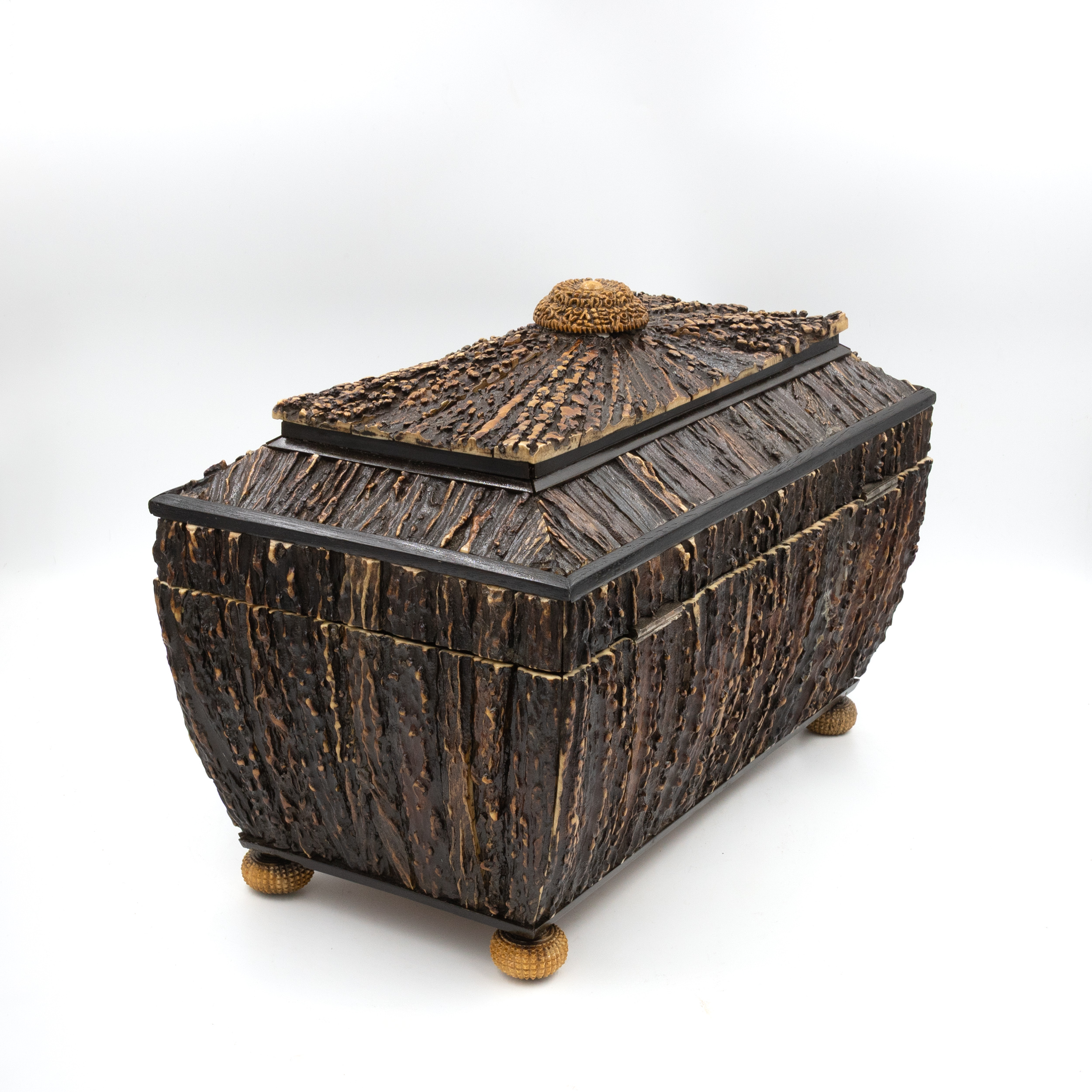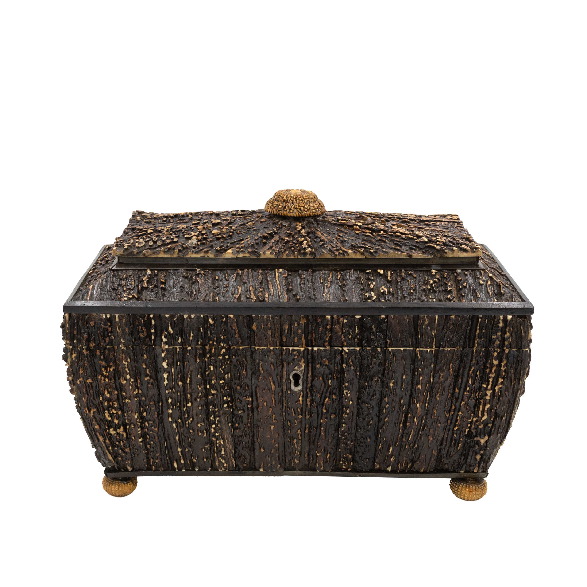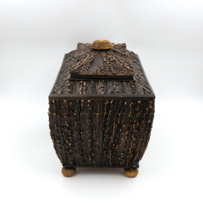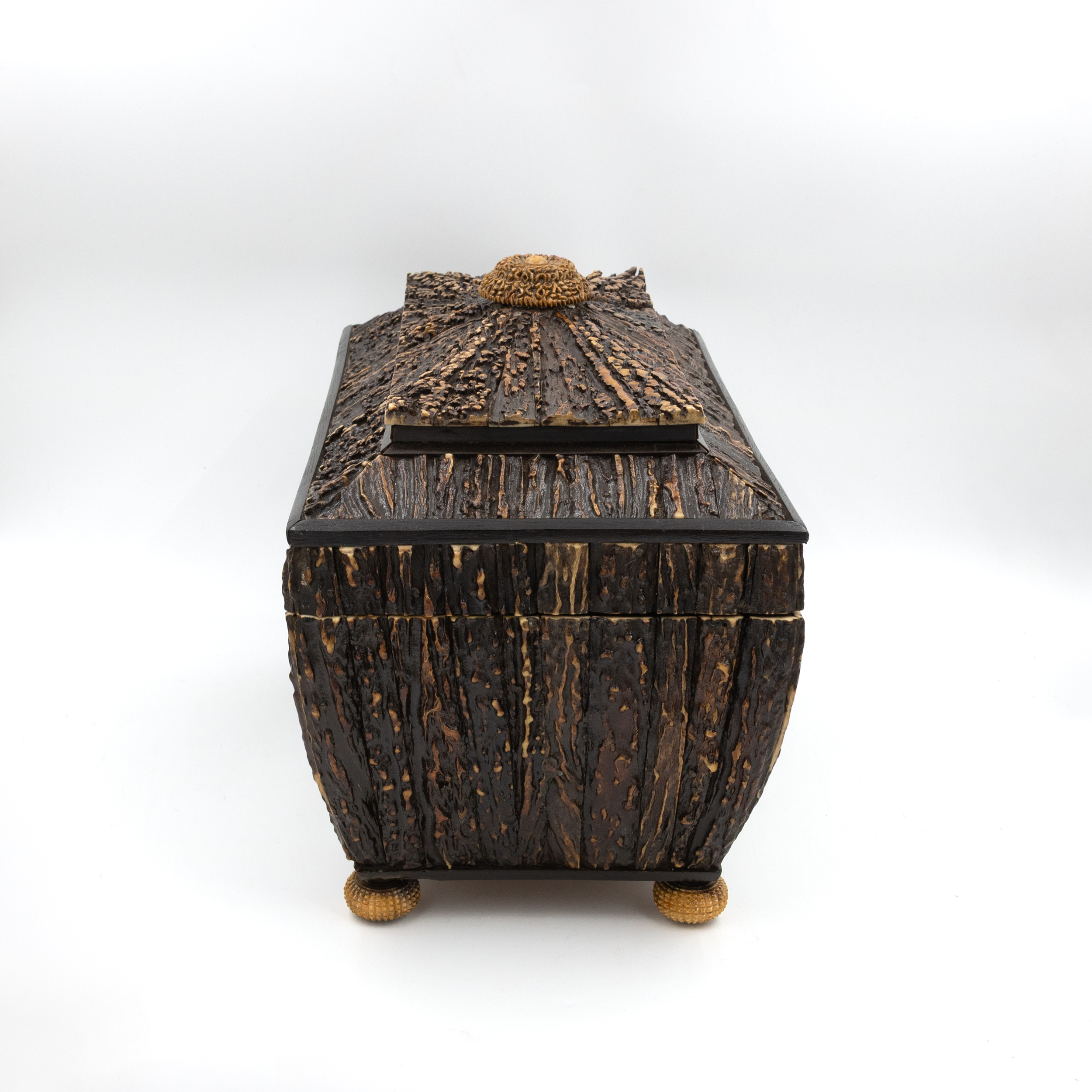 Nineteenth-century Anglo-Indian stag horn box and solid sandalwood body. Double-tiered pagoda form top centered by carved horn finial. Bombe form case with vertical striated decoration. Black trim throughout. The interior likely served as a tea caddy; now vacant divided into three compartments. Inset decorative border to lid. Brass lock plate with working key. Carved horn ball feet. India, circa 1860