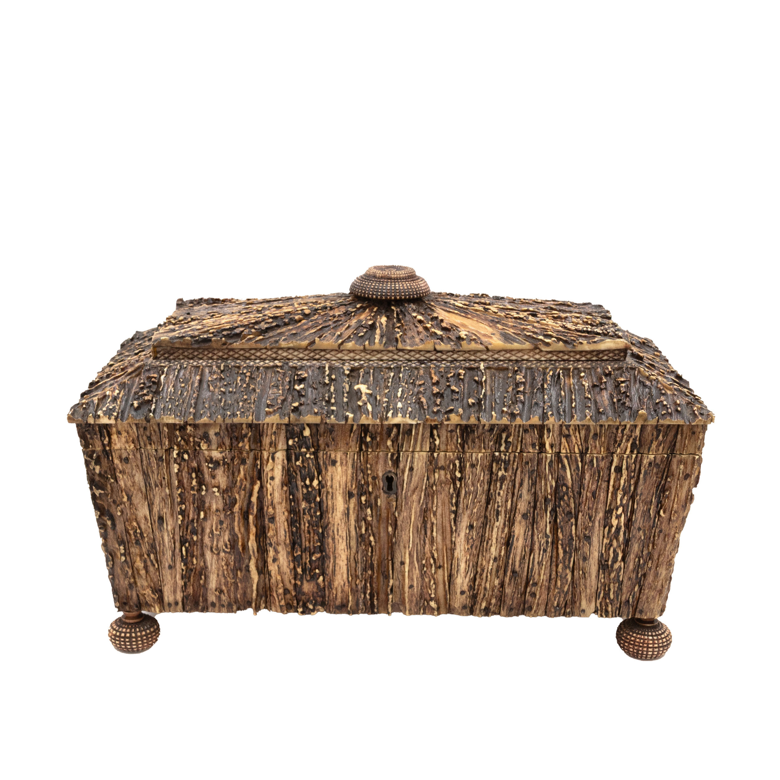 Exceptional tea caddy veneered in stag horn with a pagoda-form lid surmounted by a decorative carved horn finial. The top displays a striking radiating pattern of stag horn. The canted sides with stag horn veneer in vertical striations. The box rests on spherical carved horn feet. The interior fitted with two compartments with removable bone and ebony checkerboard patterned lids, flanking a central glass container for sugar. The lid interior of fine satinwood construction with an inlaid oval medallion and decorative border. Black buffalo horn banding outlines the solid satinwood body underneath the horn veneer; working lock and key. India, circa 1830 Height: 9 in. (23 cm.)