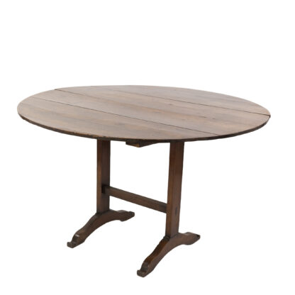 A round fruitwood tilt-top table on trestle base. French circa 1800 The round slatted-plank top with a rich golden patina darkened and aged; slightly distressed and weathered in appearance with imperfections all adding charm, character and authenticity. [1. Vendange is a French word that refers to the process of grape harvesting, and a vendange table is a table that is used for this process. The term is derived from the French verb "vendanger," which means "to gather grapes." The vendange table was specifically designed for use in the grape harvesting process. It may have been used for the sorting and processing of grapes, storing and organizing tools and equipment, etc. The slatted/plank top would allow for easy drainage of juice and other liquids. ] height: 30 in. 76 cm., diameter: 48 in. 122 cm.