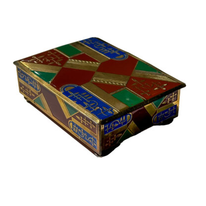 Geometric patterned brass and enamel cigarette box decorated in red, green, and blue enamel with stylized Art Deco motifs. The hinged lid opens to reveal a mahogany-lined interior. The case rests on four brass bun feet. Austrian, Circa 1920