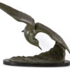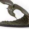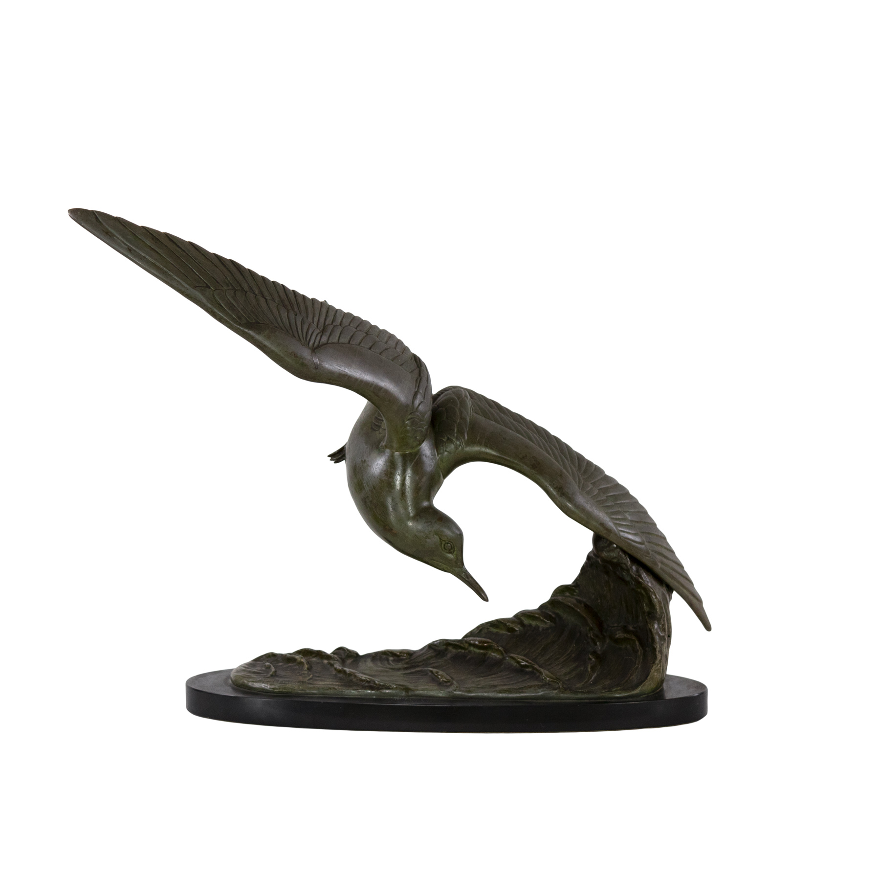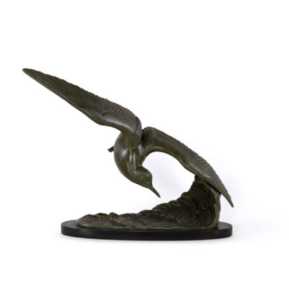 Patinated bronze Art Nouveau-styled sculpture of a tern in-flight over a realistic & highly-detailed ocean wave. Signed on the base “I. Rochard”, by the French decorative sculptor, Irénée Rochard, (1906-1984), circa 1940. The bronze sculpture is patinaed dark, rich, green with a highly animated pose that suggests a tern in mid-flight, looking down, intently patrolling the waters for fish. 12