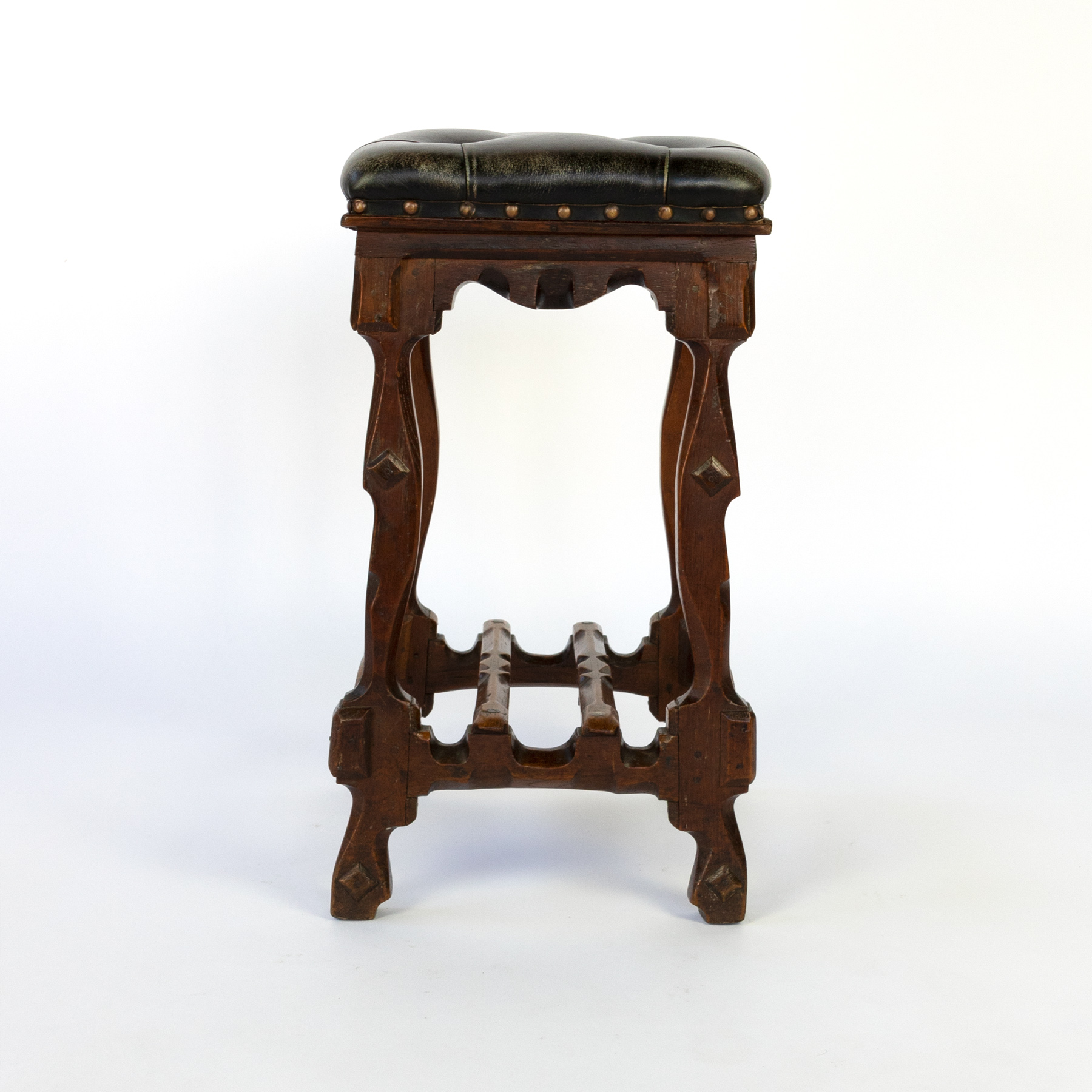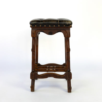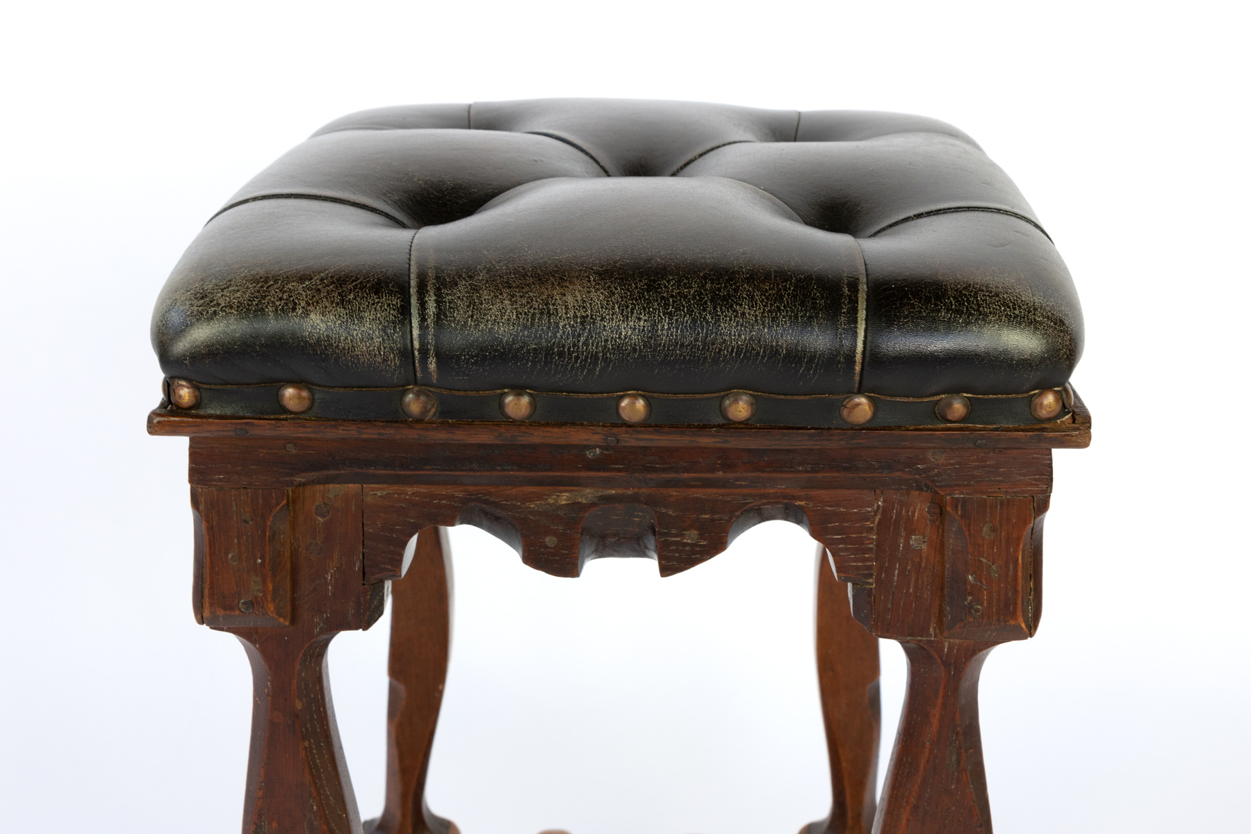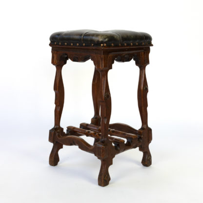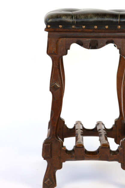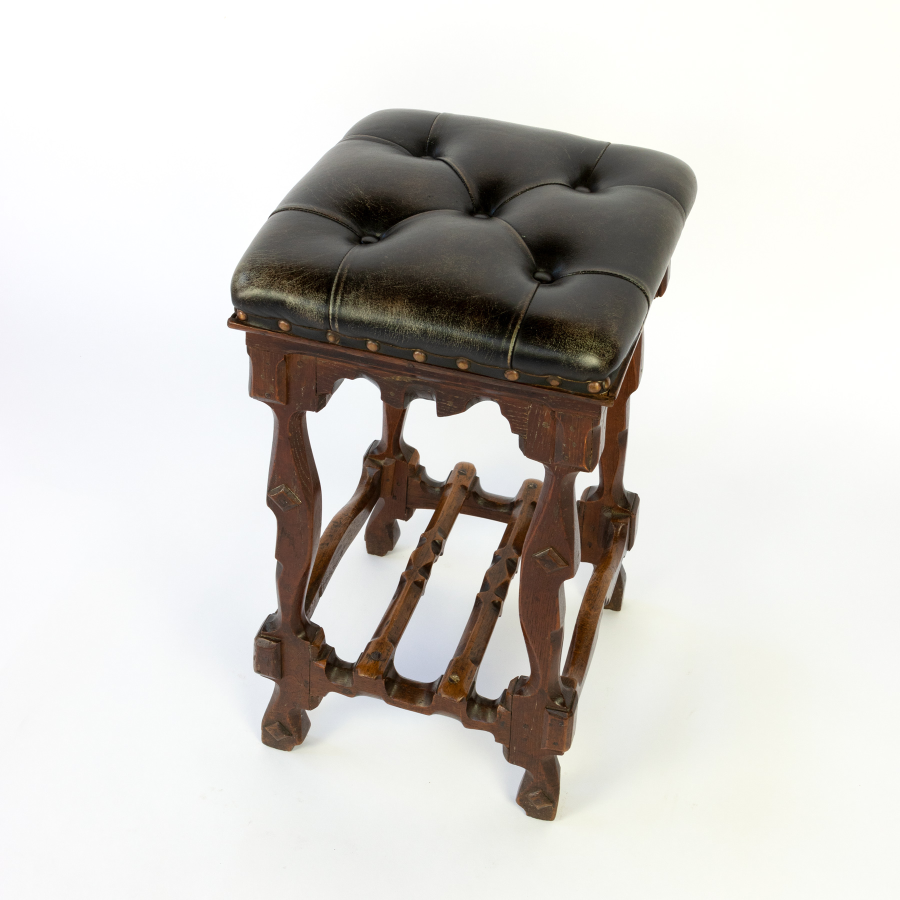 Arts and Crafts Period square upholstered stool, beautifully carved apron, legs and stretchers with , nailhead trim, English circa 1880.