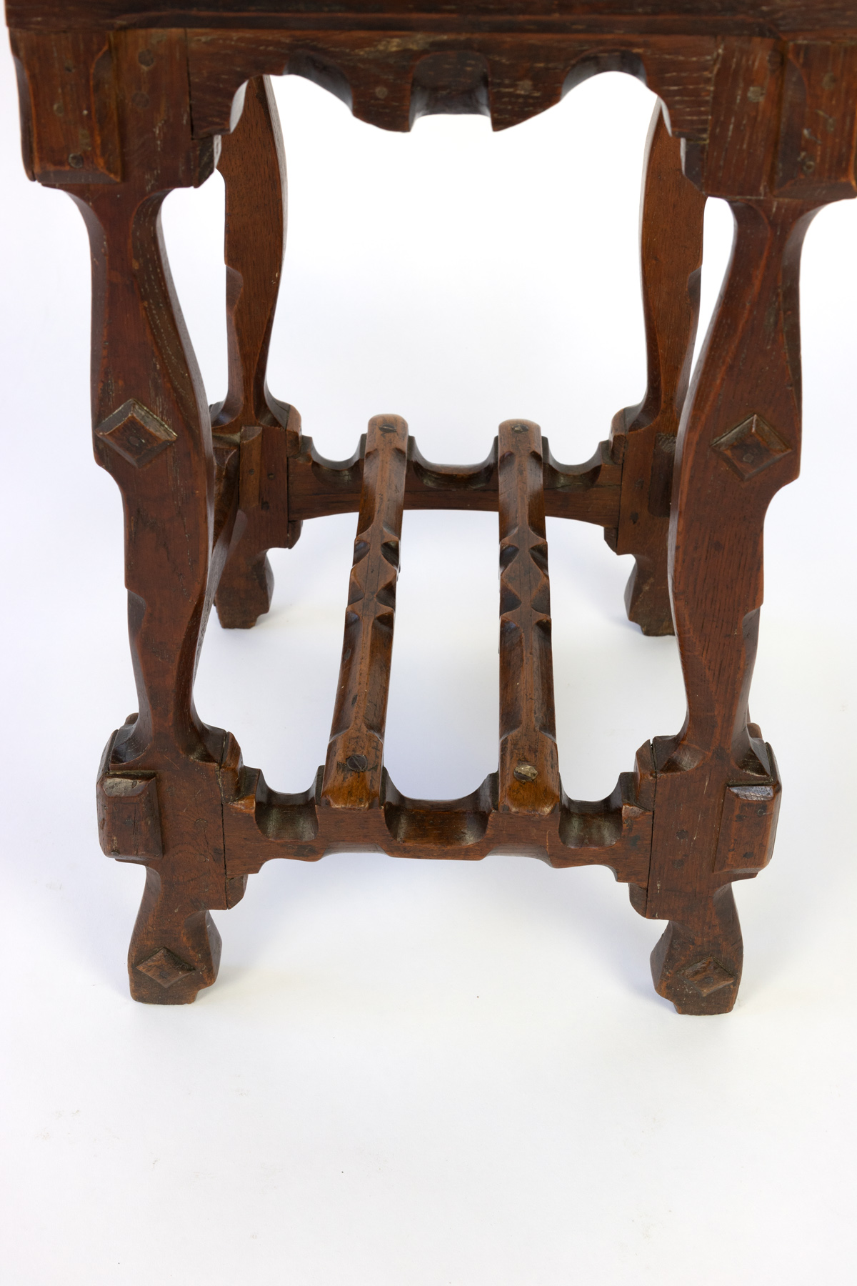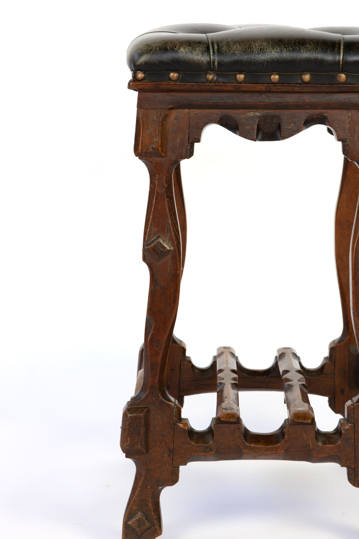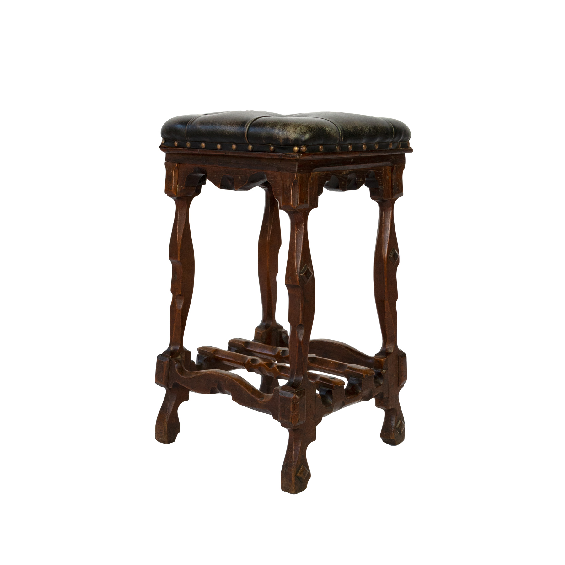 Arts and Crafts Period square upholstered stool, beautifully carved apron, legs and stretchers with , nailhead trim, English circa 1880.
