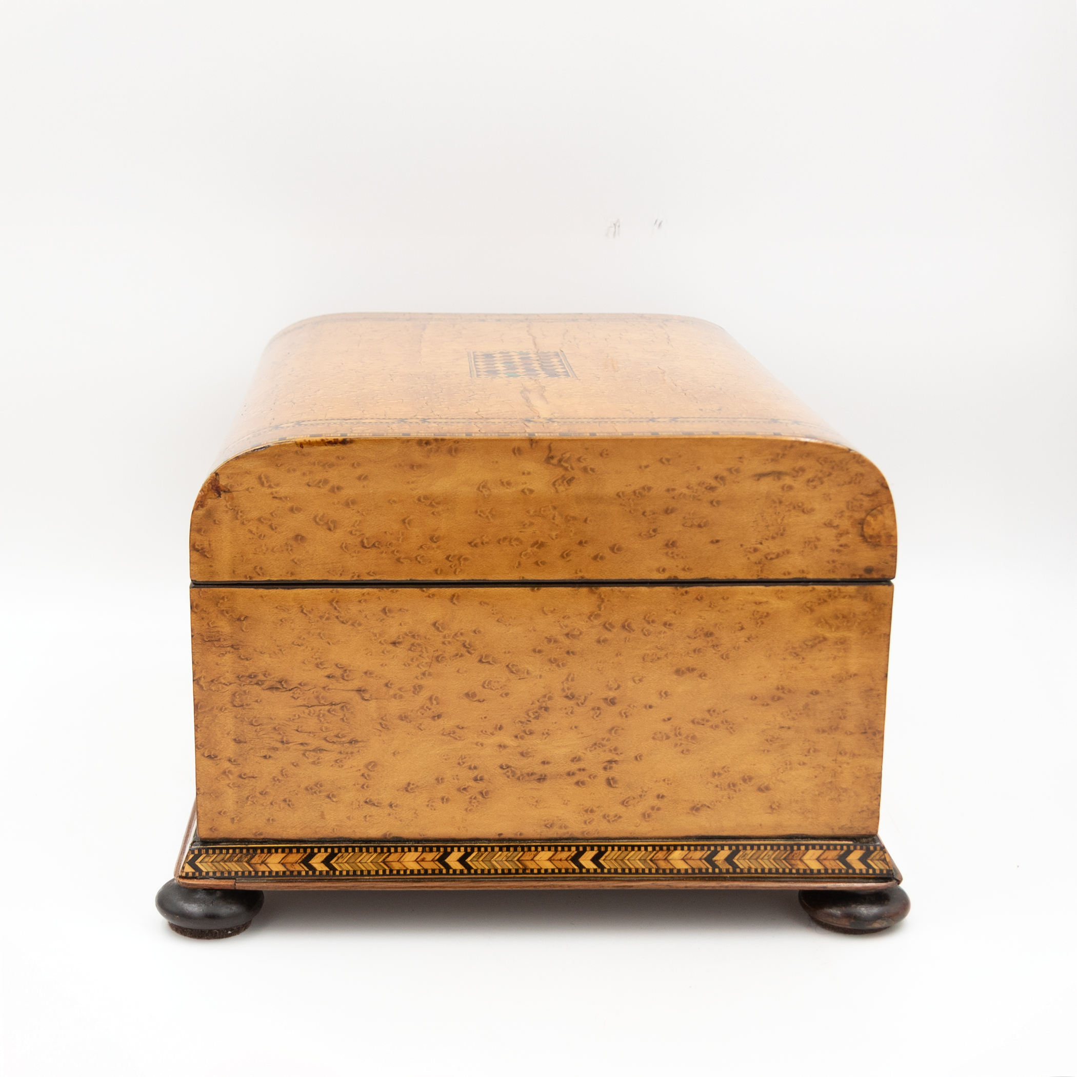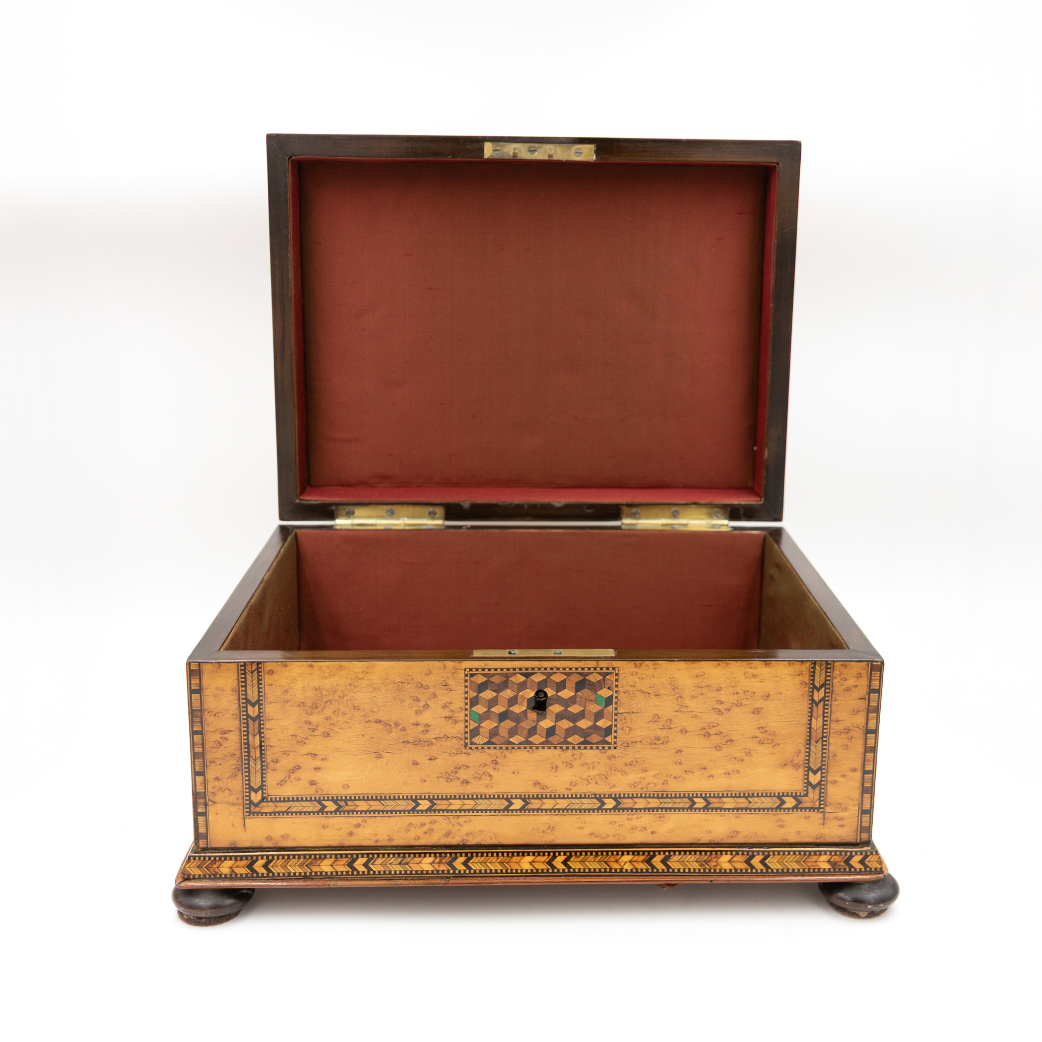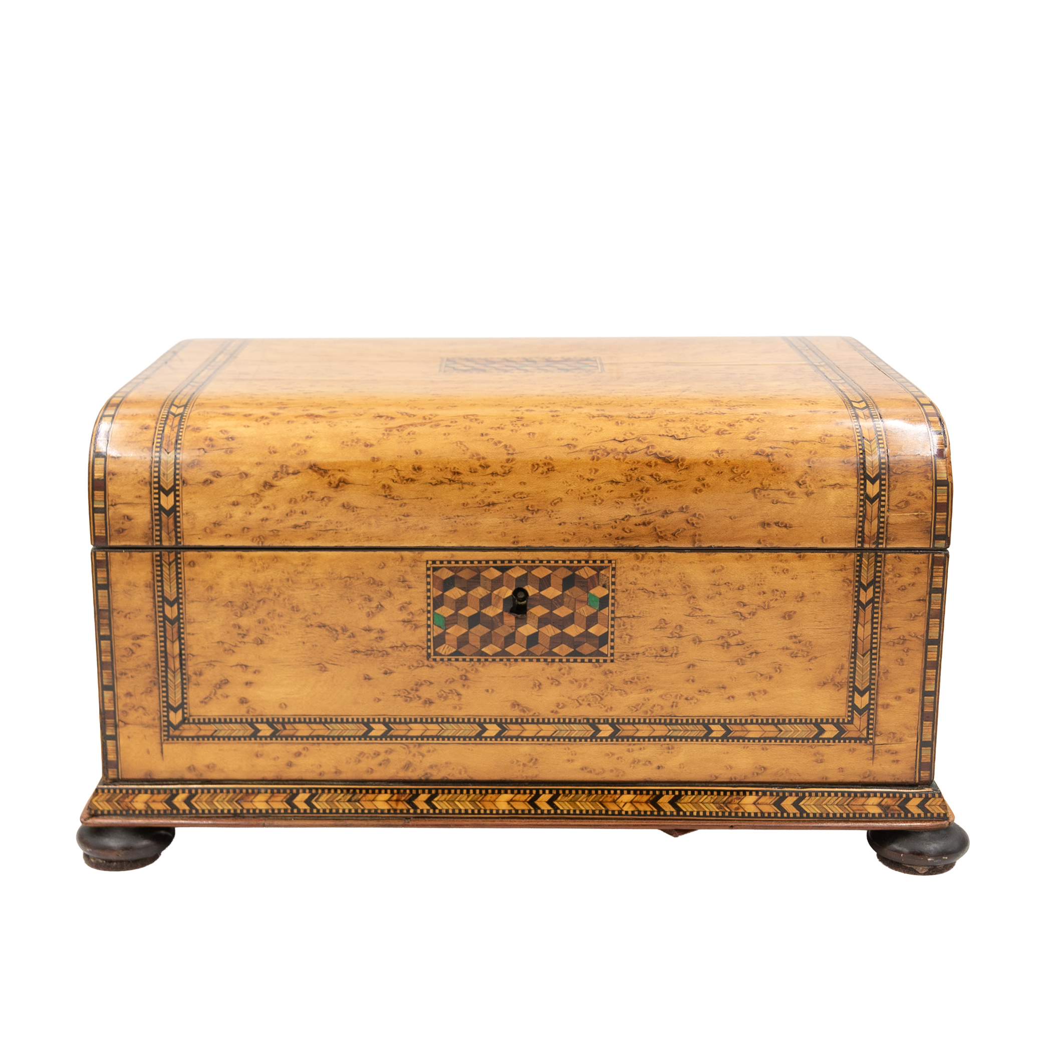 Bird’s-eye maple veneer box having a domed hinged lid centered by a rectangular panel of tumbling-block parquetry with green-stained accents, bordered by geometric Tunbridge ware banding. The fascia inset with a conforming parquetry escutcheon and banding. Opening to a crimson silk-lined interior, showing light wear and marks consistent with use. Underside with false bottom secured by rotating wooden cleats concealing a secret compartment. Raised on four compressed bun feet. Includes working lock and key. English Regency (George IV period), circa 1830.