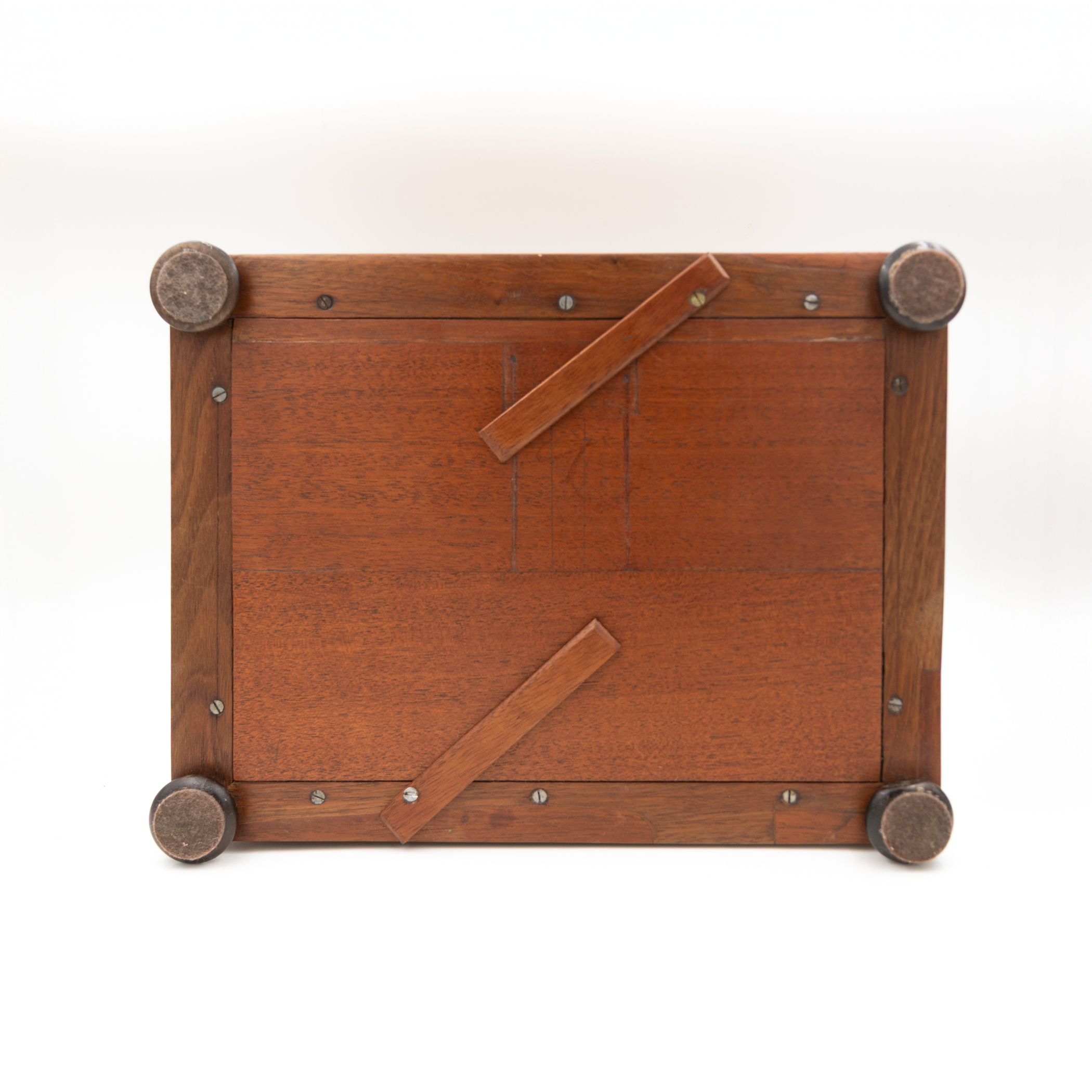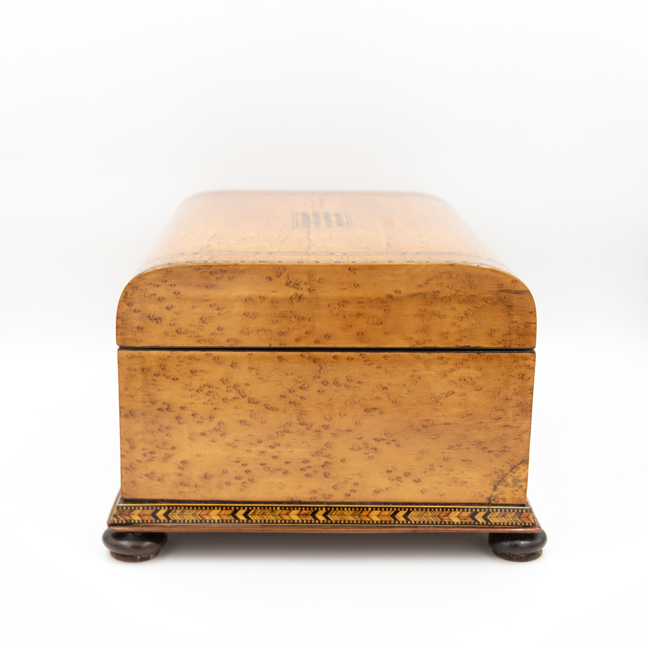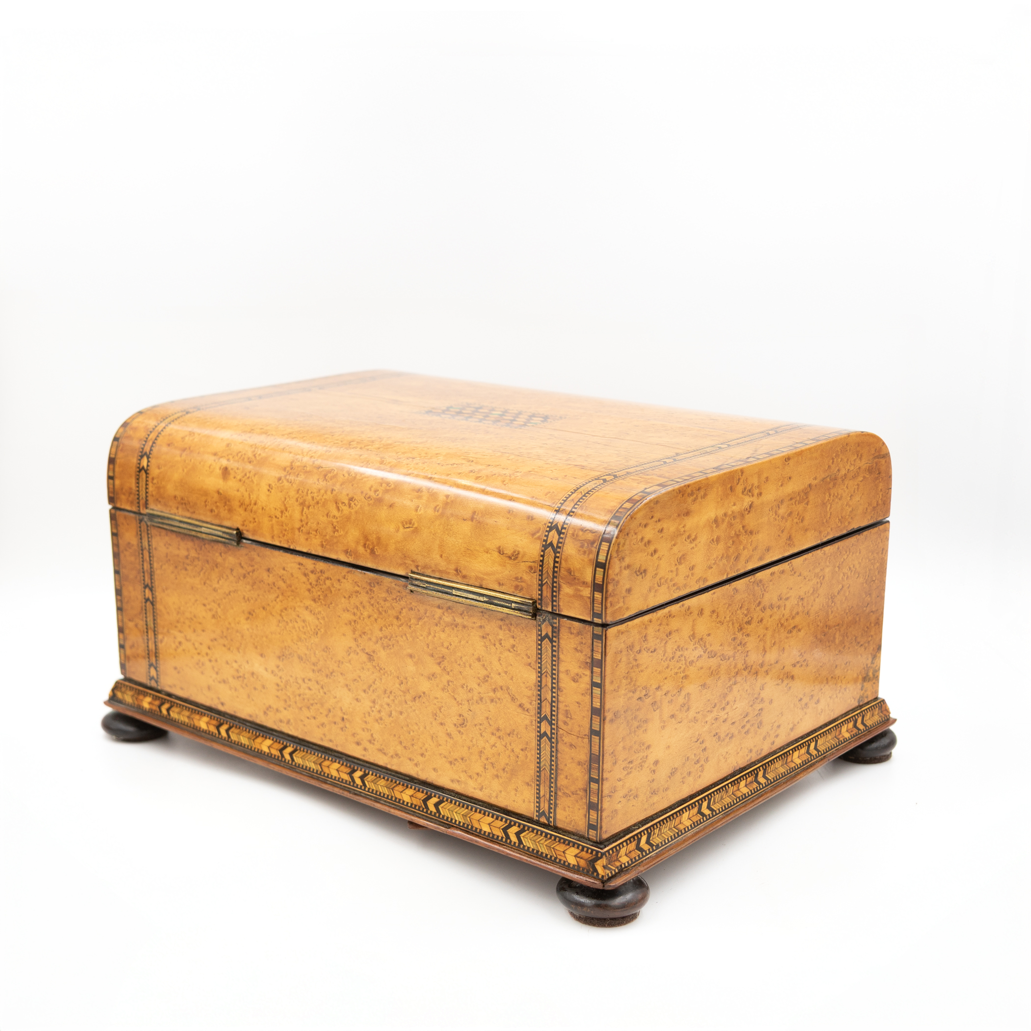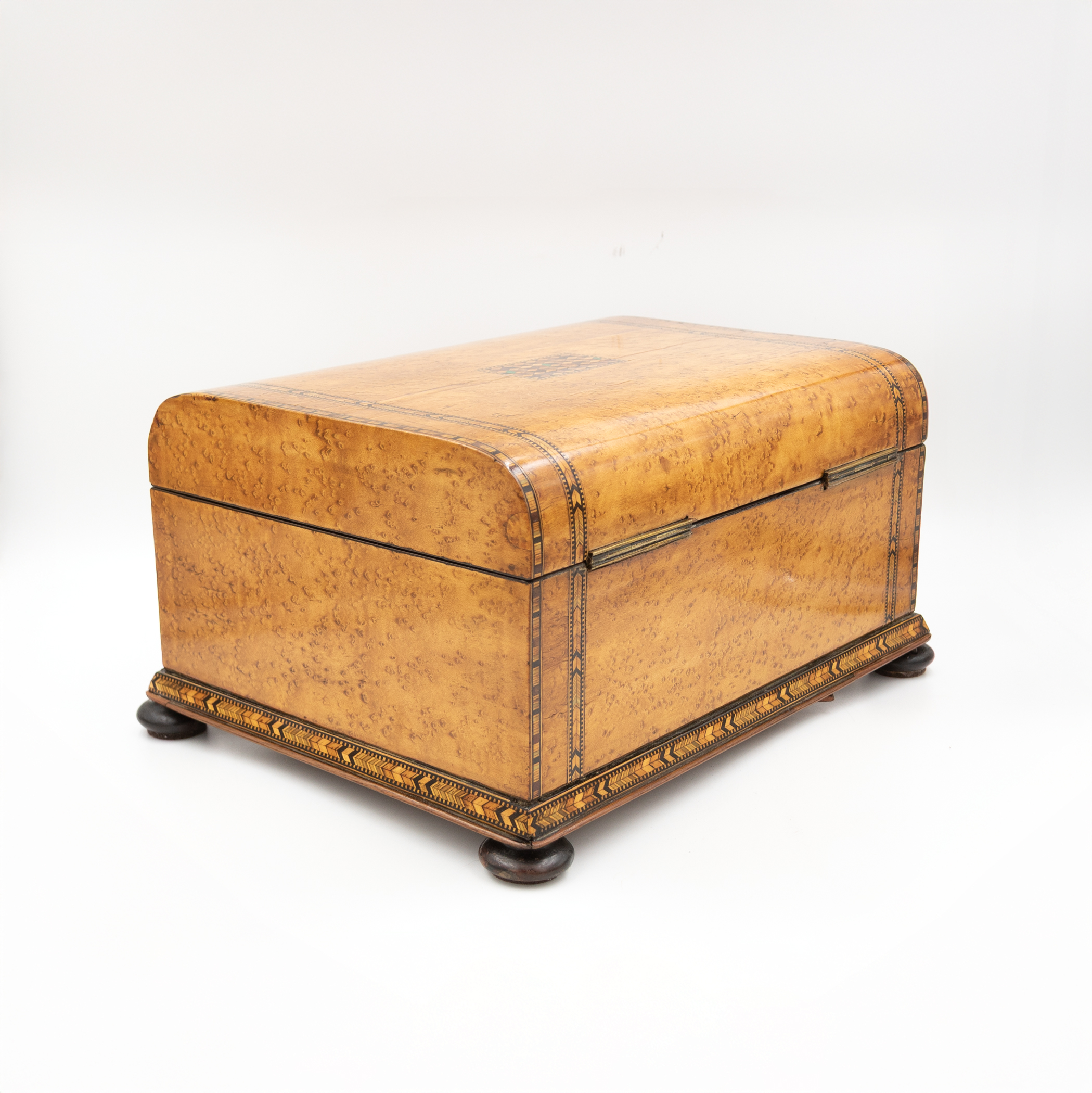 Bird’s-eye maple veneer box having a domed hinged lid centered by a rectangular panel of tumbling-block parquetry with green-stained accents, bordered by geometric Tunbridge ware banding. The fascia inset with a conforming parquetry escutcheon and banding. Opening to a crimson silk-lined interior, showing light wear and marks consistent with use. Underside with false bottom secured by rotating wooden cleats concealing a secret compartment. Raised on four compressed bun feet. Includes working lock and key. English Regency (George IV period), circa 1830.