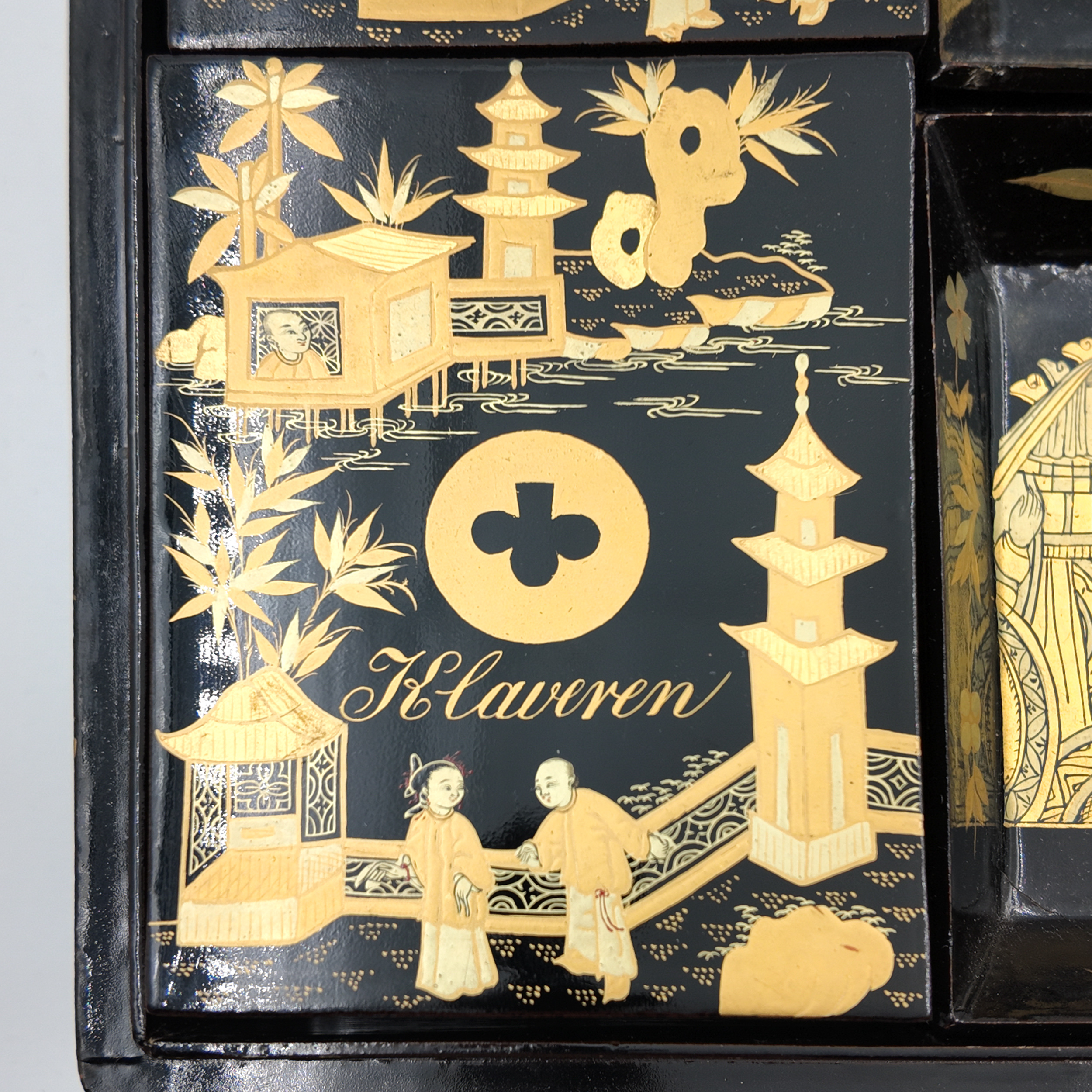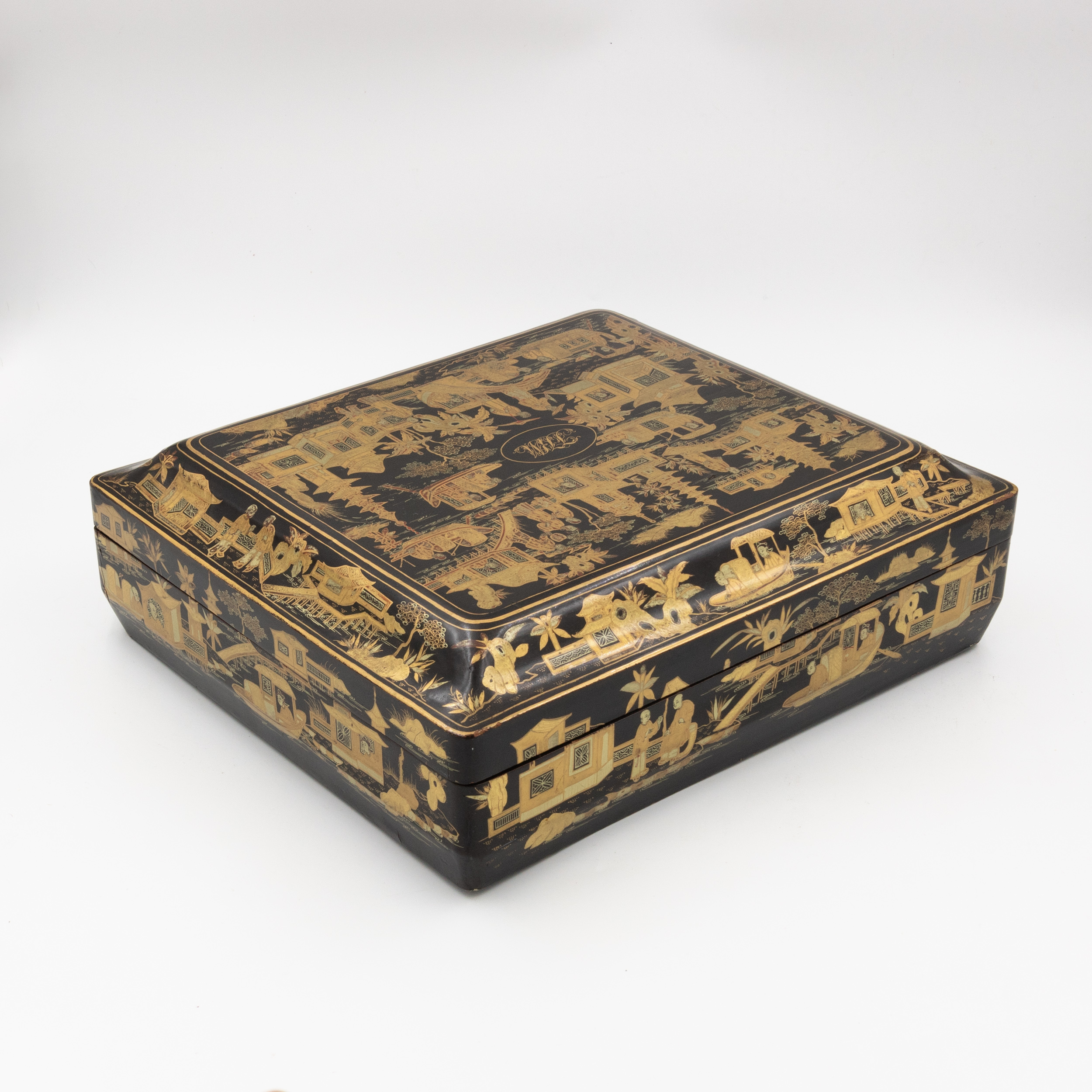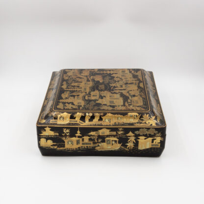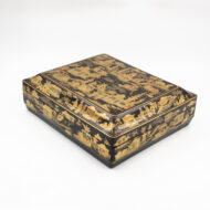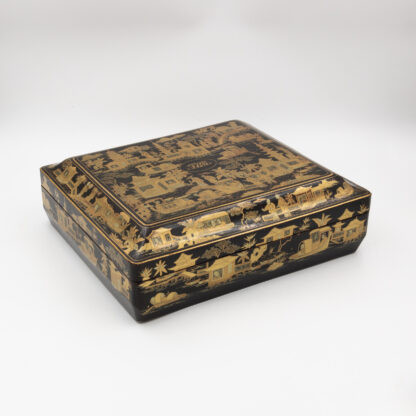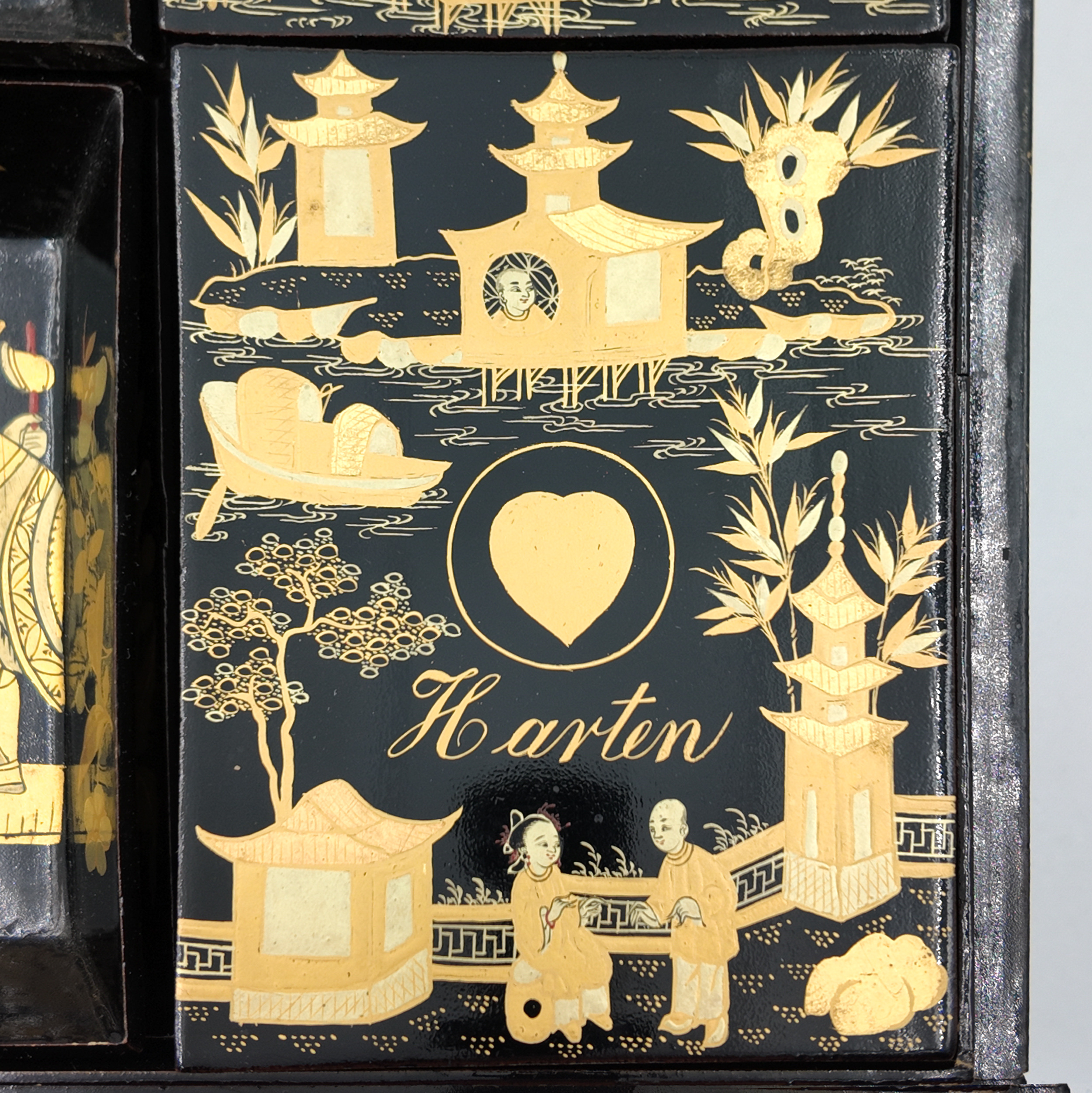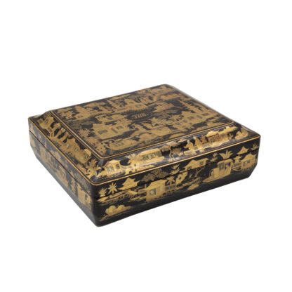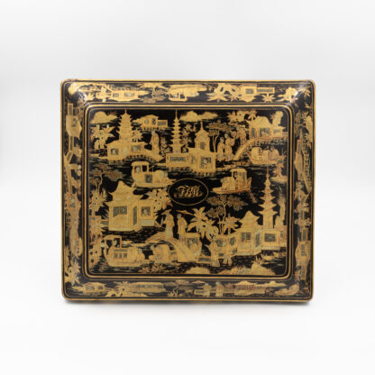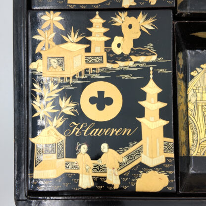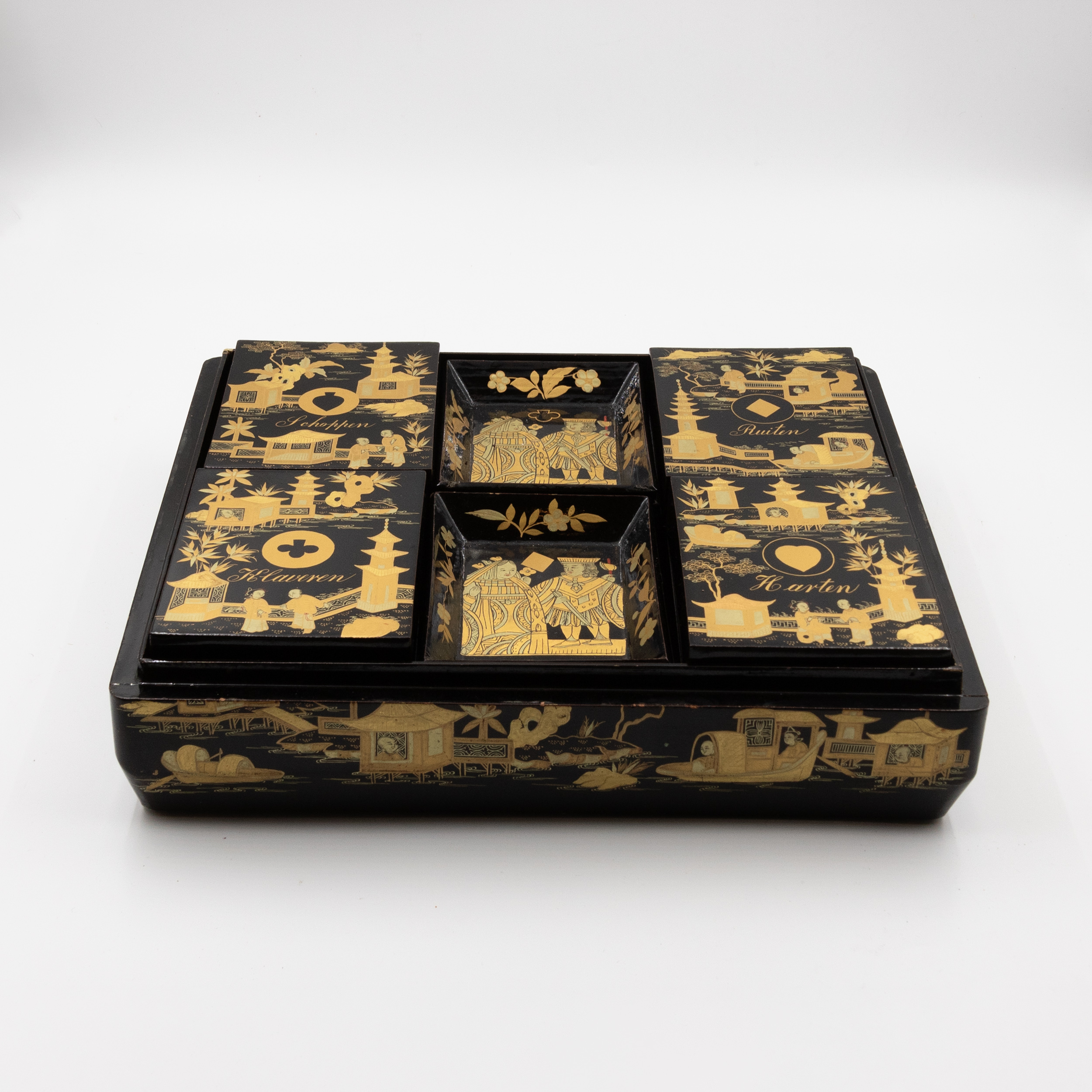 Chinese export gaming box made in the Canton region for the Dutch market, decorated in gold chinoiserie on black lacquer ground. The cushion-shaped top features a central medallion with monogram, surrounded by scenes of pagodas, boats, figures, and traditional Chinese architecture amid bamboo and flowering branches. The fitted interior contains four removable lidded compartments labeled in Dutch for card suits: Klaveren (Clubs), Schoppen (Spades), Ruiten (Diamonds), and Harten (Hearts). The box includes mother-of-pearl gaming tokens, engraved on one side with geometric borders and floral motifs surrounding the owner’s monogram, and on the reverse with a heraldic design featuring a knight’s helmet above a shield. This box is representative of the refined gaming culture of the late 19th century Dutch bourgeoisie, who would commission luxury items from Chinese craftsmen through the Canton trade system. The combination of Chinese export lacquerwork with European heraldry and card game elements is a wonderful example of the cross-cultural luxury goods trade of the period. Circa 1890