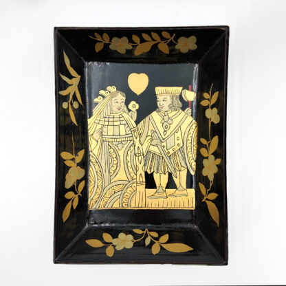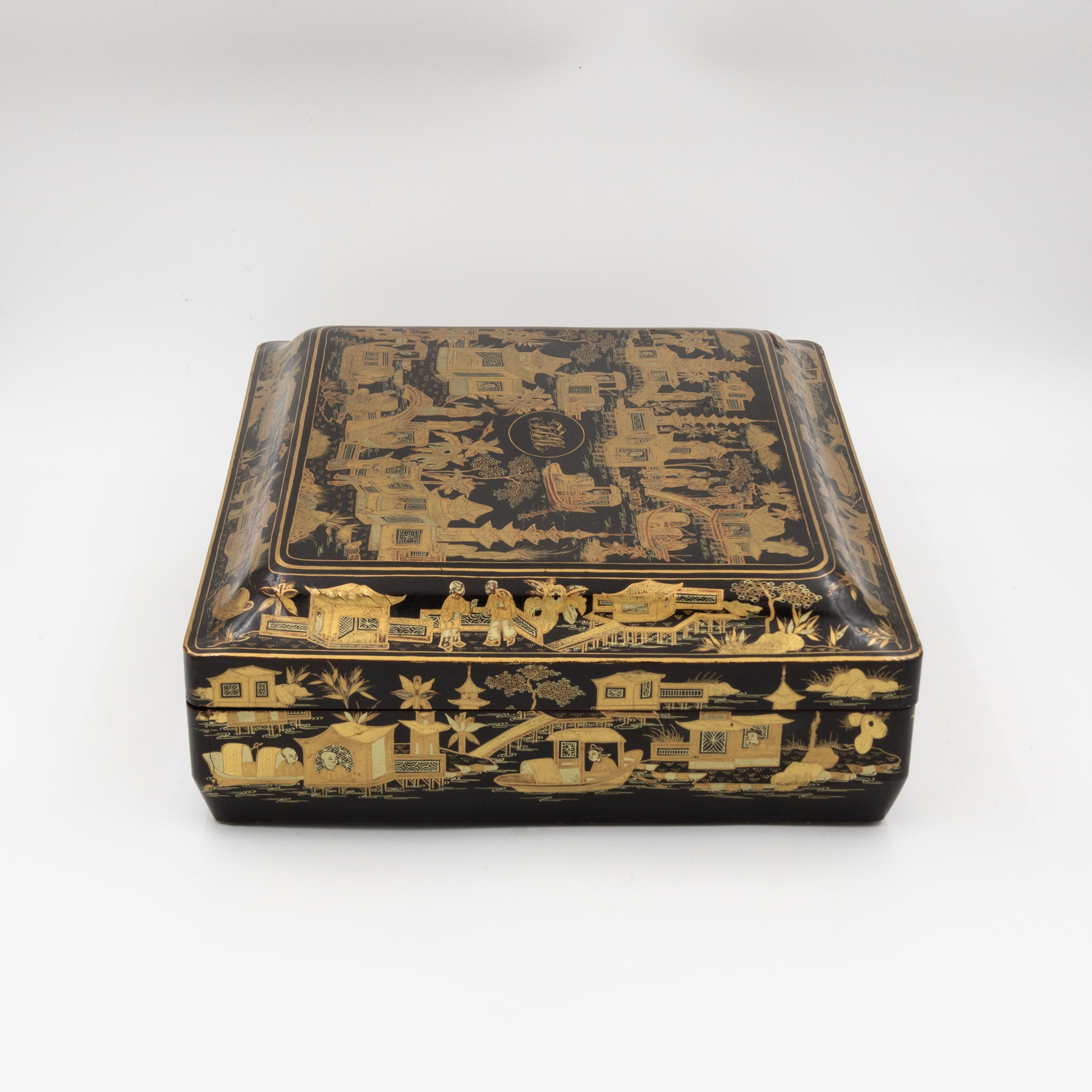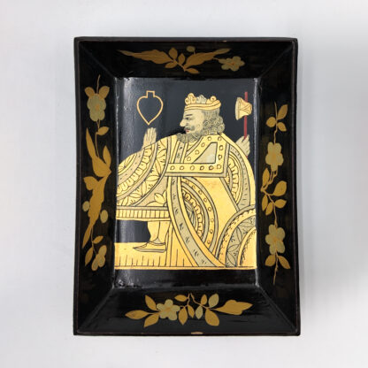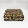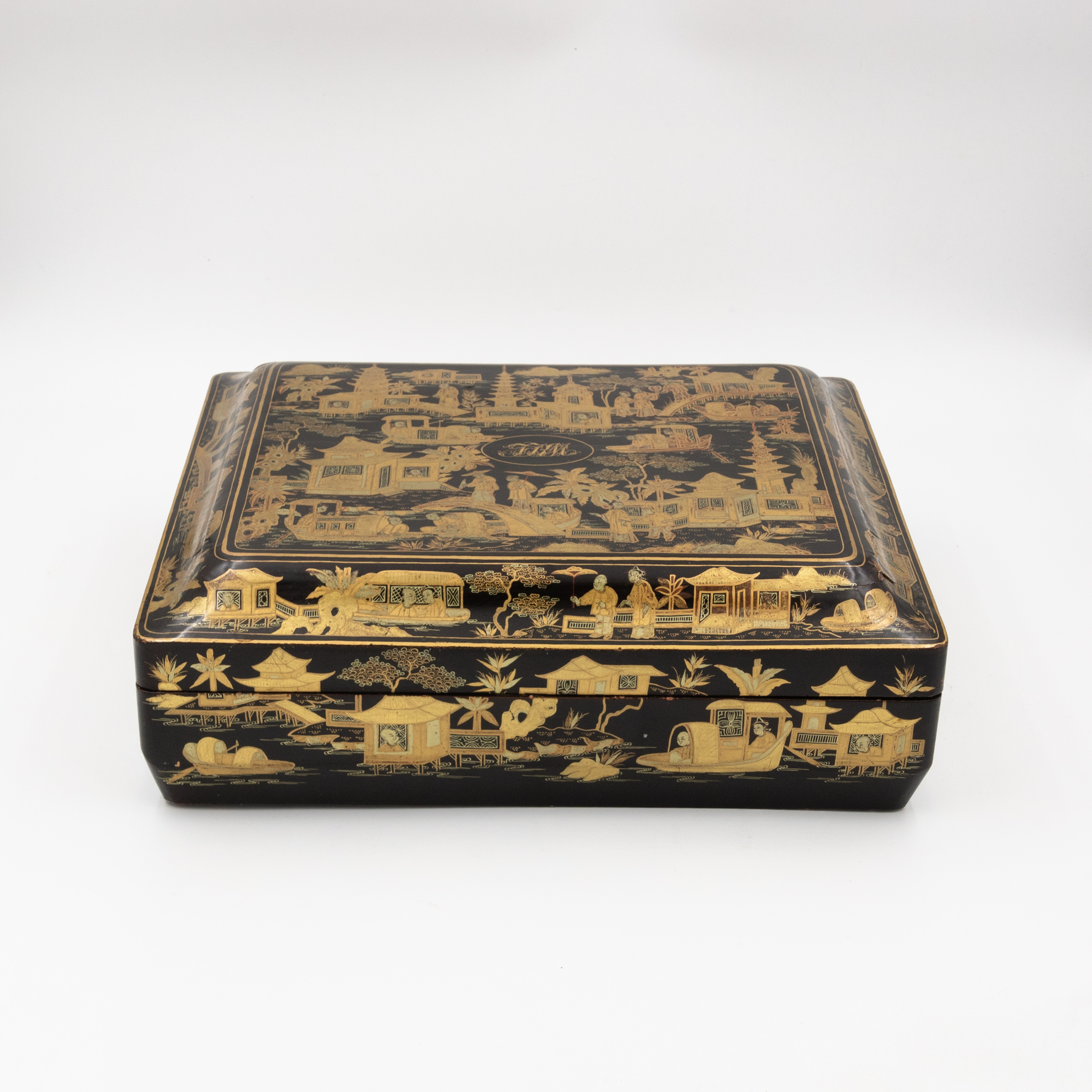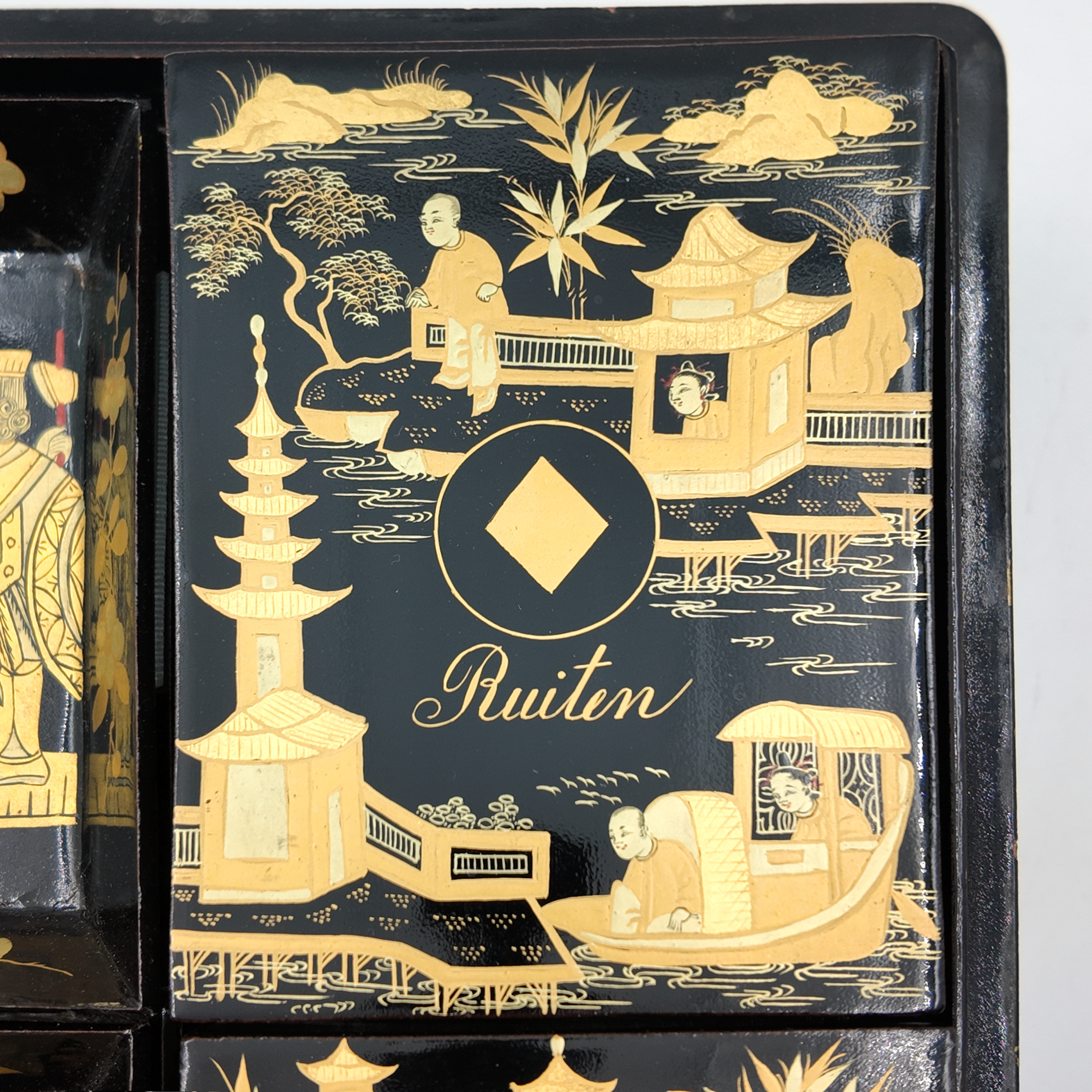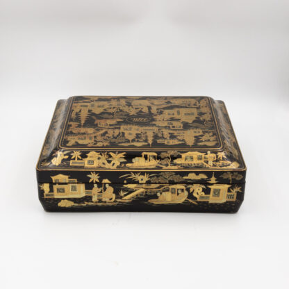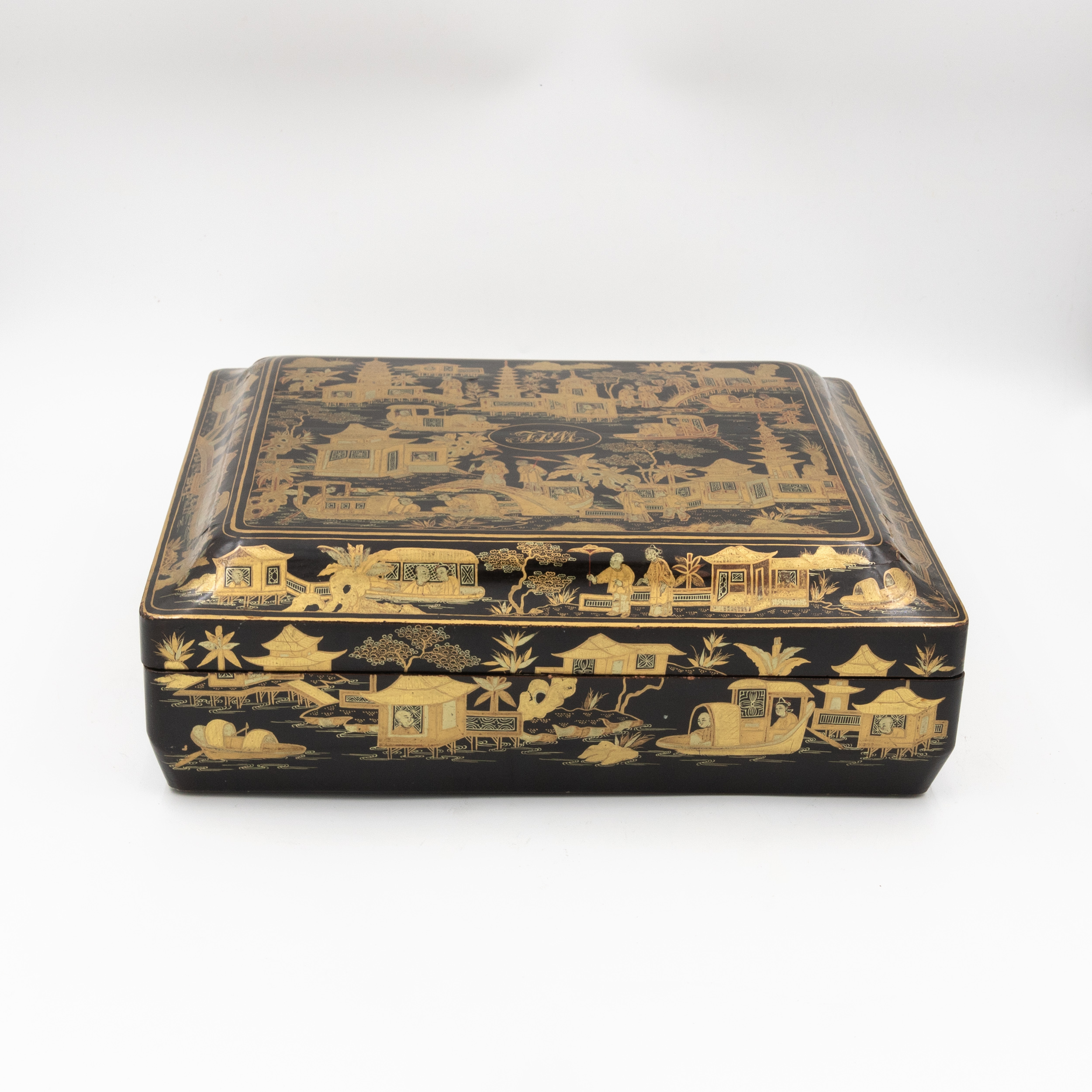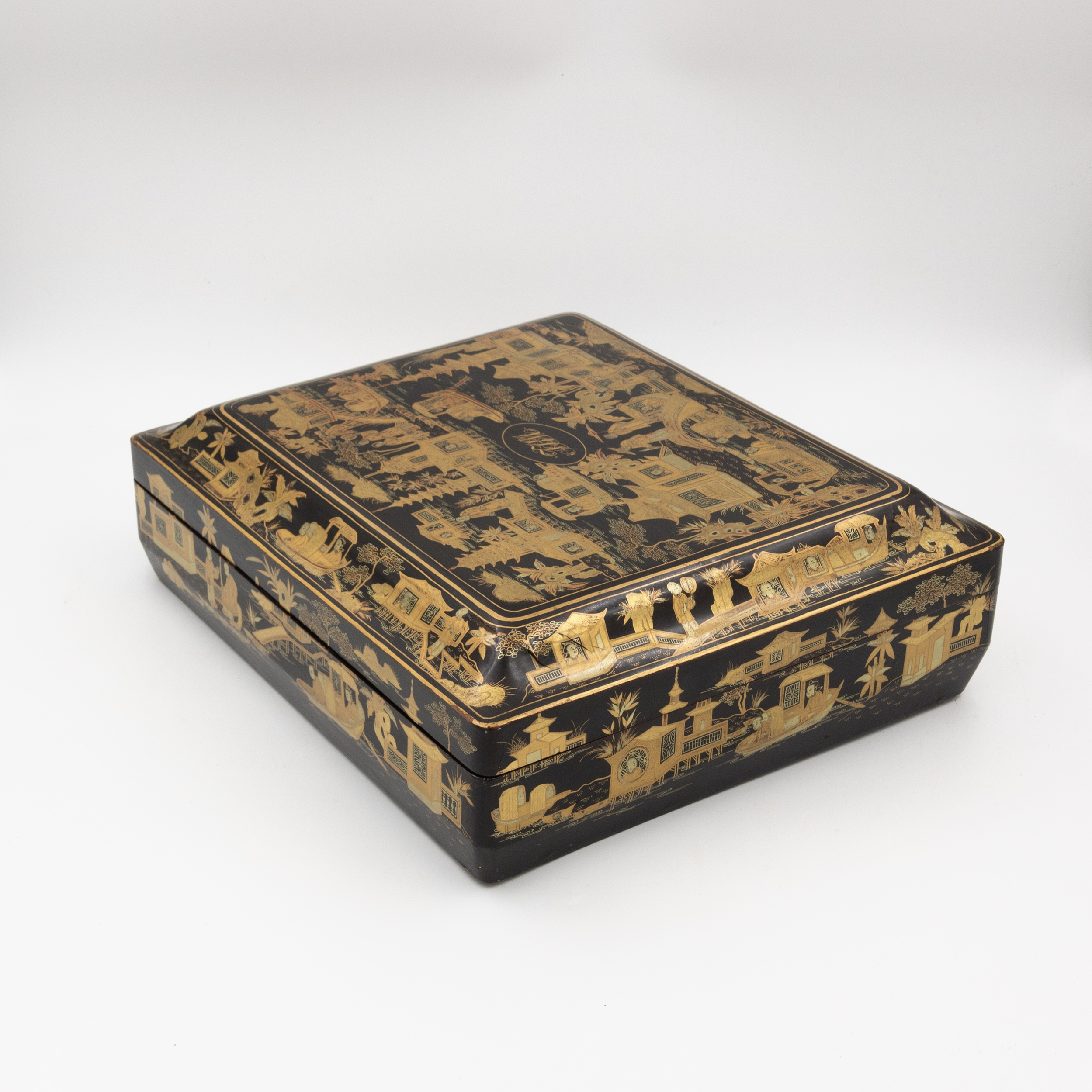 Chinese export gaming box made in the Canton region for the Dutch market, decorated in gold chinoiserie on black lacquer ground. The cushion-shaped top features a central medallion with monogram, surrounded by scenes of pagodas, boats, figures, and traditional Chinese architecture amid bamboo and flowering branches. The fitted interior contains four removable lidded compartments labeled in Dutch for card suits: Klaveren (Clubs), Schoppen (Spades), Ruiten (Diamonds), and Harten (Hearts). The box includes mother-of-pearl gaming tokens, engraved on one side with geometric borders and floral motifs surrounding the owner’s monogram, and on the reverse with a heraldic design featuring a knight’s helmet above a shield. This box is representative of the refined gaming culture of the late 19th century Dutch bourgeoisie, who would commission luxury items from Chinese craftsmen through the Canton trade system. The combination of Chinese export lacquerwork with European heraldry and card game elements is a wonderful example of the cross-cultural luxury goods trade of the period. Circa 1890