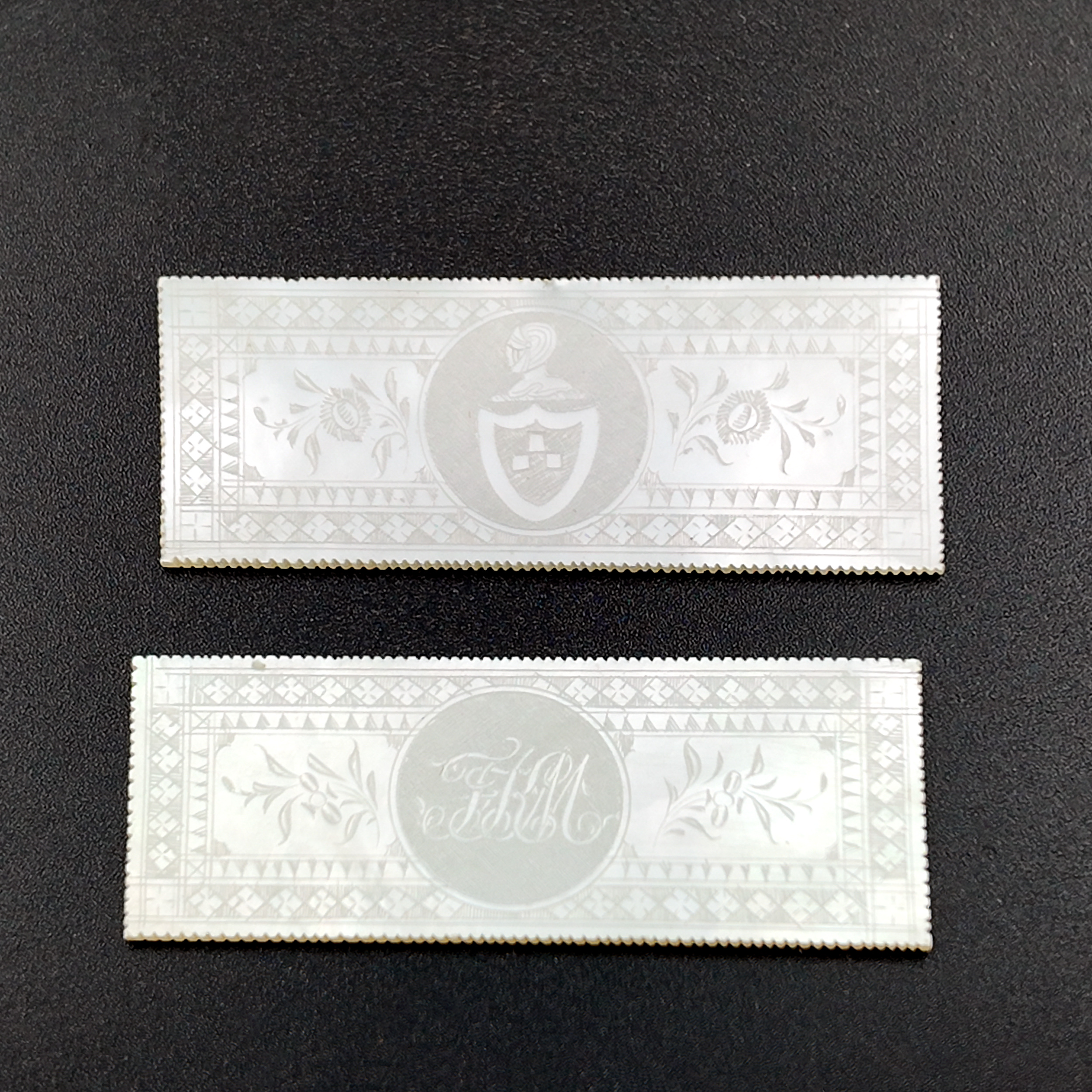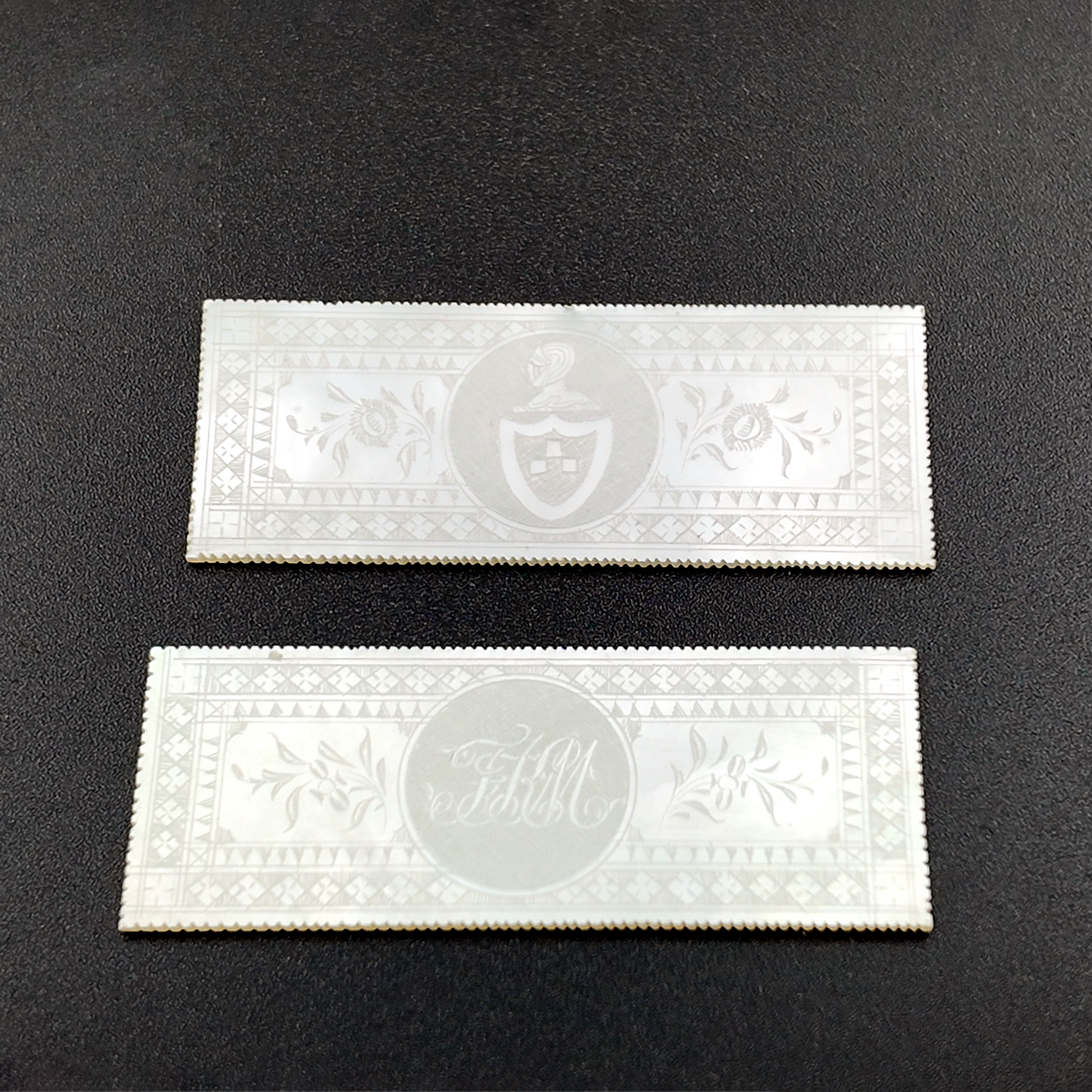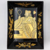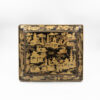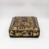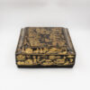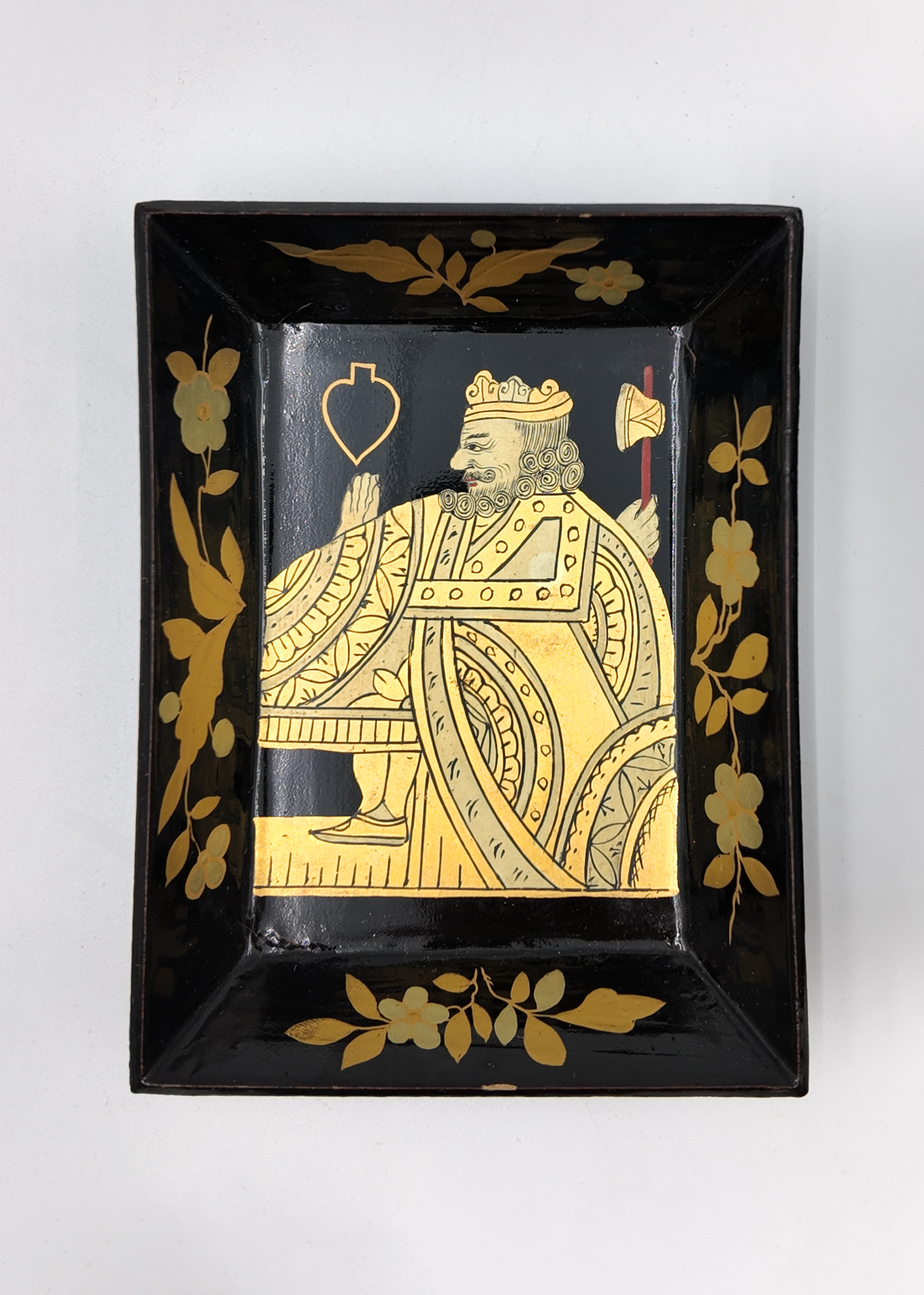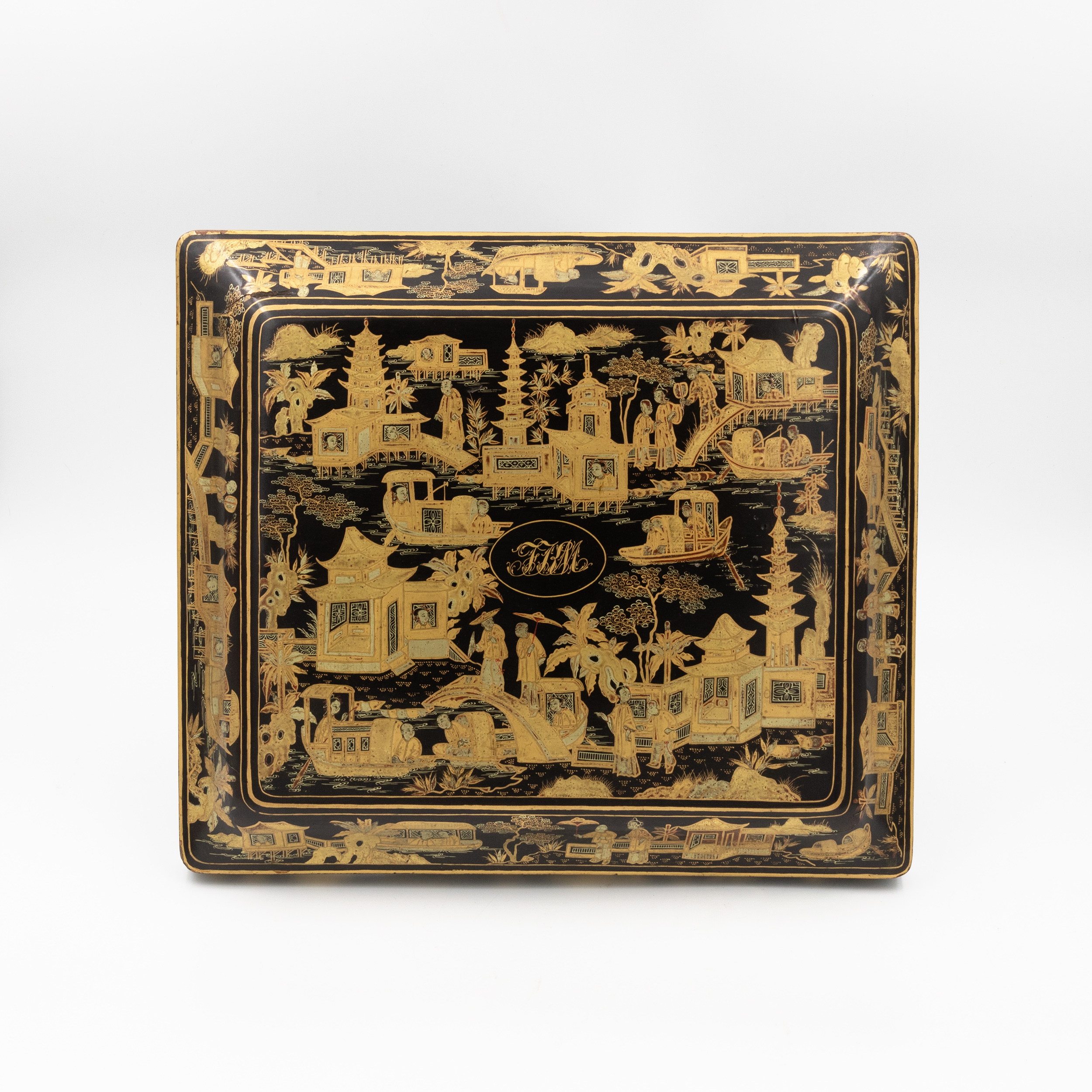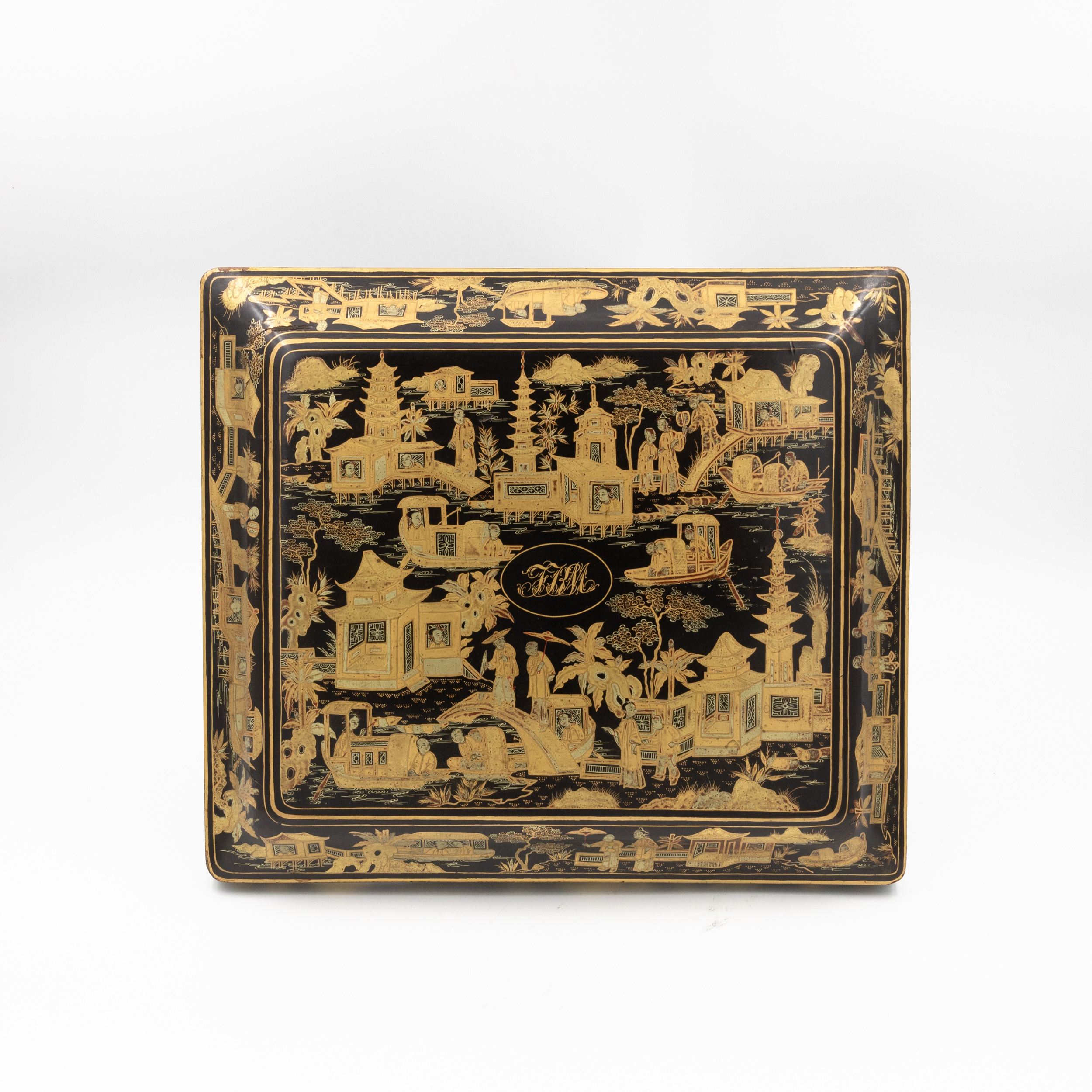 Chinese export gaming box made in the Canton region for the Dutch market, decorated in gold chinoiserie on black lacquer ground. The cushion-shaped top features a central medallion with monogram, surrounded by scenes of pagodas, boats, figures, and traditional Chinese architecture amid bamboo and flowering branches. The fitted interior contains four removable lidded compartments labeled in Dutch for card suits: Klaveren (Clubs), Schoppen (Spades), Ruiten (Diamonds), and Harten (Hearts). The box includes mother-of-pearl gaming tokens, engraved on one side with geometric borders and floral motifs surrounding the owner’s monogram, and on the reverse with a heraldic design featuring a knight’s helmet above a shield. This box is representative of the refined gaming culture of the late 19th century Dutch bourgeoisie, who would commission luxury items from Chinese craftsmen through the Canton trade system. The combination of Chinese export lacquerwork with European heraldry and card game elements is a wonderful example of the cross-cultural luxury goods trade of the period. Circa 1890