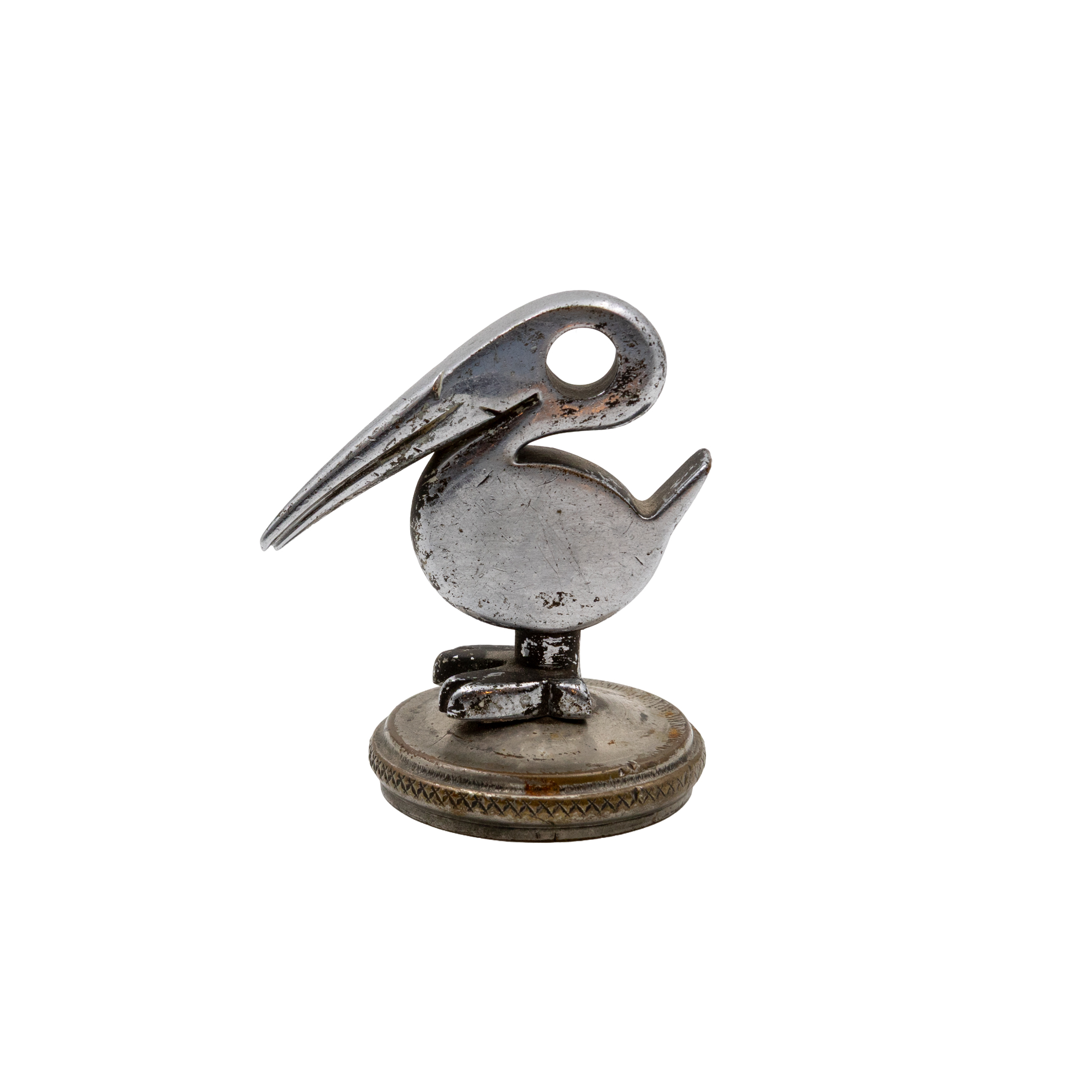 Chrome plated car mascot depicting a pelican, mounted on a radiator cap. Circa 1930.