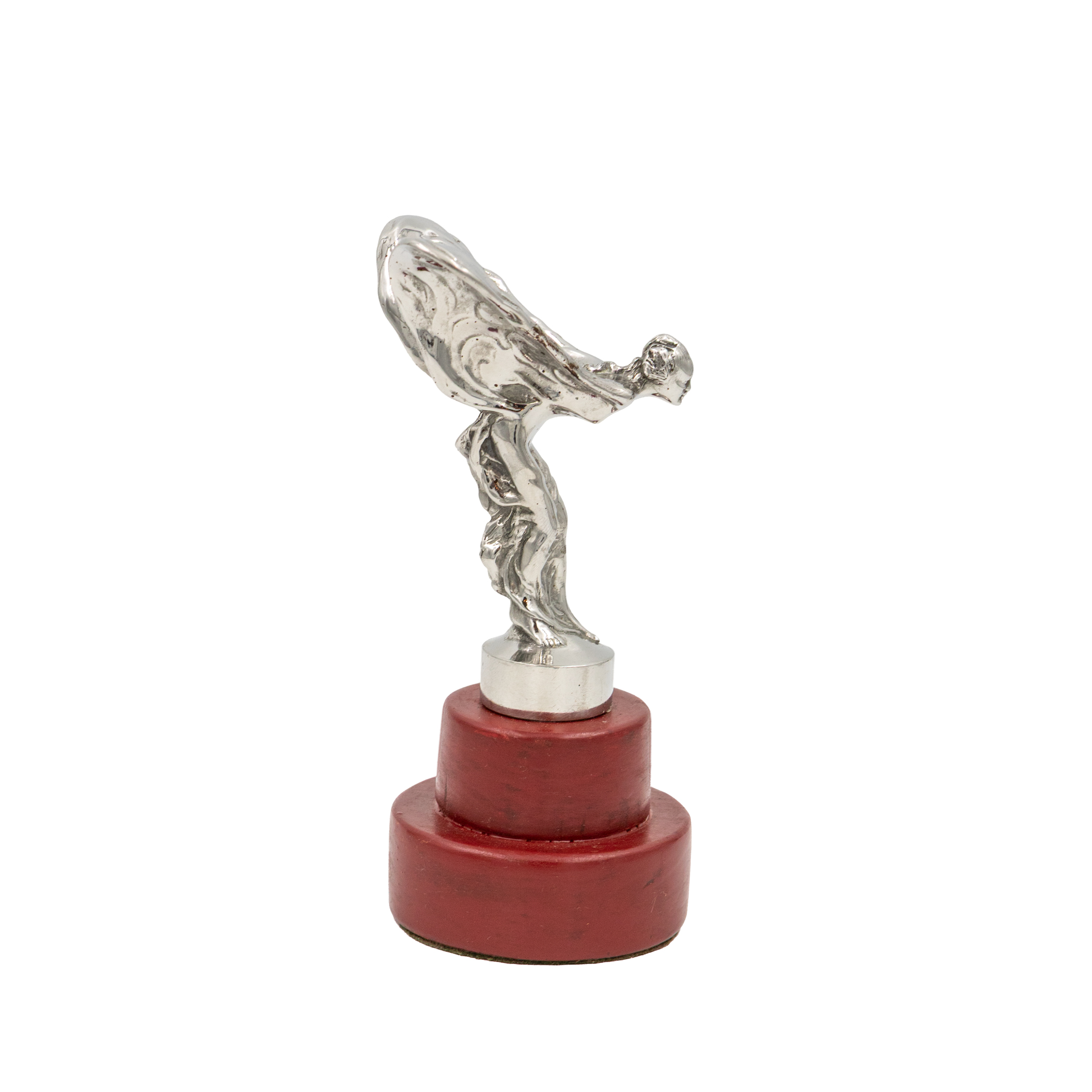 Chrome plated car mascot of the Spirit of Ecstasy from Rolls Royce, designed by Charles Sykes. The figure of a woman leaning gracefully forward with robes swept back as wings, mounted on a stepped red lacquered base. Circa 1940.