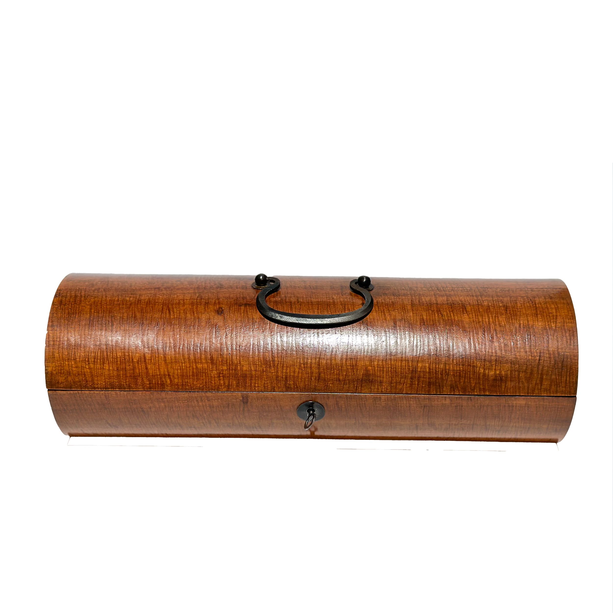 Cylindrical box following the tradition of fine English personal boxes [1. Reference: For historical context of fine English boxes of this period, see Clarke, A., & O'Kelly, J. (2003). Antique Boxes, Tea Caddies, & Society 1700-1880. Atglen, PA: Schiffer Publishing, p. 245. ]. Solid satinwood construction with figured grain, cast iron carry handle, and working lock with key. Black felt-lined interior compartment. Brass hinges. The box rests upon a flattened ebonized base. Period boxes of this form were crafted for the luxury market, often used for storing gloves or personal items. English, circa 1900 height: 4 in. (10 cm.)