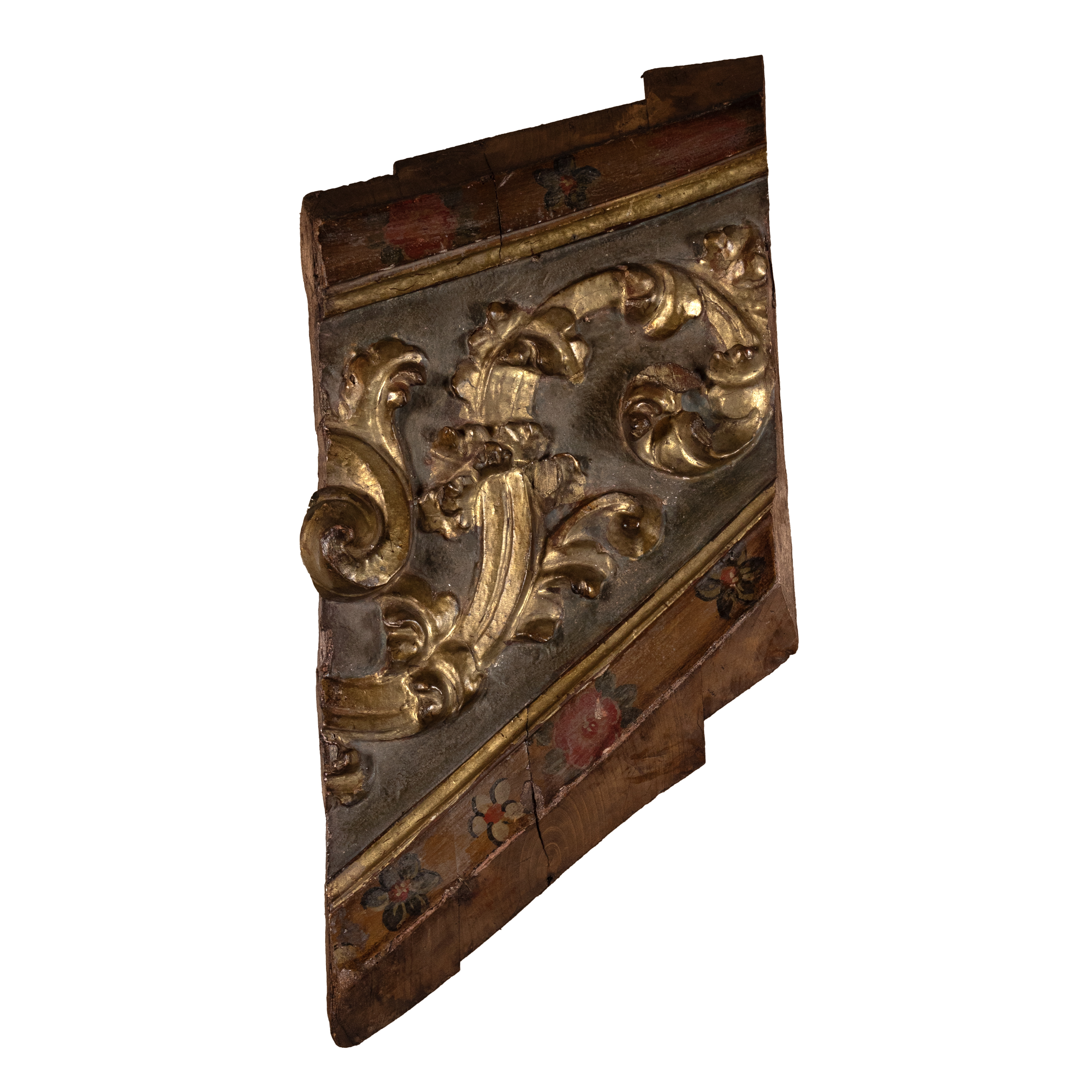 An early 18th-century Spanish architectural element with carved giltwood scrolling acanthus set against a green ground; red faux marble frame with painted floral and gilt detail; with rich patina and evident age. Circa 1700. height: 32 in. (81 cm), width: 21 in. (53 cm), depth: 8 in. (20 cm)