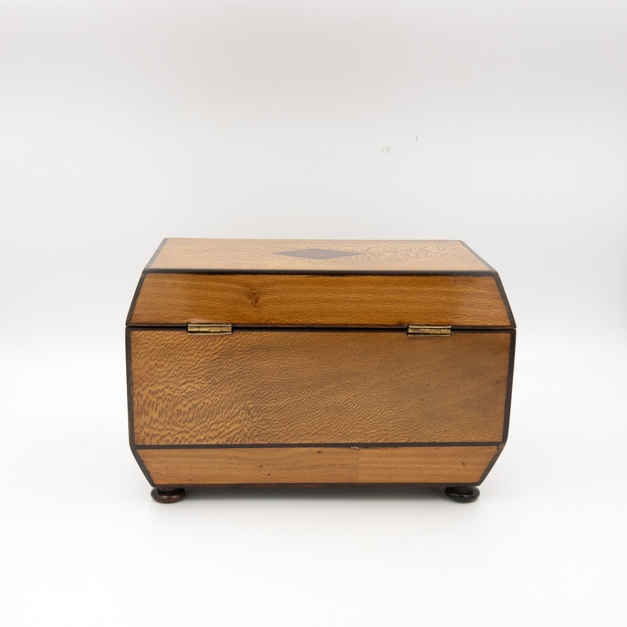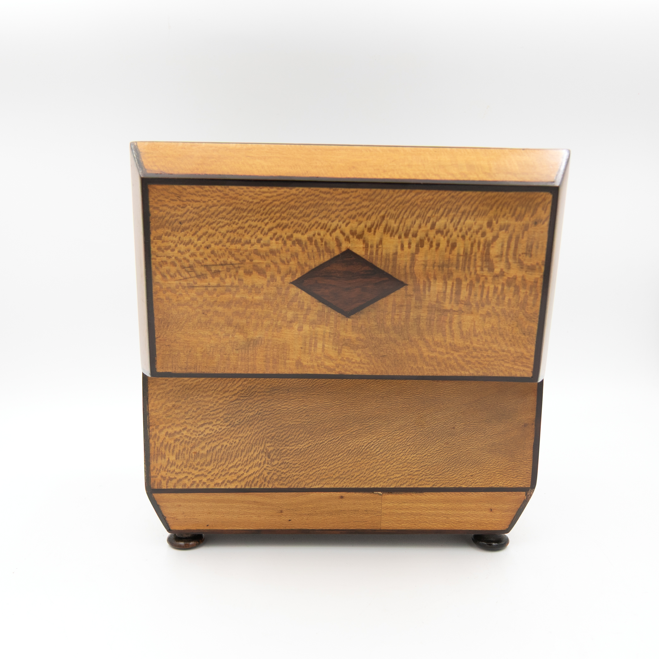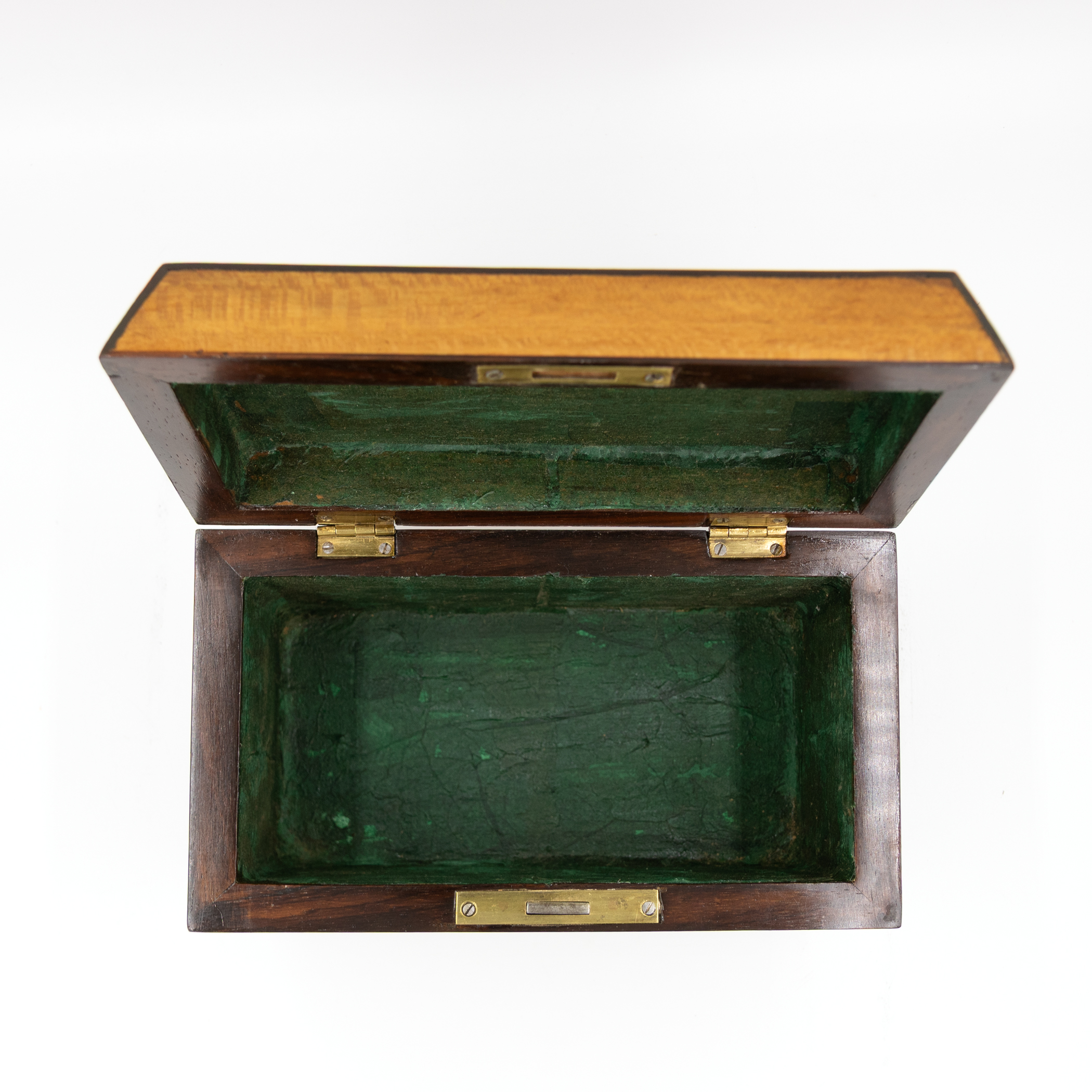 Solid lacewood box with rosewood edging and diamond-shaped rosewood inlay centered on the canted top. Recessed brass campaign handles mounted on each end. The lacewood displays pronounced figure with distinctive mottled patterning across all surfaces. Rosewood banding outlines the edges of both the body and lid. Interior lined with green paper, now worn, retaining original character. Working lock with diamond-shaped escutcheon and key. Compressed turned bun feet in ebonized wood. French-polished finish enhancing the depth and chatoyancy of the lacewood grain. English circa 1820