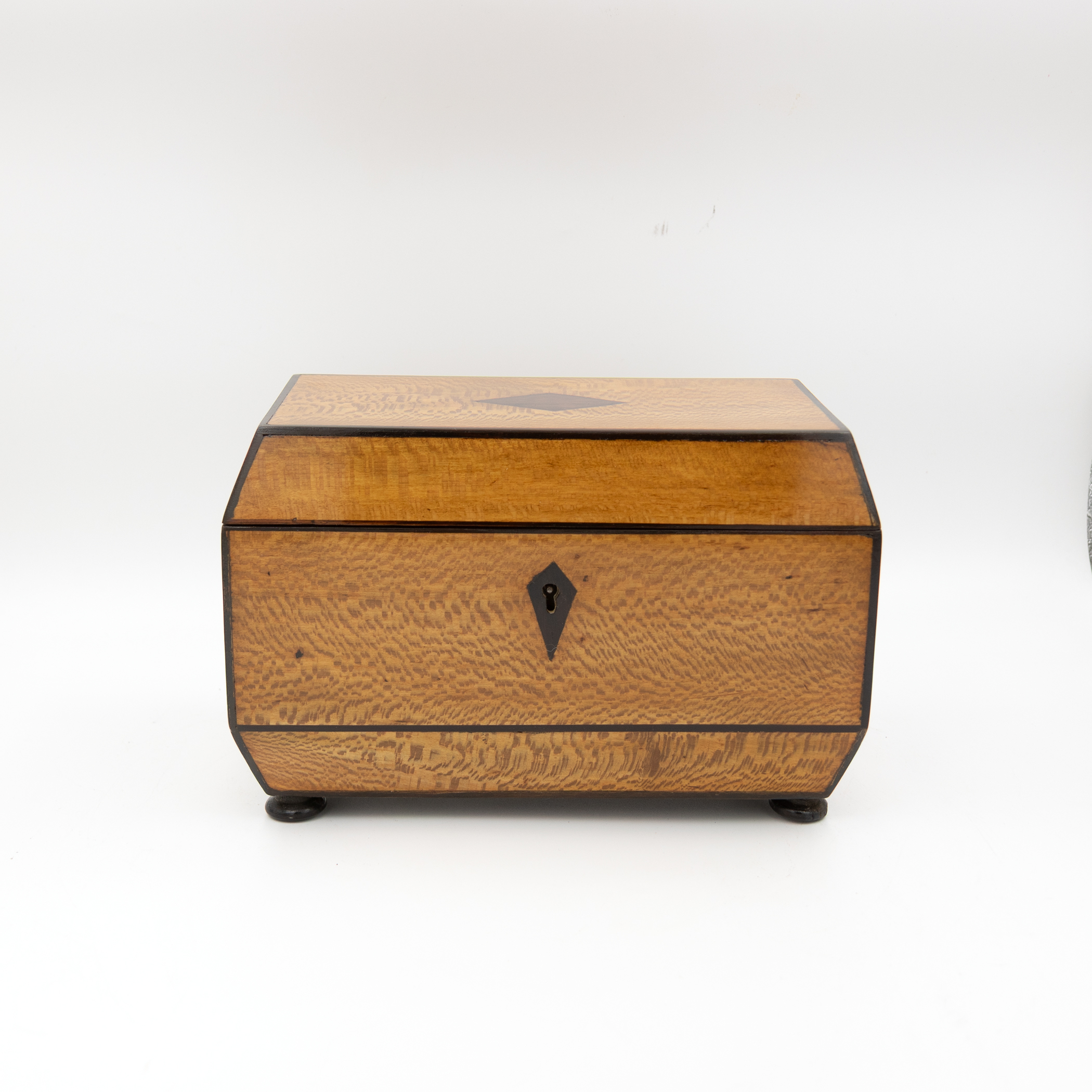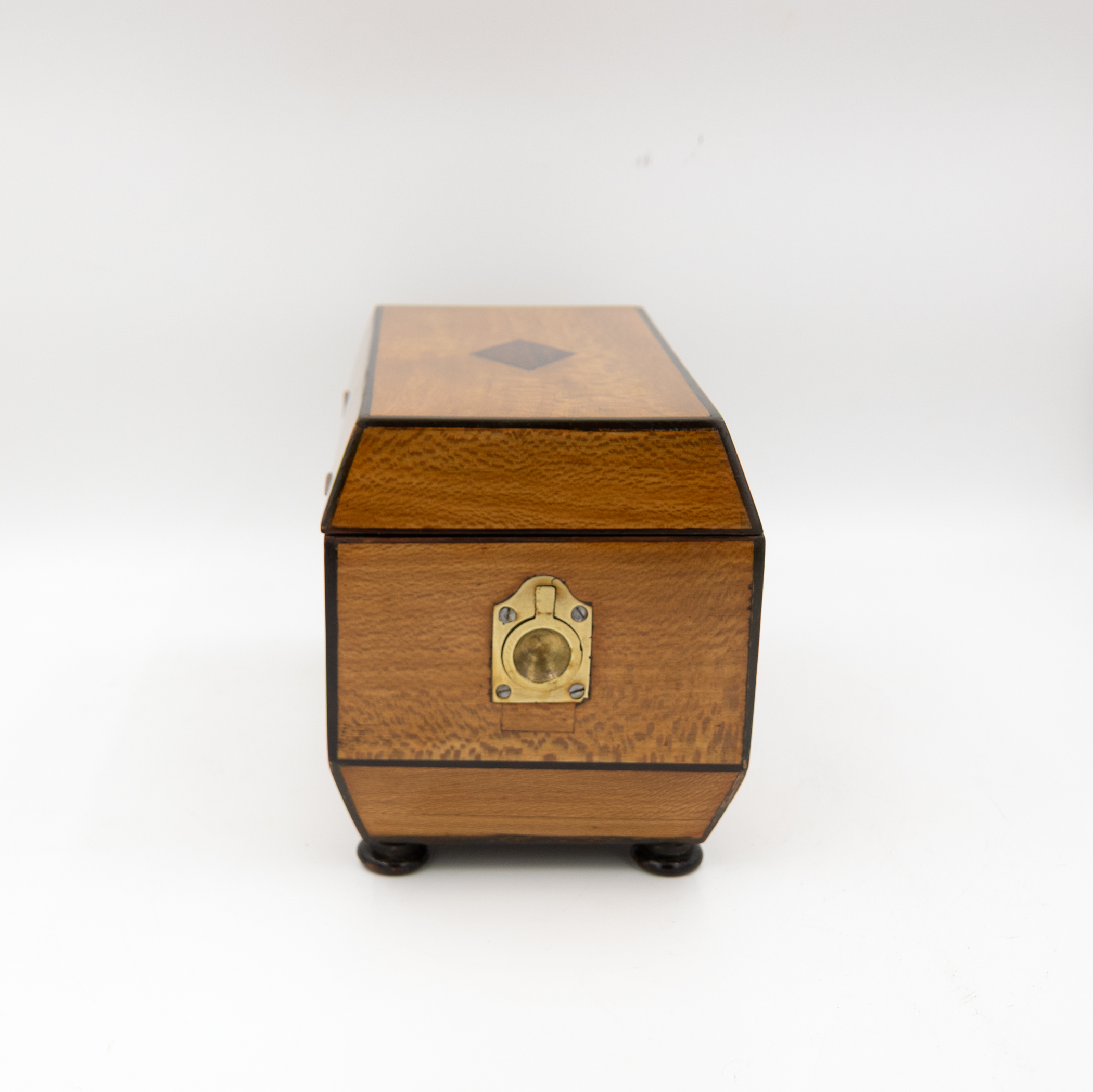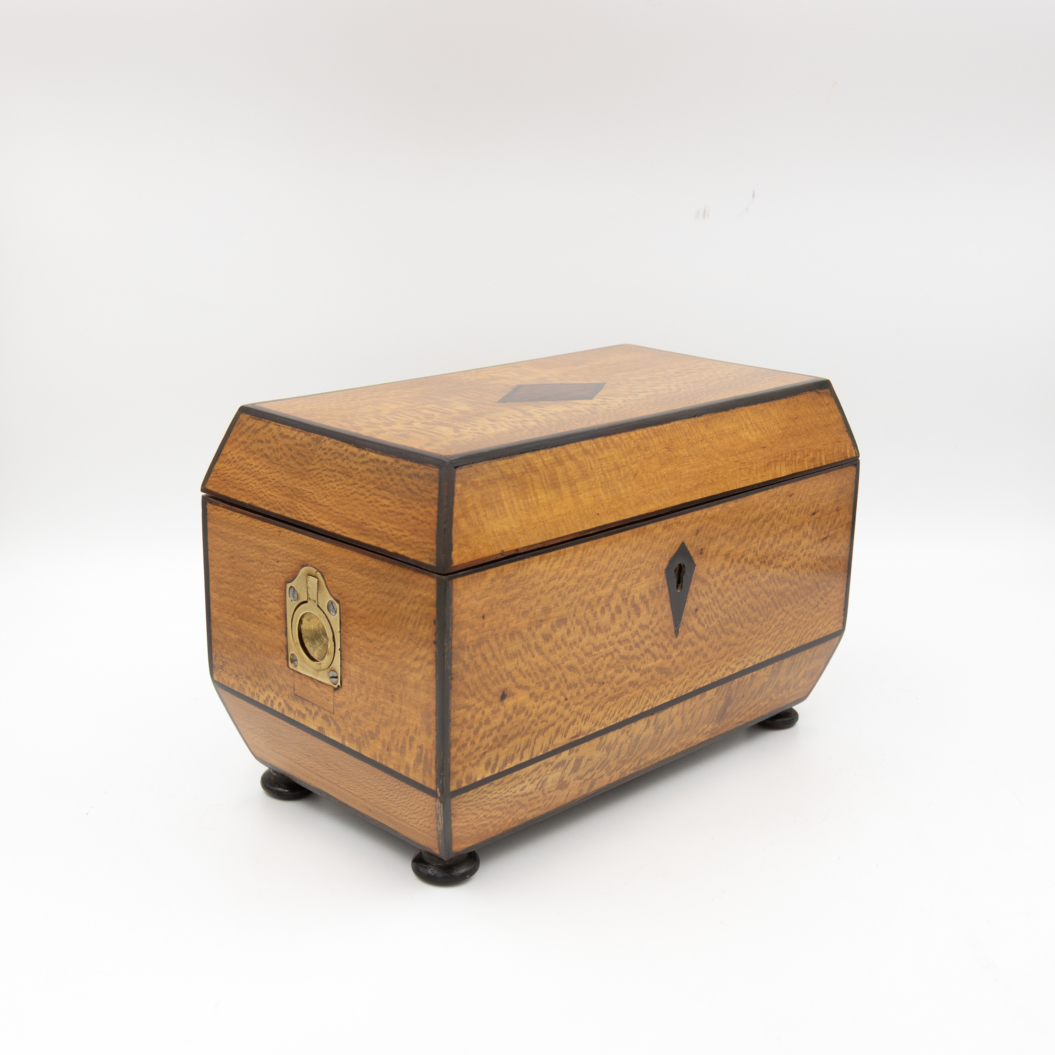 Solid lacewood box with rosewood edging and diamond-shaped rosewood inlay centered on the canted top. Recessed brass campaign handles mounted on each end. The lacewood displays pronounced figure with distinctive mottled patterning across all surfaces. Rosewood banding outlines the edges of both the body and lid. Interior lined with green paper, now worn, retaining original character. Working lock with diamond-shaped escutcheon and key. Compressed turned bun feet in ebonized wood. French-polished finish enhancing the depth and chatoyancy of the lacewood grain. English circa 1820