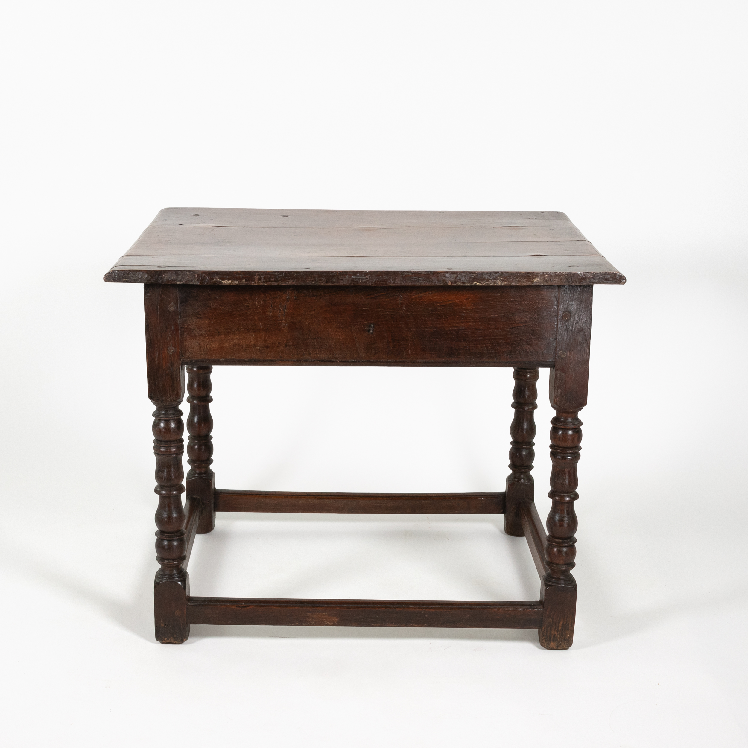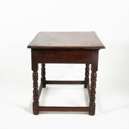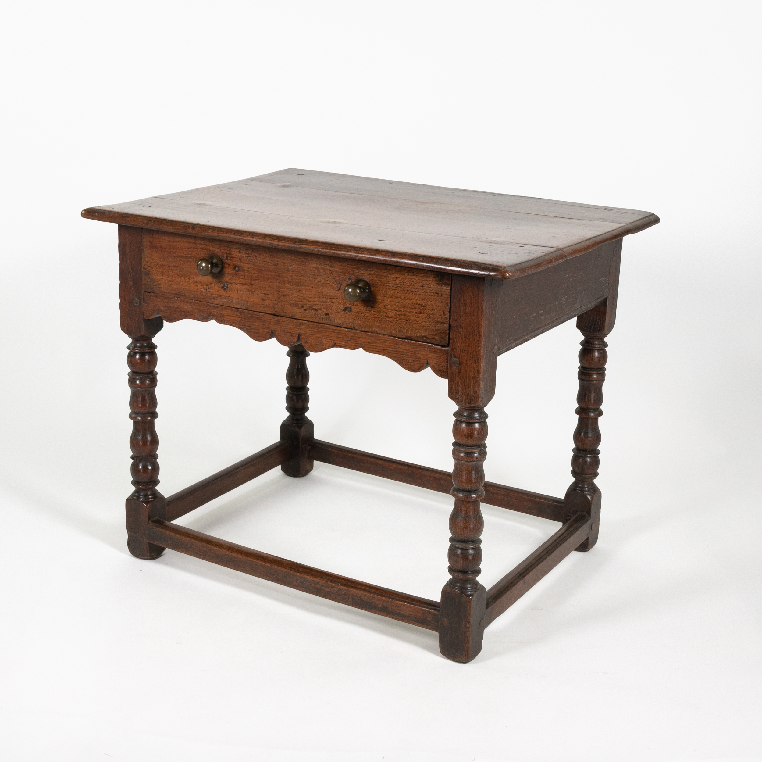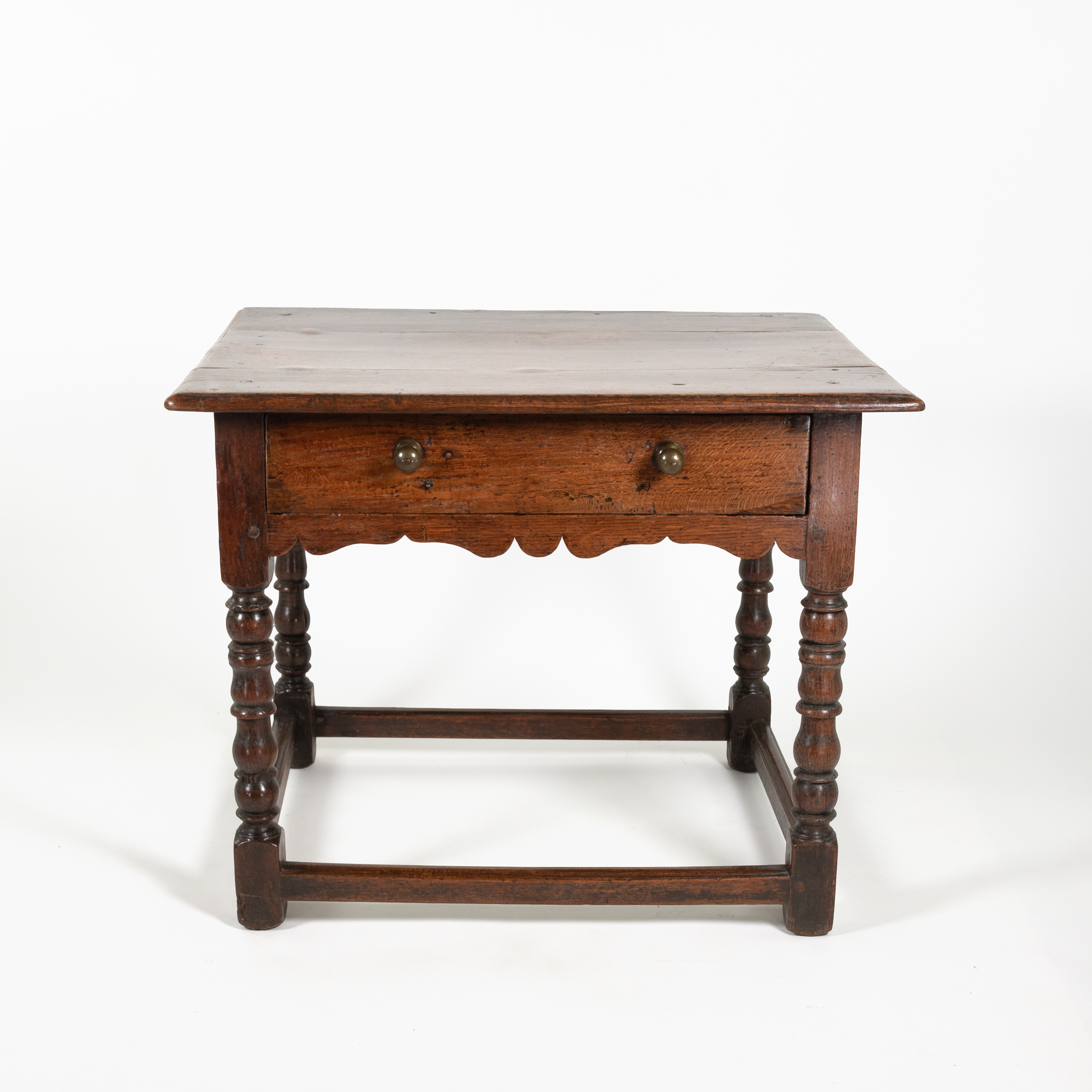 17th-century English oak side table with a single drawer and shaped apron. The drawer front with a pair of wooden knobs and a scalloped front apron. The oak surfaces show variation and wear consistent with prolonged use. Supported on four baluster-turned legs with alternating ring and vase elements, terminating in squared blocks and joined by plain box stretchers. The three-board plank top, with molded edges and overhang, displays a well-developed patina. Traditional mortise and tenon joinery is secured with exposed wooden pegs throughout the base. English, circa 1680.