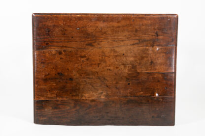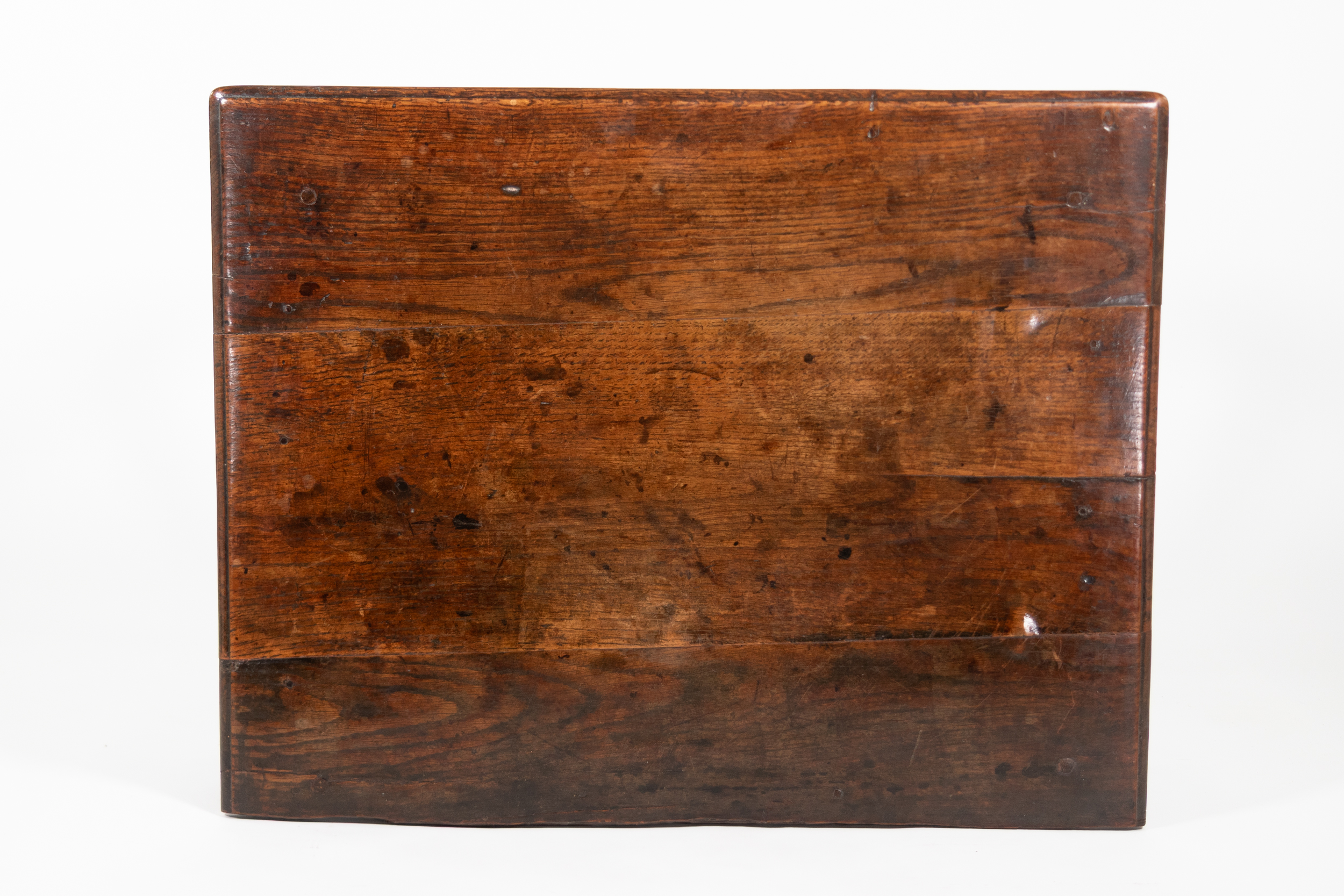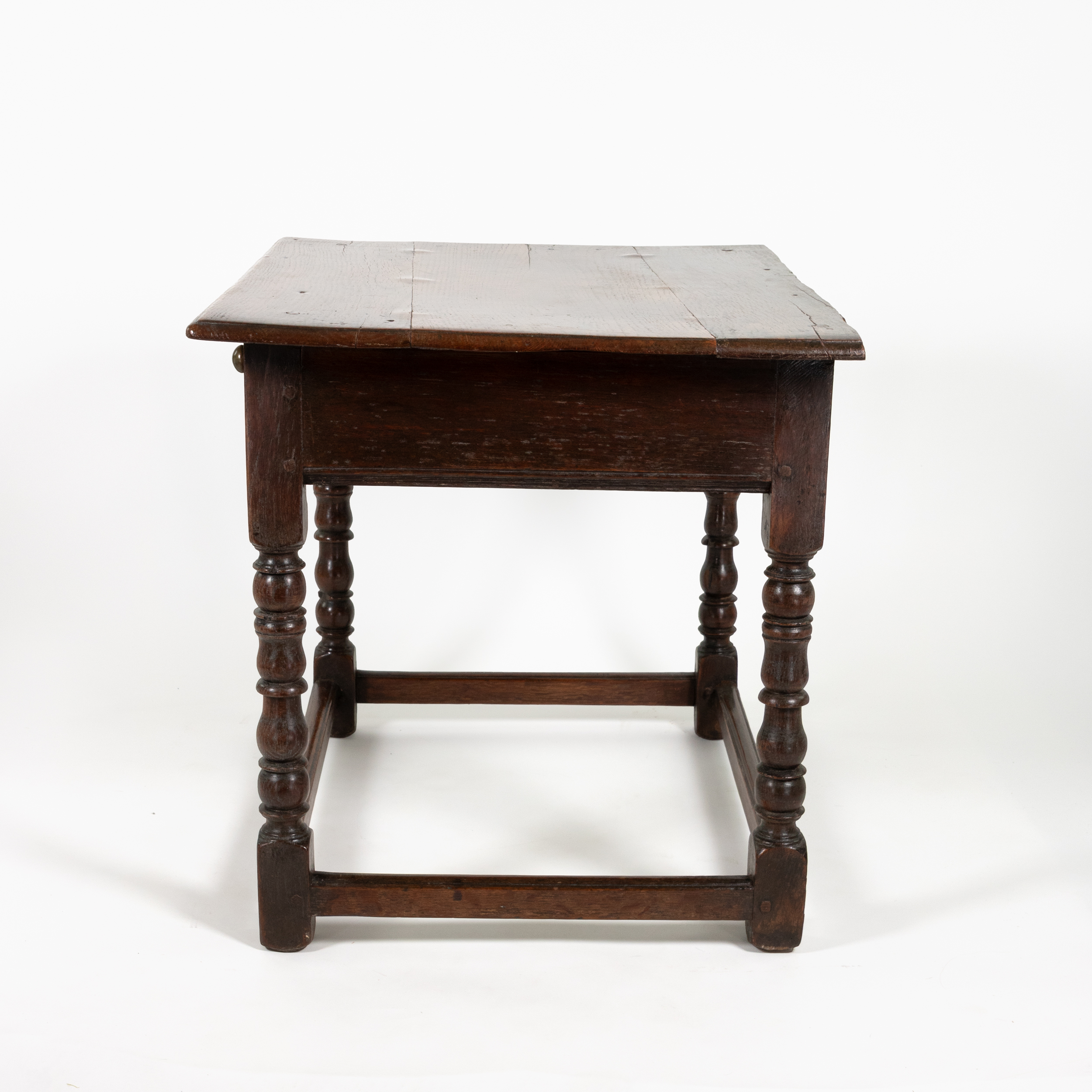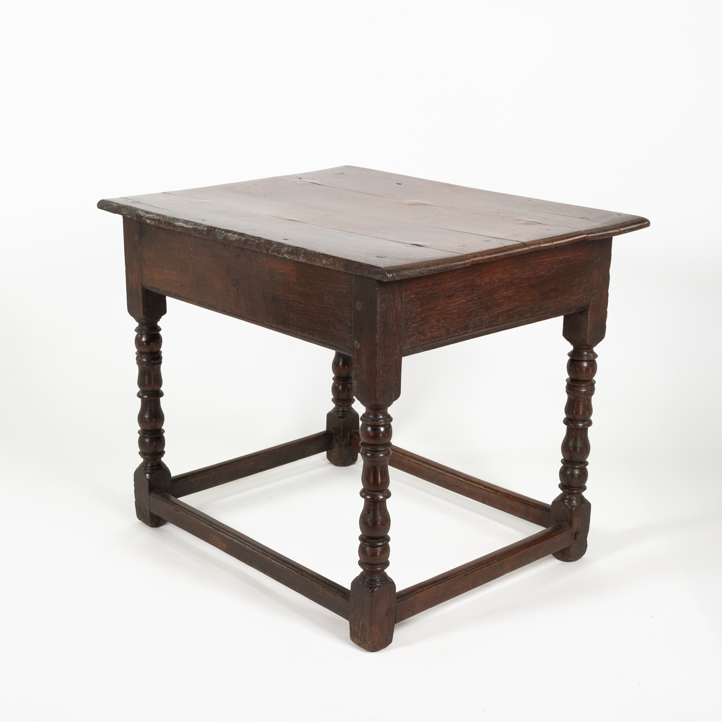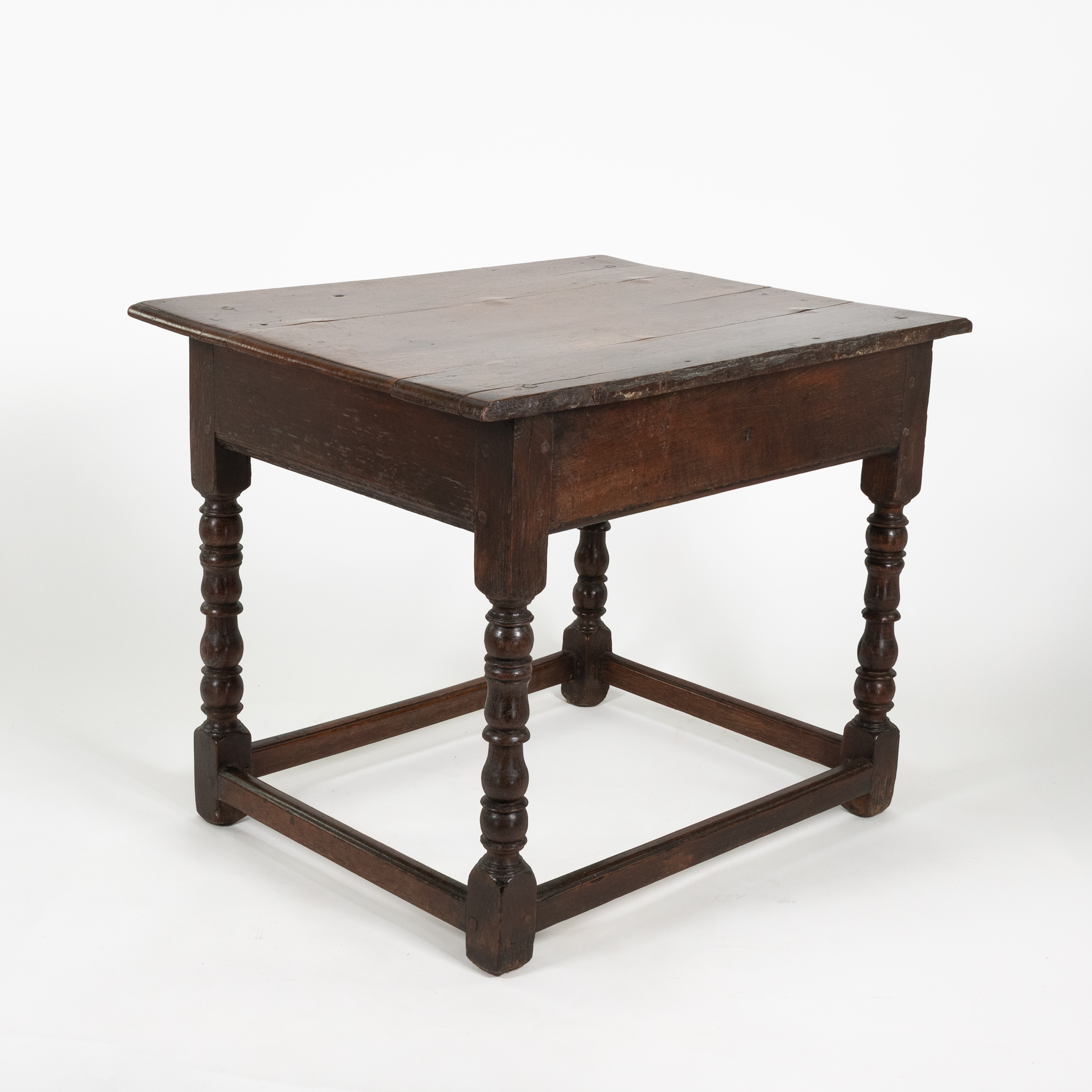 17th-century English oak side table with a single drawer and shaped apron. The drawer front with a pair of wooden knobs and a scalloped front apron. The oak surfaces show variation and wear consistent with prolonged use. Supported on four baluster-turned legs with alternating ring and vase elements, terminating in squared blocks and joined by plain box stretchers. The three-board plank top, with molded edges and overhang, displays a well-developed patina. Traditional mortise and tenon joinery is secured with exposed wooden pegs throughout the base. English, circa 1680.