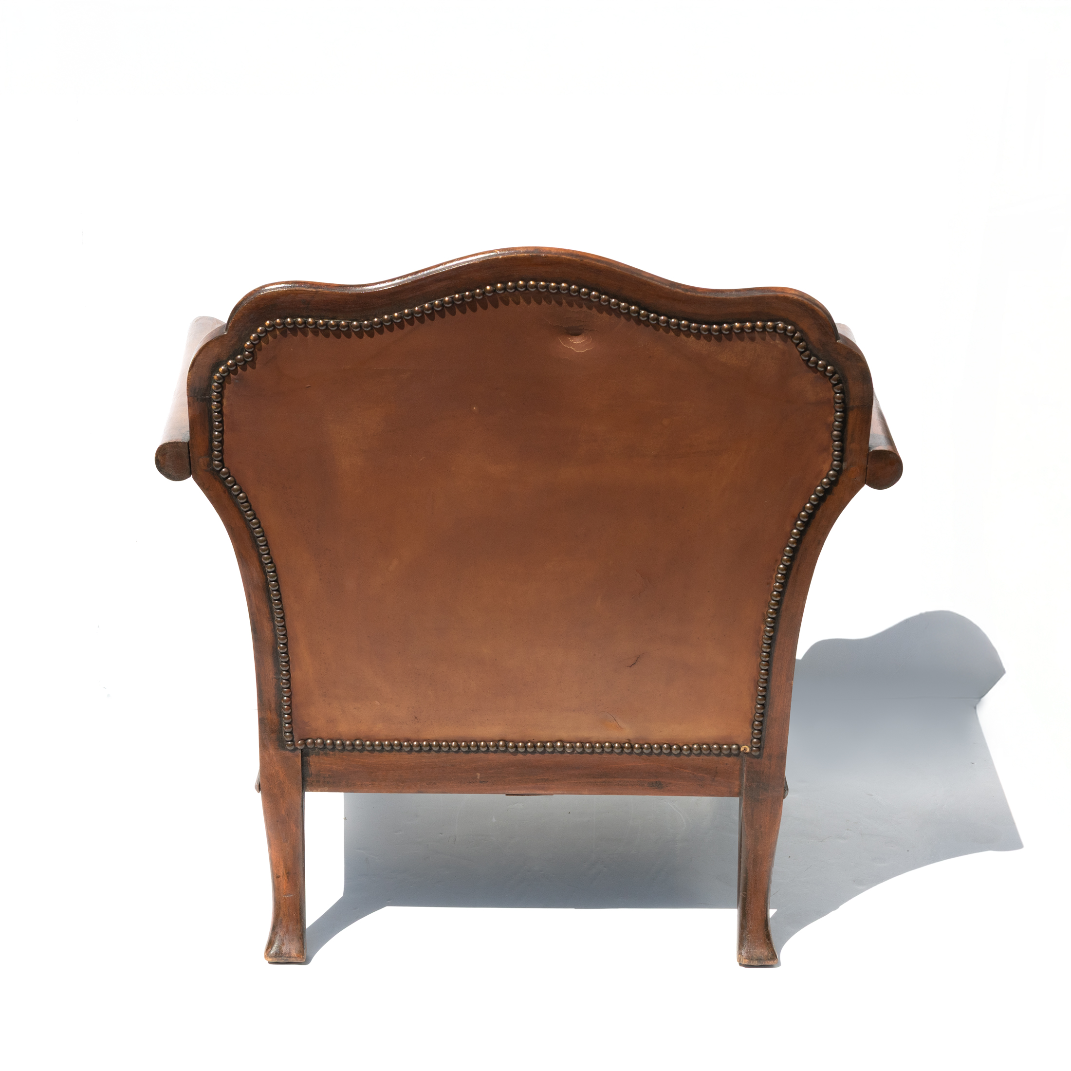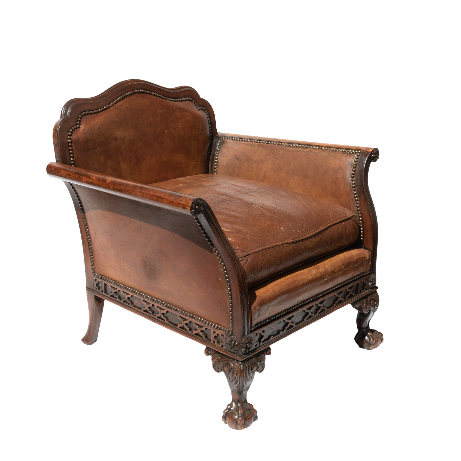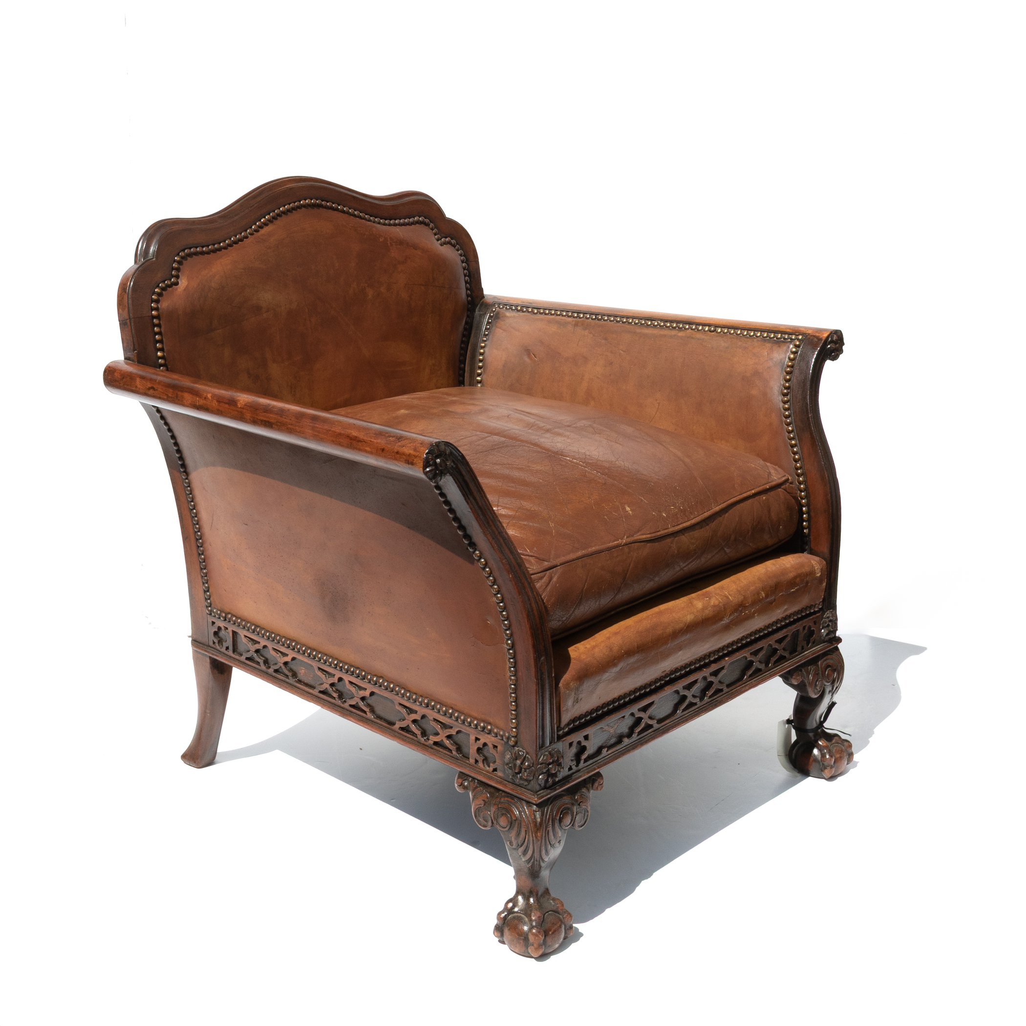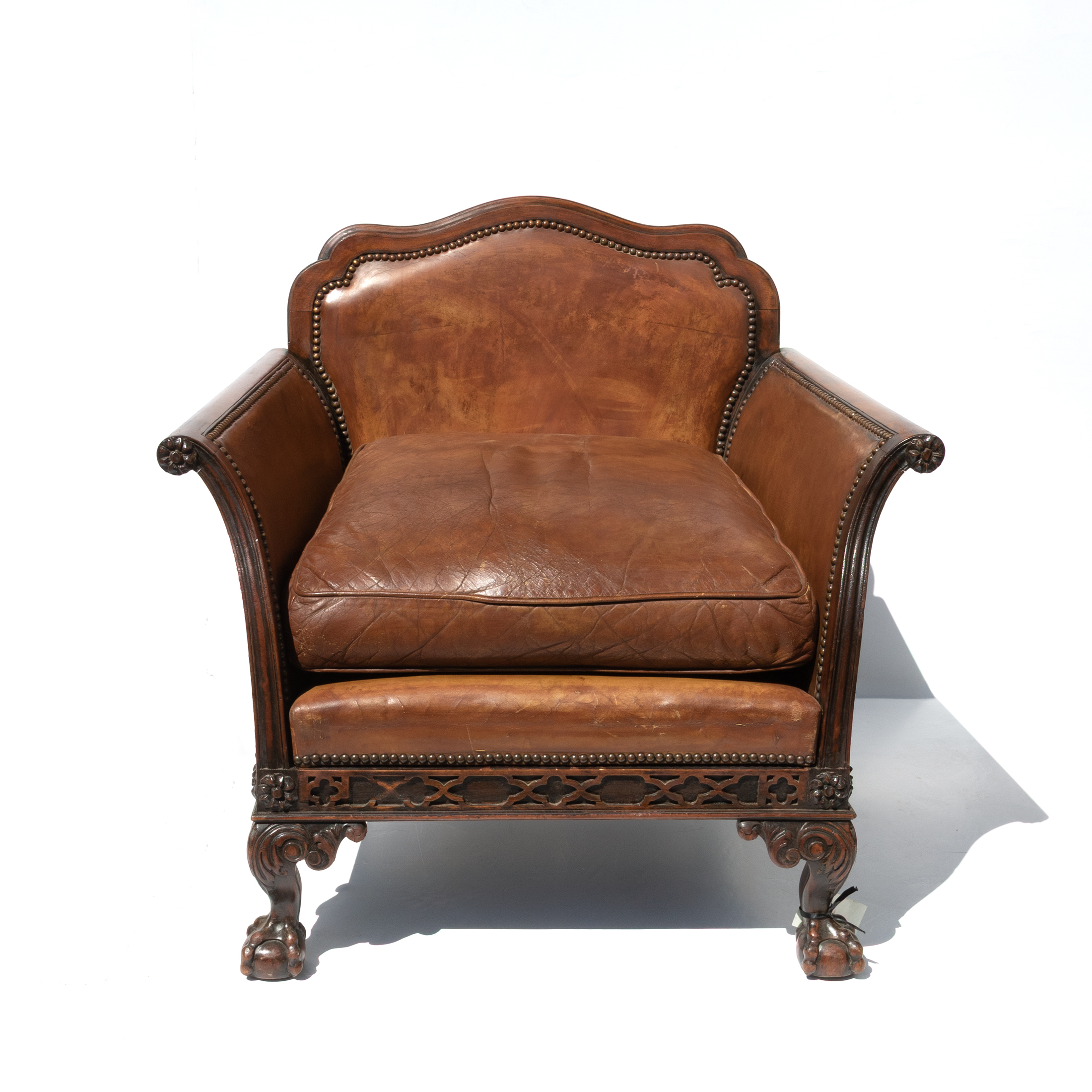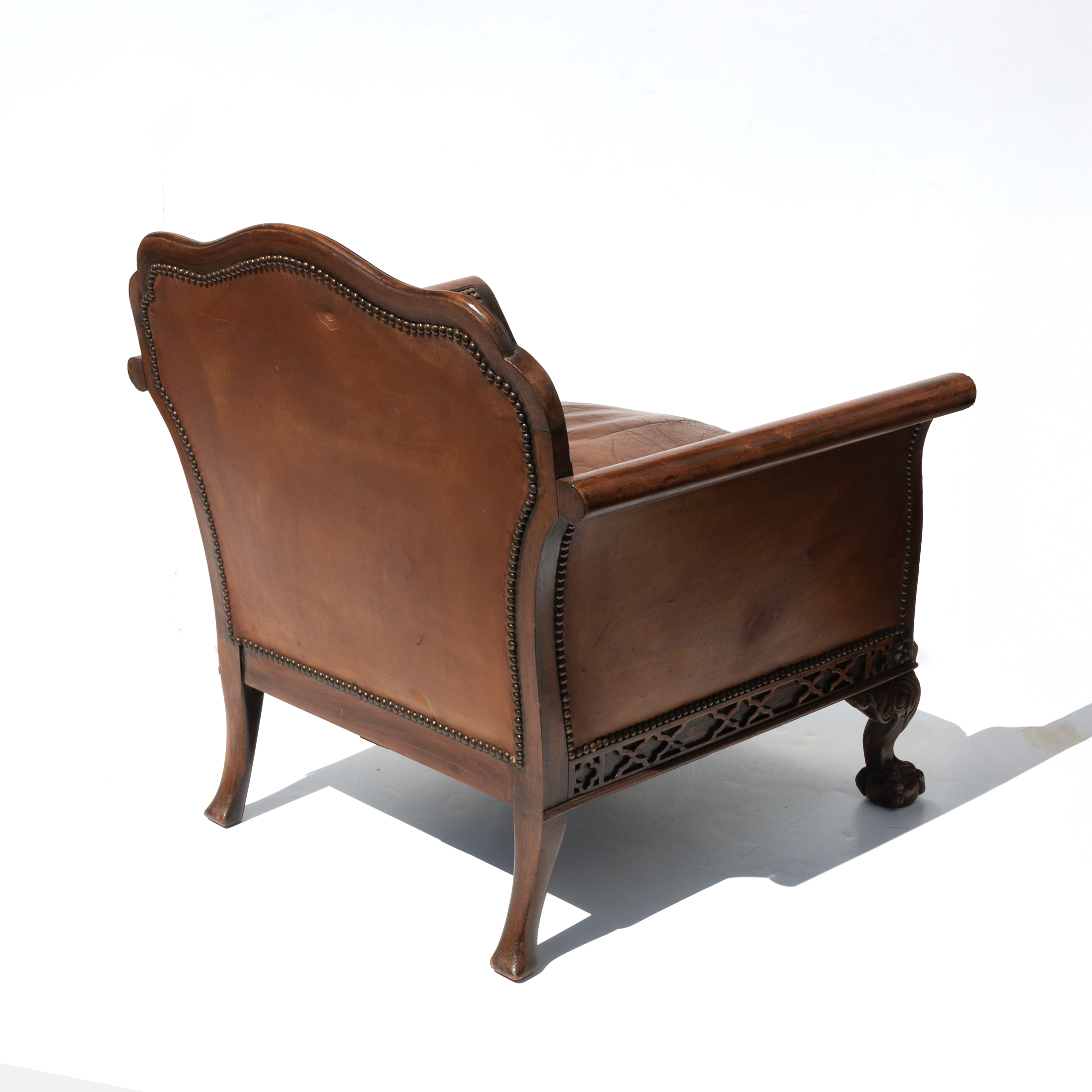 An Edwardian armchair in mahogany with upholstered leather back, sides, and loose cushion seat. The frame is outlined with brass nailhead trim. The seat is raised on ball-and-claw front legs with acanthus carving above, and splayed rear legs. The apron presents a pierced frieze with geometric and quatrefoil cut-outs, reminiscent of Gothic revival motifs popular in late 19th-century English furniture. The shaped back is outlined with nailhead trim continuing along the rolled arms.