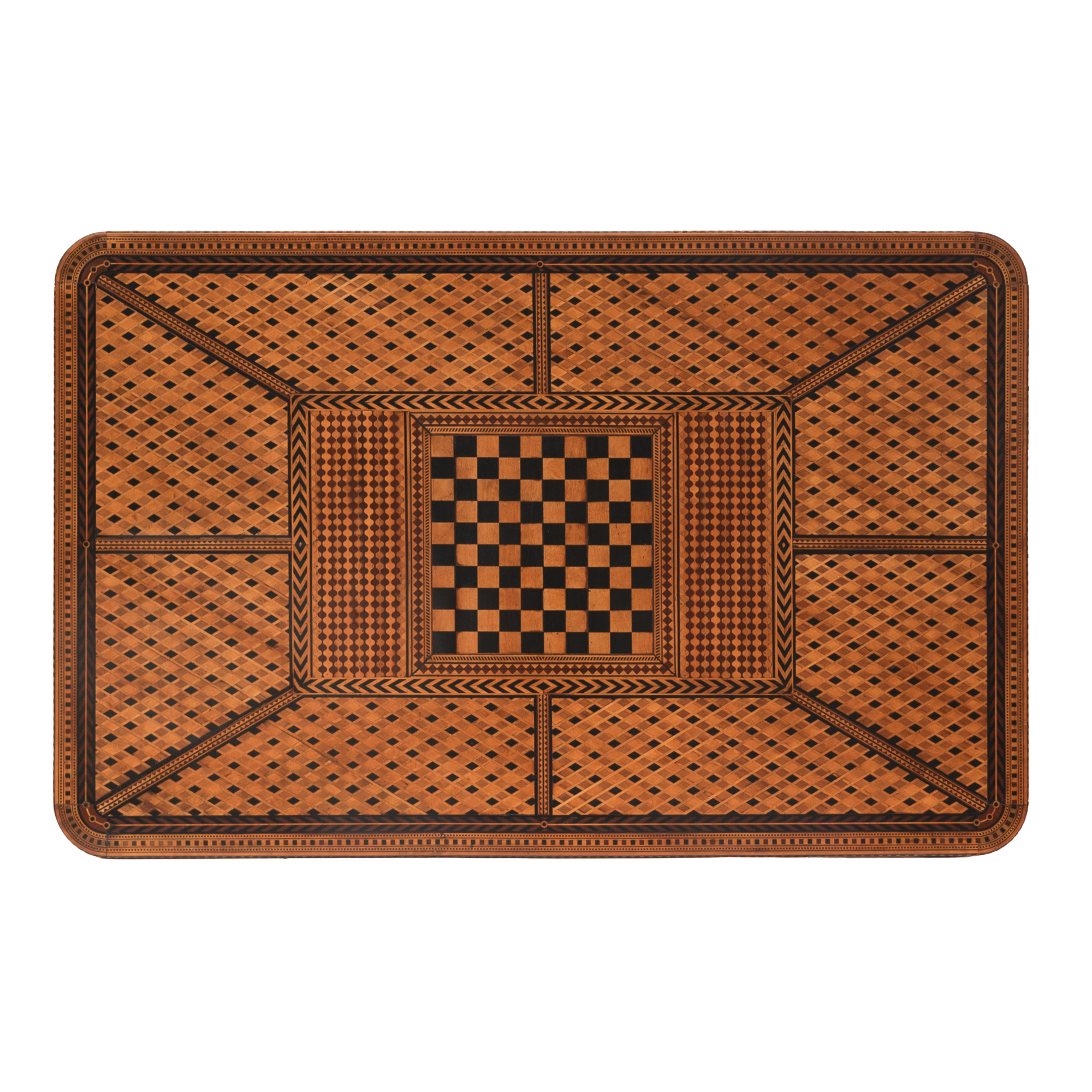 A late-19th-century French games table finely veneered in ebony, walnut, and satinwood with intricate geometric marquetry throughout. The rectangular top displays a central inlaid draughts (checkers) board framed by complex parquetry panels and border bands of alternating pattern. The frieze incorporates two drawers fitted with working locks and keys. Each leg is turned and fluted, inlaid vertically with ebony lines and terminating in large brass cup casters. The corners of the apron bear compass-star motifs.