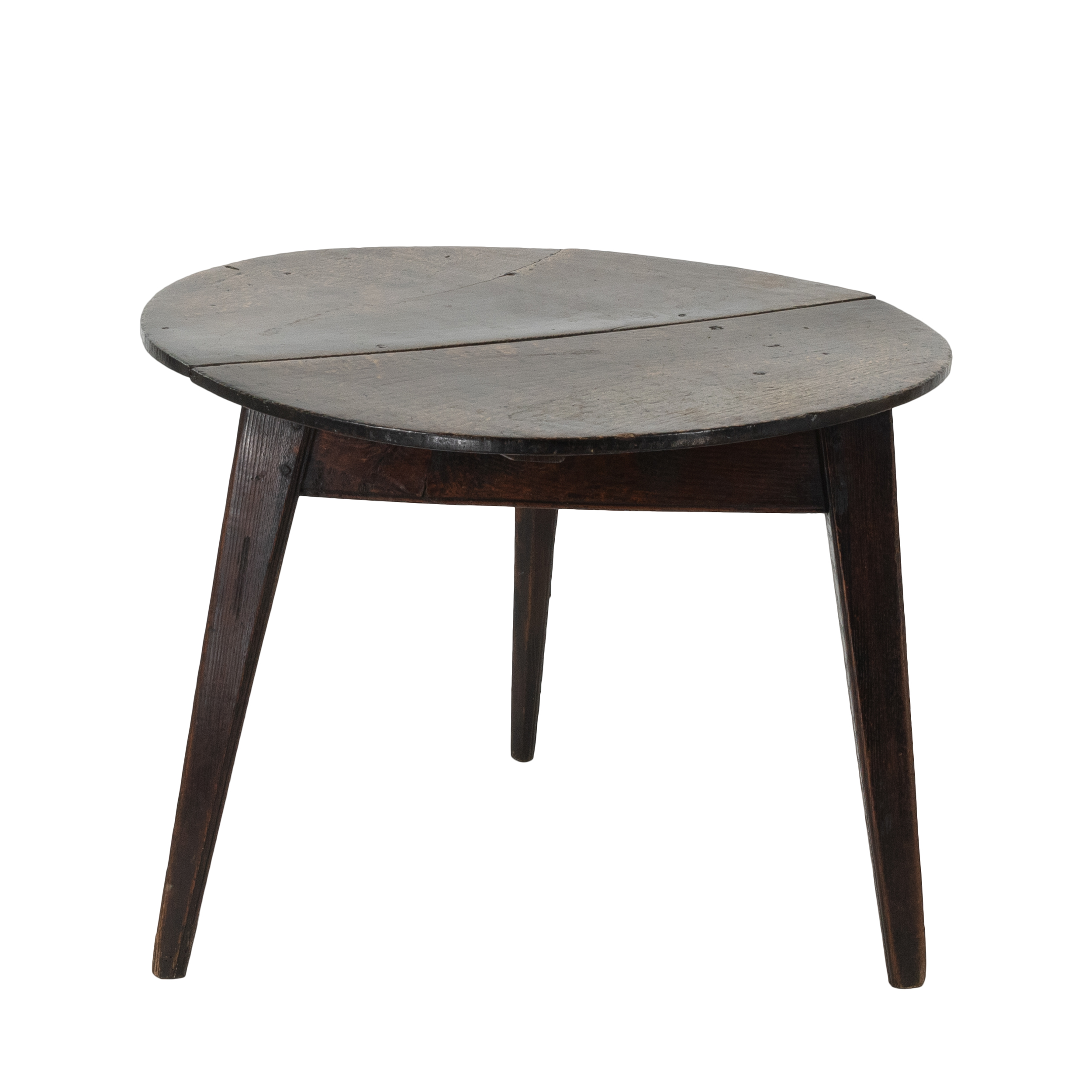 A handsome English oak cricket table, circa 1890. A traditional small, three-legged, round table with triangular frame; high stretchers between splayed legs offering stability and support for the circular plank top. The table's surface shows the rich patina of age. This modest and versatile table could be used as an excellent occasional table or side table. height: 22 in. (56 cm.), diameter: 28 in. (71 cm.)
