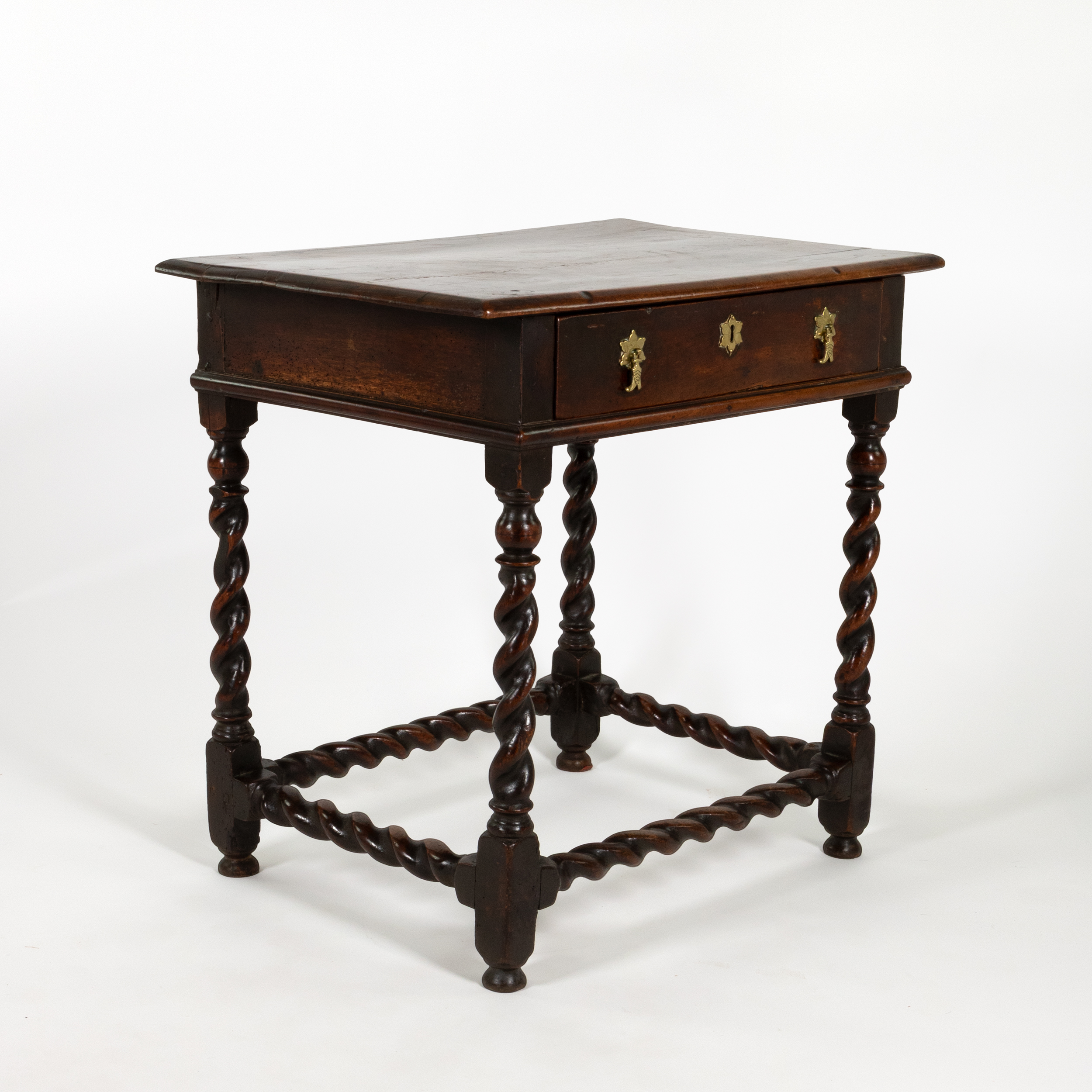 An oak side table with single frieze drawer fitted with original brass drop handles and star-form escutcheon. The table stands on four turned and spiral-carved barley twist legs united by box stretchers of matching carved work. The top with rich patina consistent with age and use; frieze drawer with working lock and key. The construction and carved detailing are consistent with early Georgian period furniture. George I Period, circa 1720