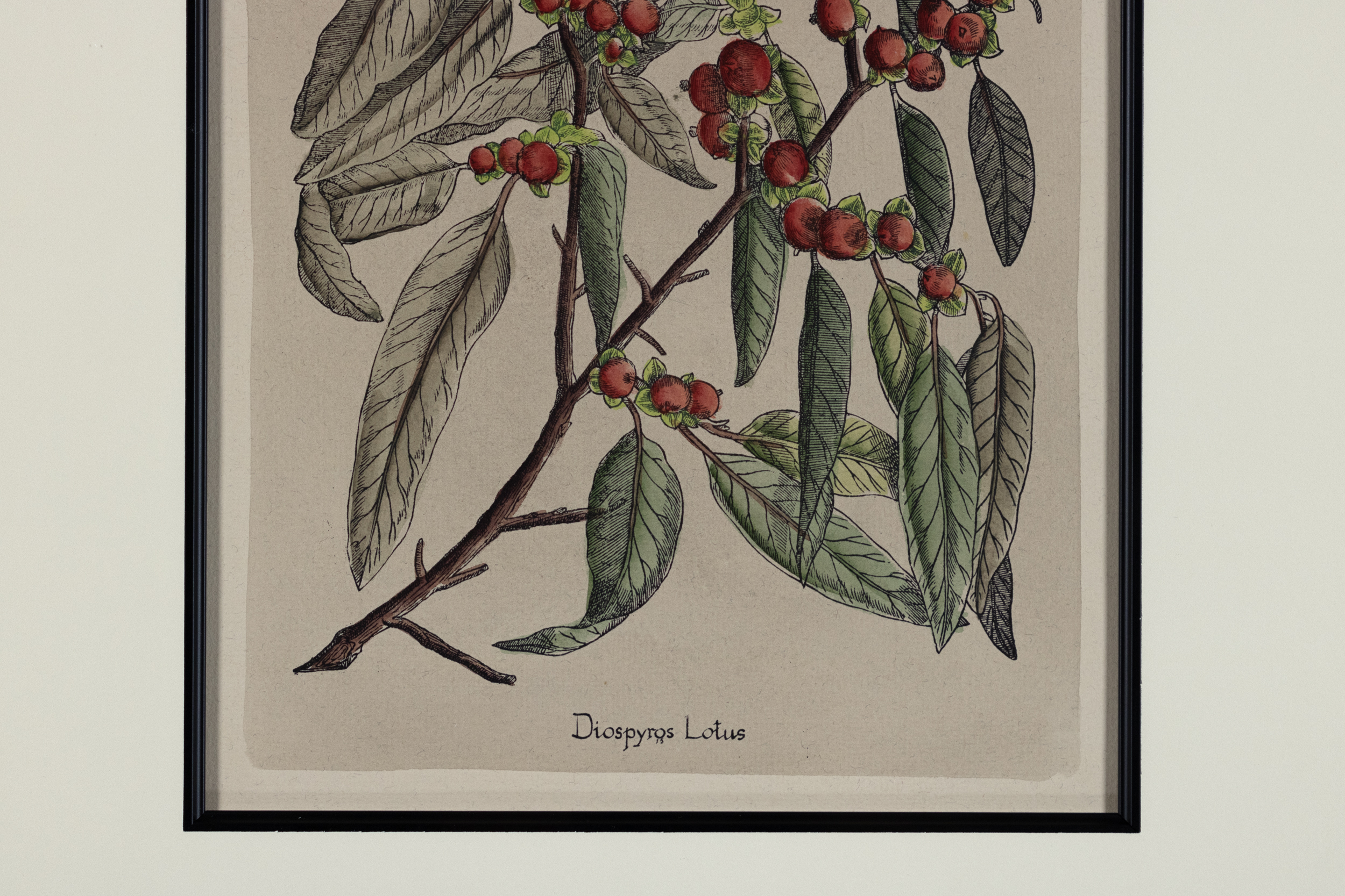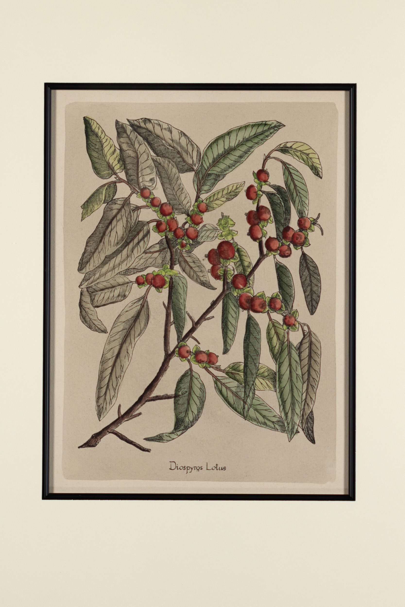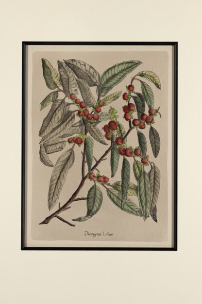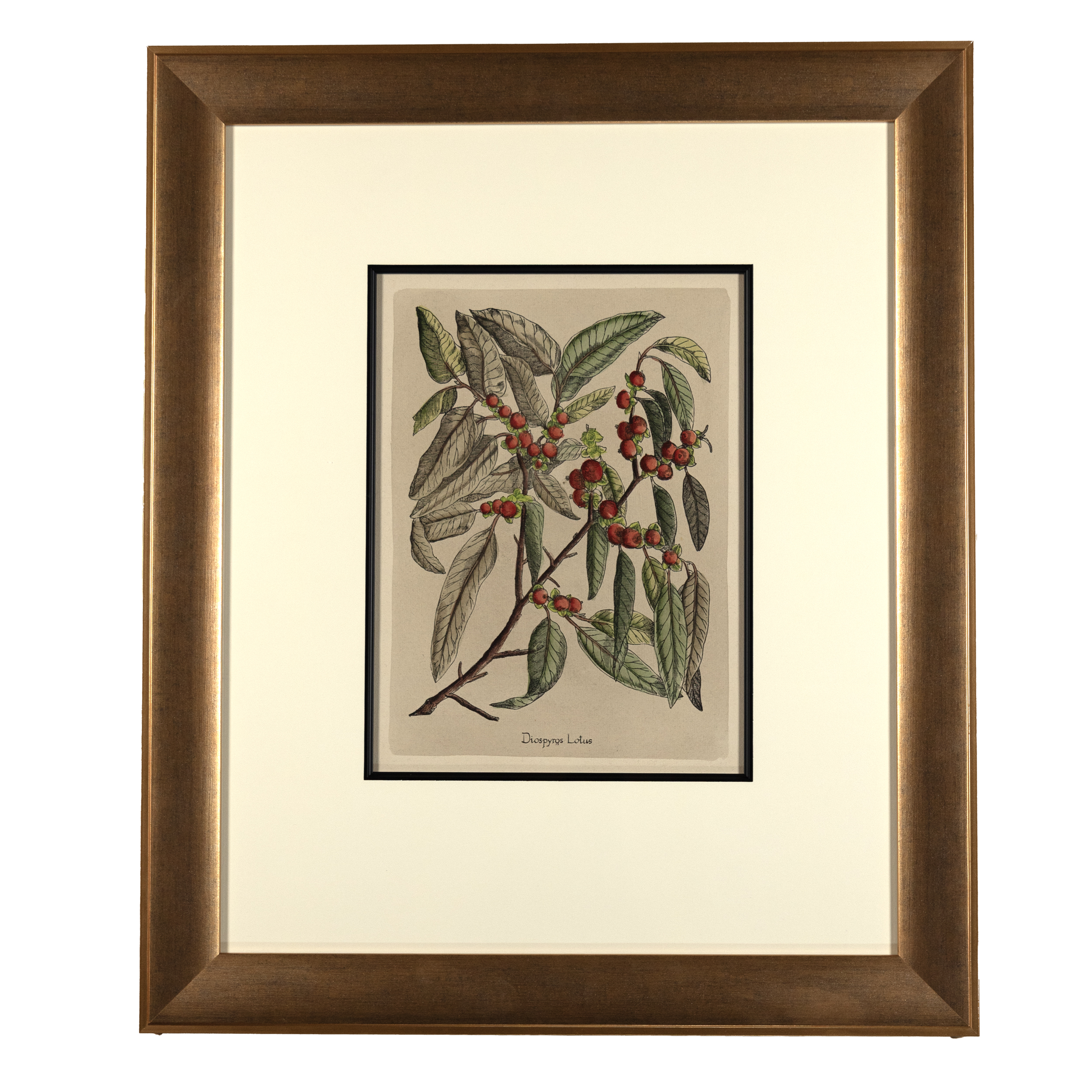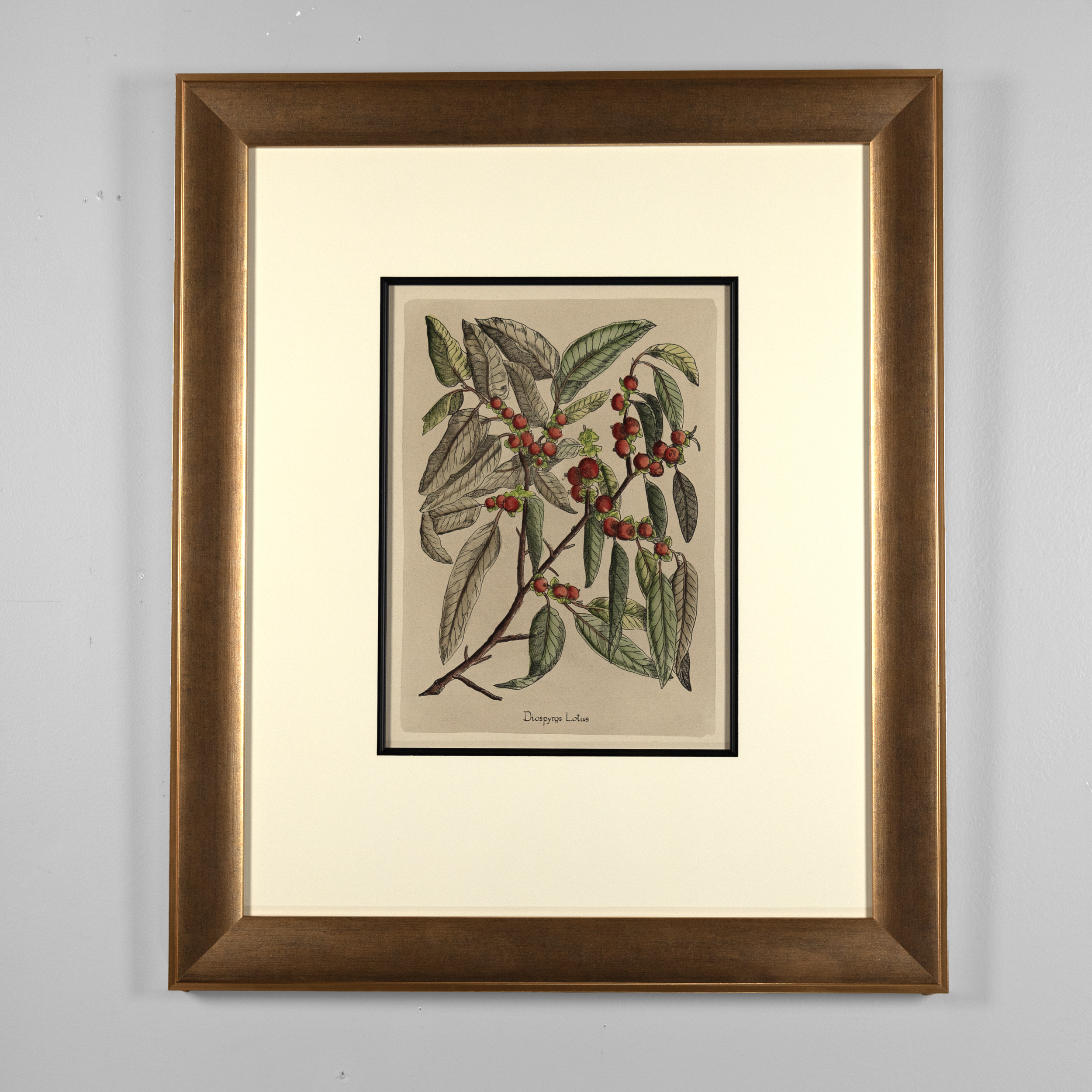 This lithograph, “Diospyros Lotus,” represents the date plum, is part of a collection of eight French botanical illustrations. The illustration accurately and artistically renders red berries with the green foliage of the plant all characteristic of scientific botanical illustrations of the late 19th century, circa 1890. 1 The print is double matted and presented in a gold frame.