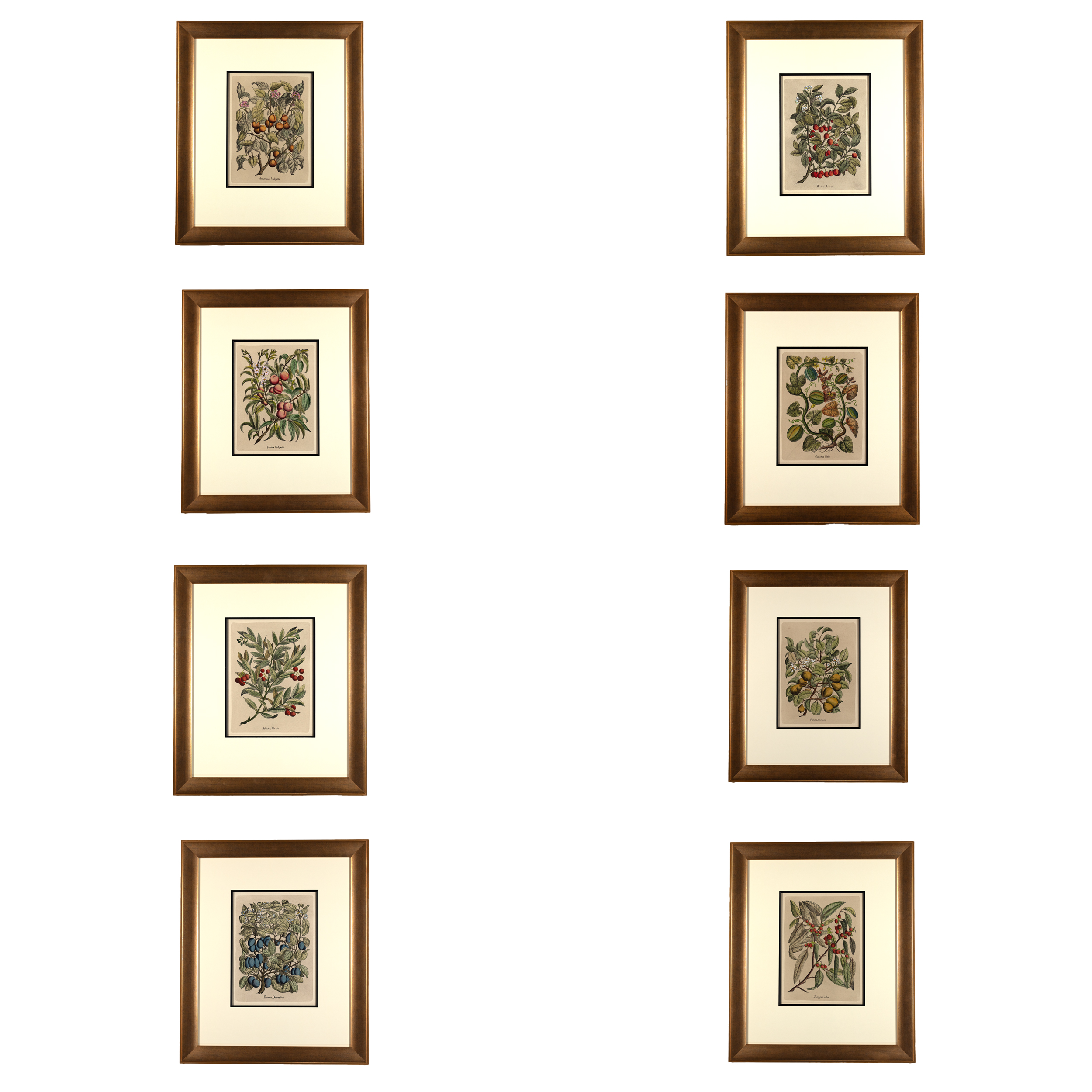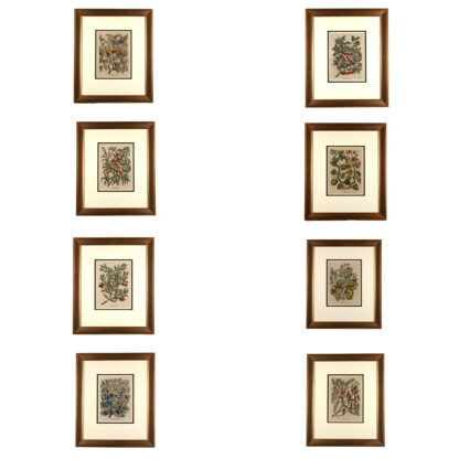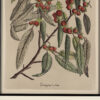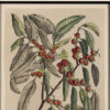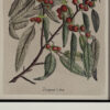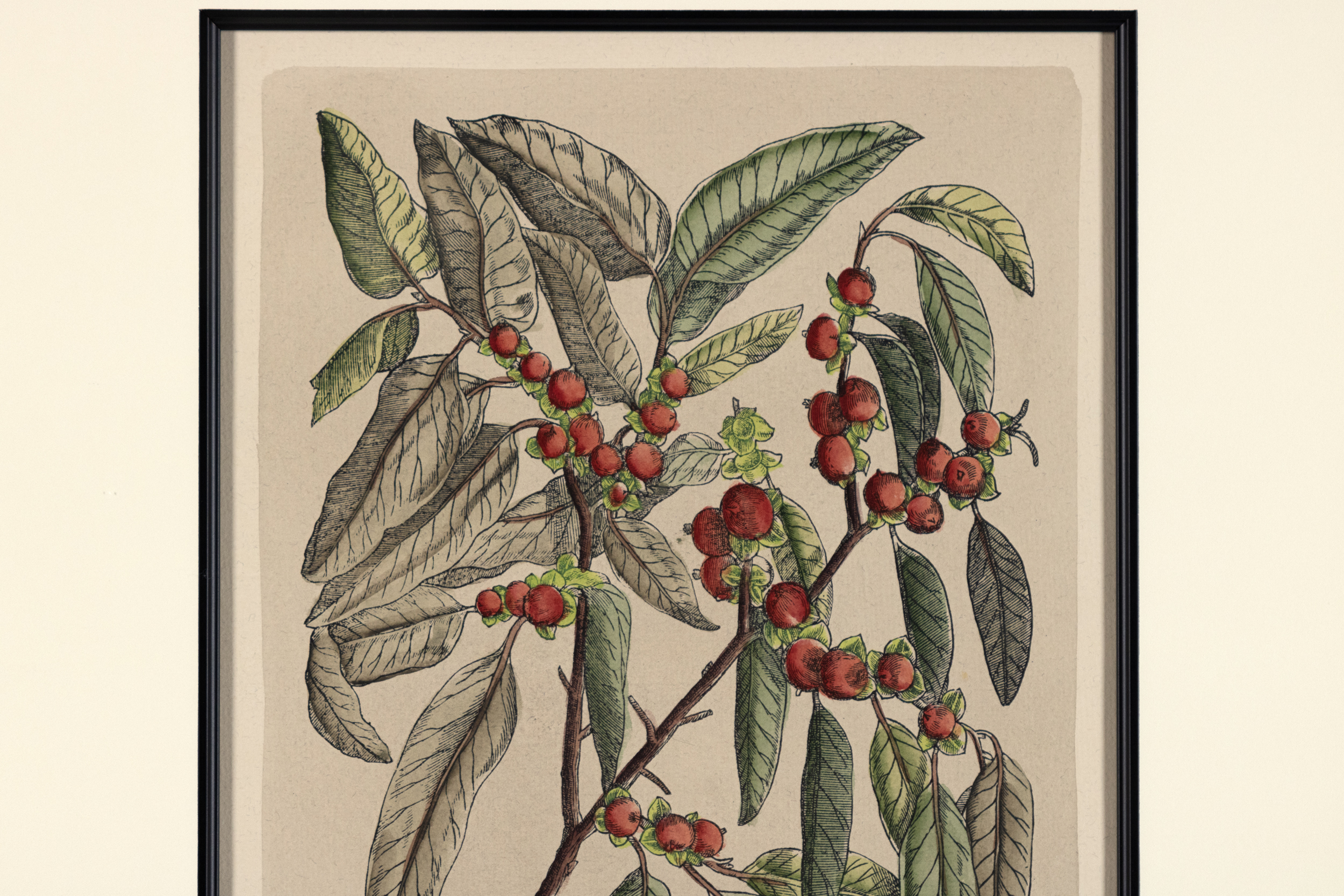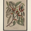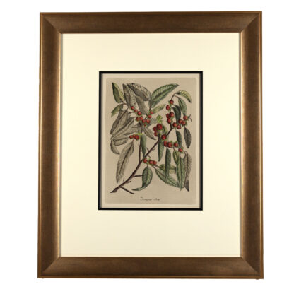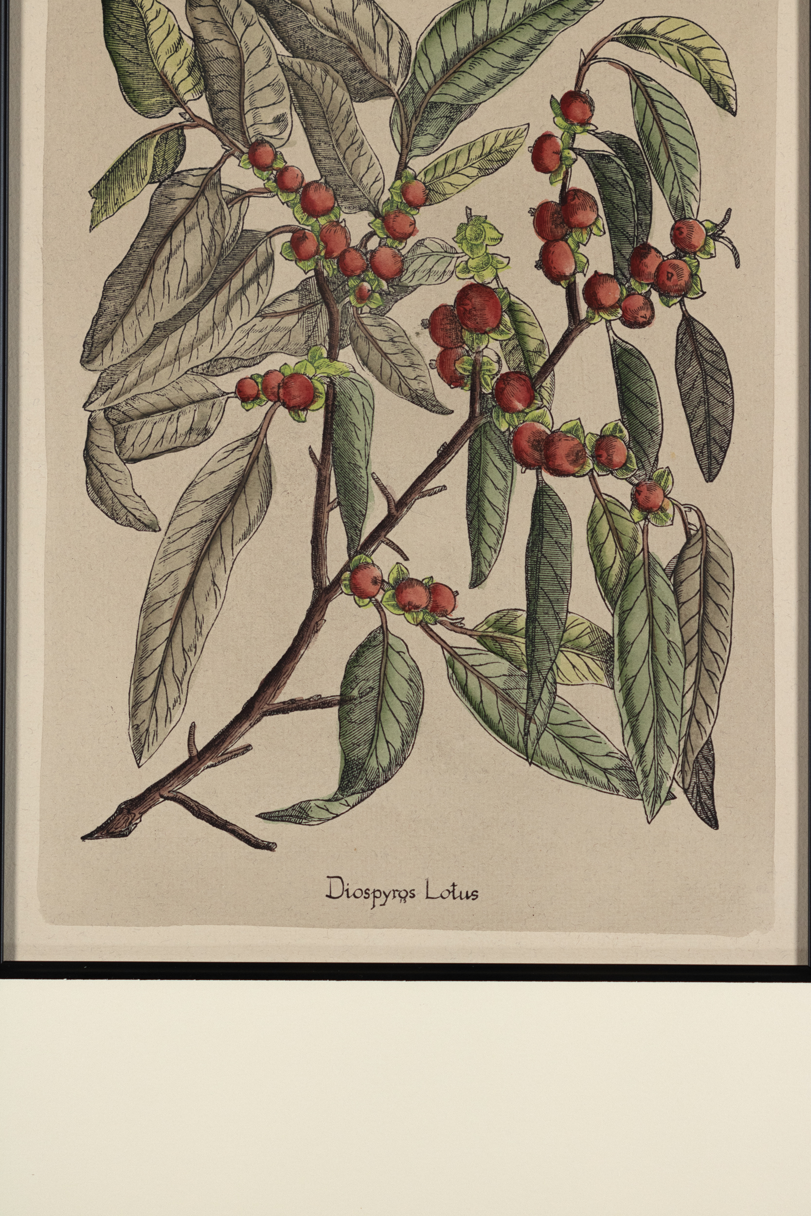 This lithograph, “Diospyros Lotus,” represents the date plum, is part of a collection of eight French botanical illustrations. The illustration accurately and artistically renders red berries with the green foliage of the plant all characteristic of scientific botanical illustrations of the late 19th century, circa 1890. 1 The print is double matted and presented in a gold frame.