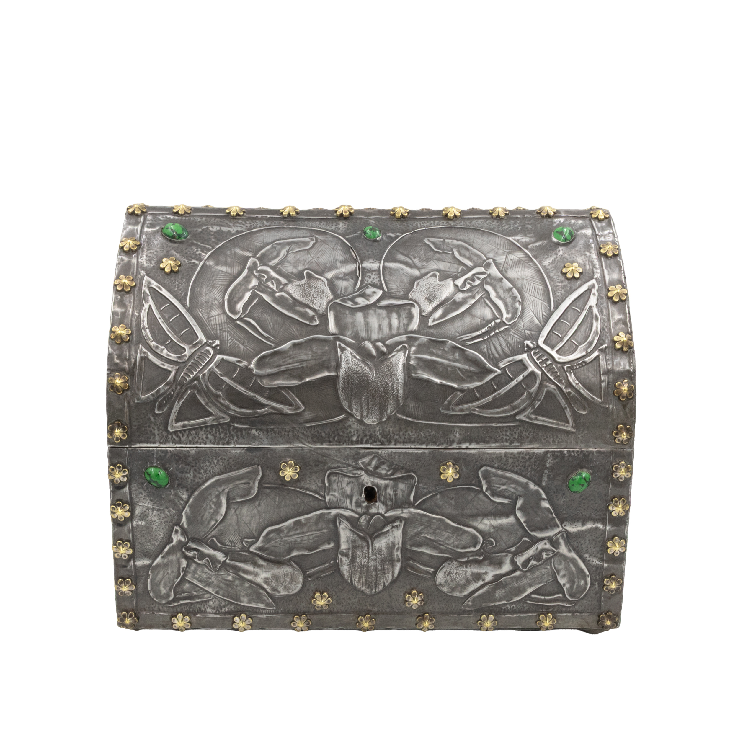 A French Art Nouveau domed box in pewter with embossed decoration of stylized tulips and butterflies. The surfaces are accented by brass floral nailheads and green cabochon stones at intervals. The interior is lined in original green velvet fabric, with a working lock and key. Height: 9 in. (23 cm.)