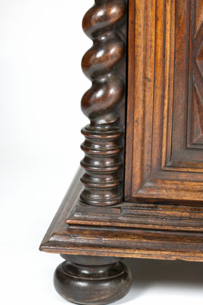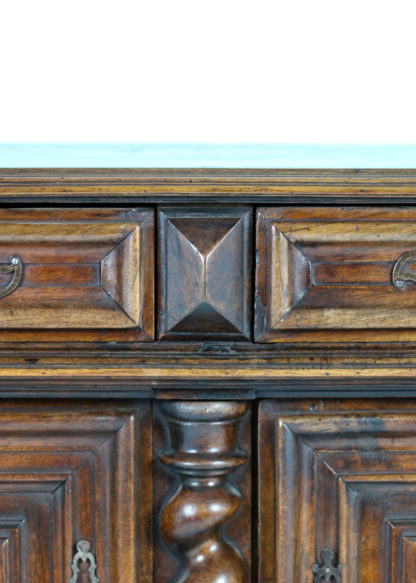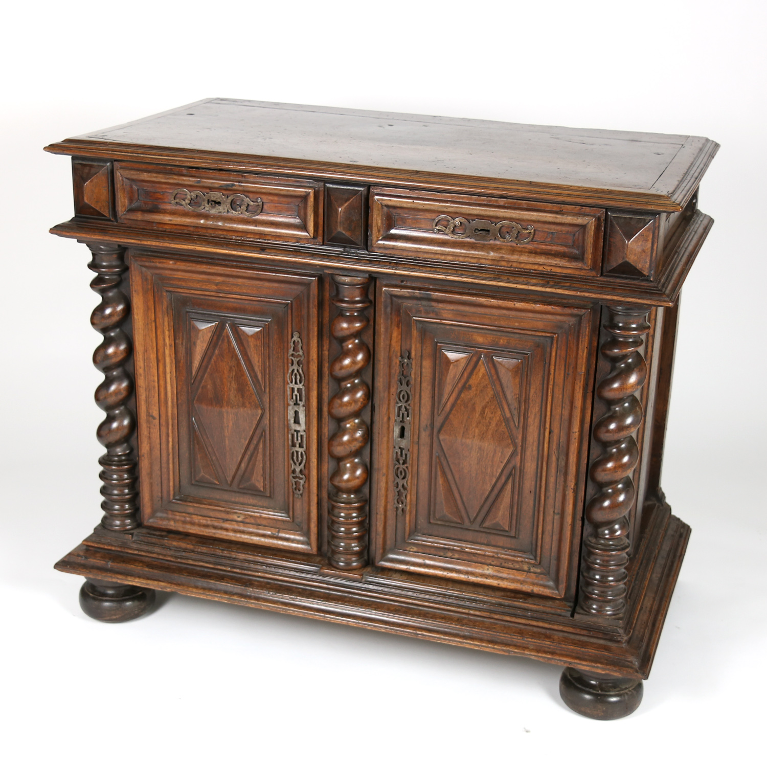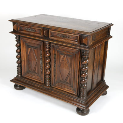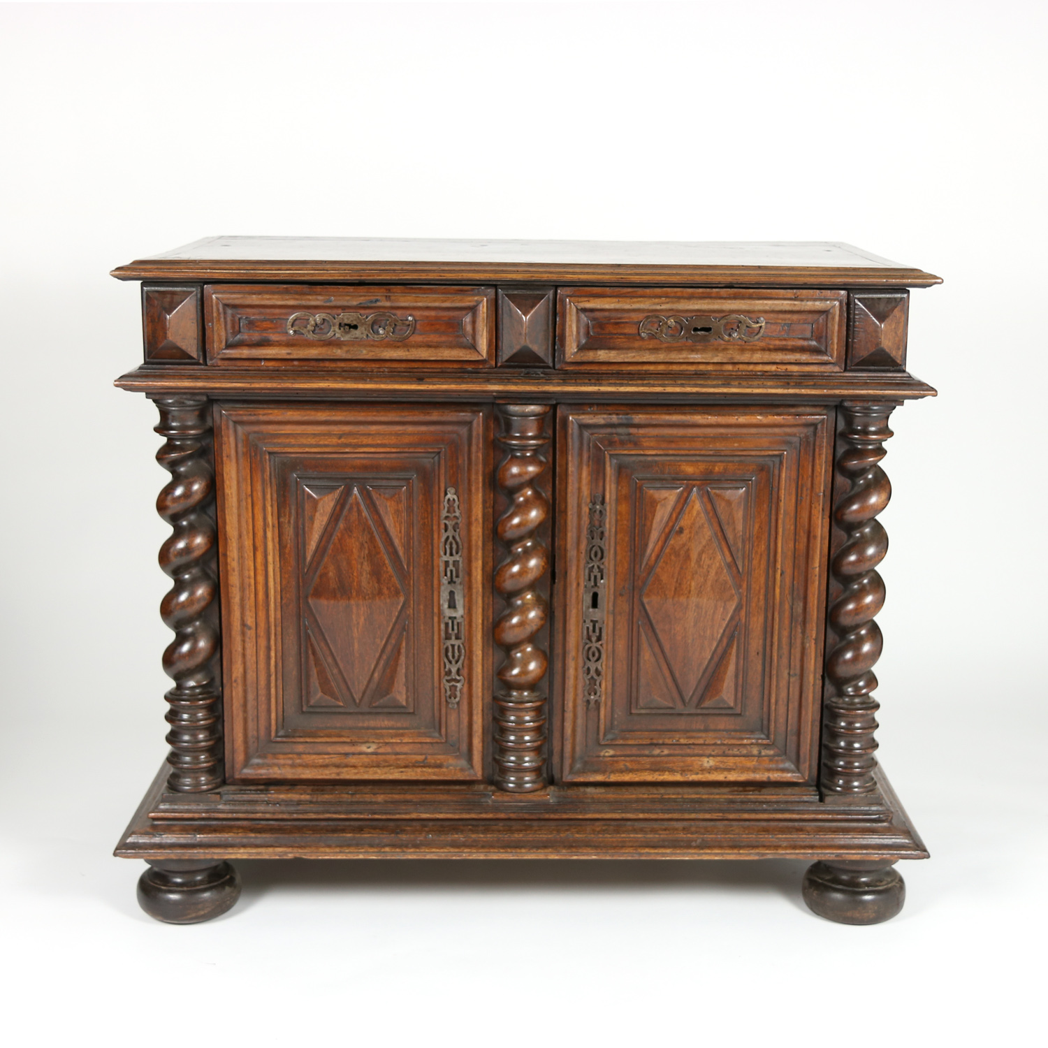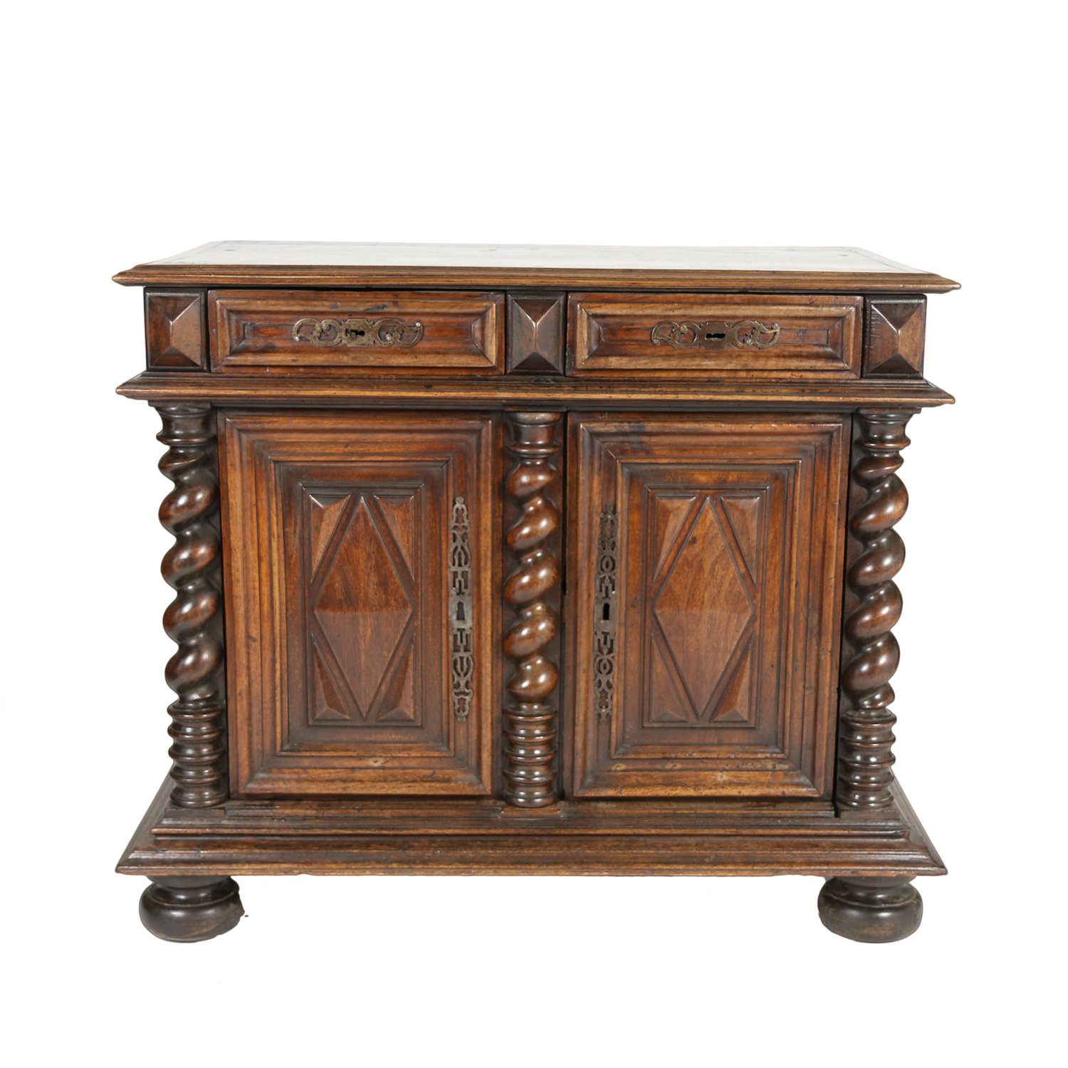 A Baroque Period carved walnut buffet; French, circa 1680; Two moulded drawers over two carved panel doors with diamond and pryamid shapes. Barley twist carved elements frame the doors and between; sides of moulded panels of walnut all on large carved bun feet.