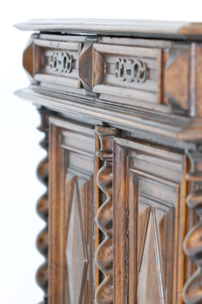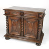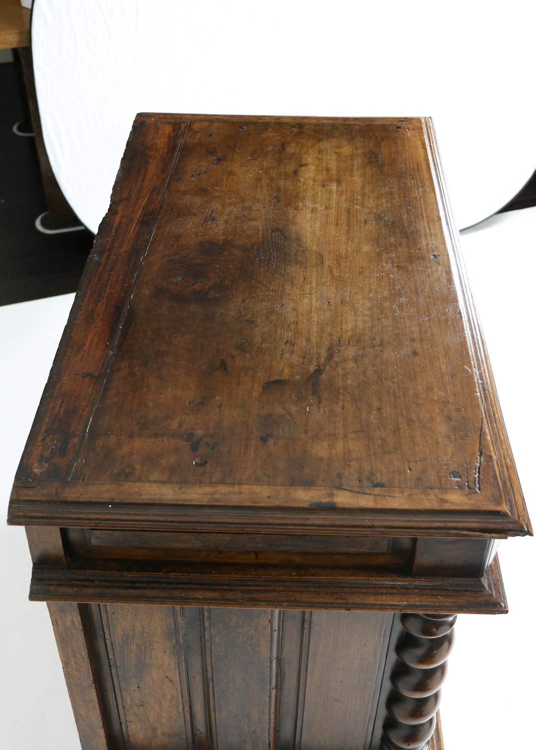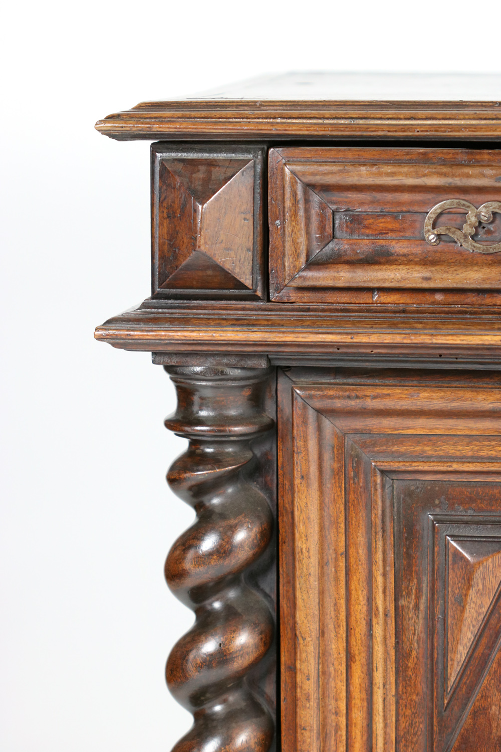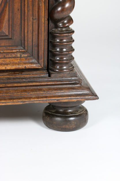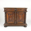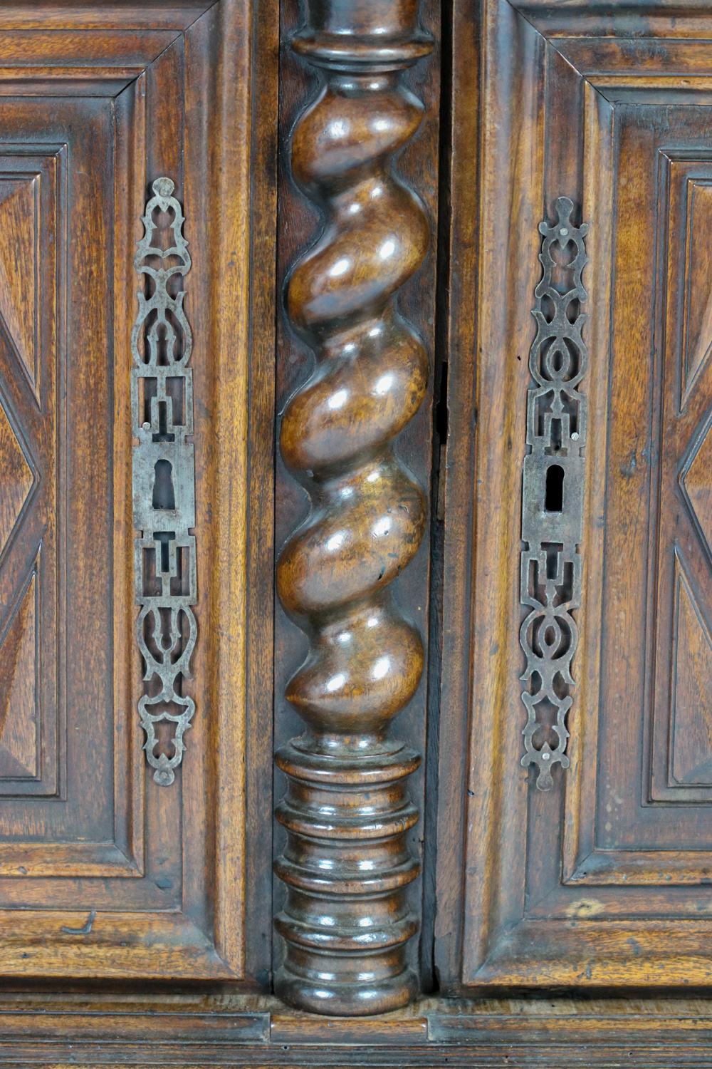 A Baroque Period carved walnut buffet; French, circa 1680; Two moulded drawers over two carved panel doors with diamond and pryamid shapes. Barley twist carved elements frame the doors and between; sides of moulded panels of walnut all on large carved bun feet.