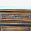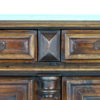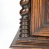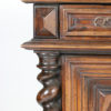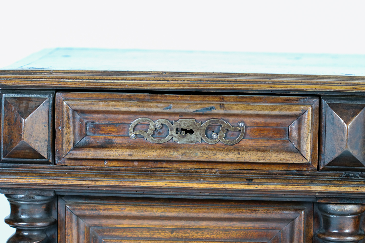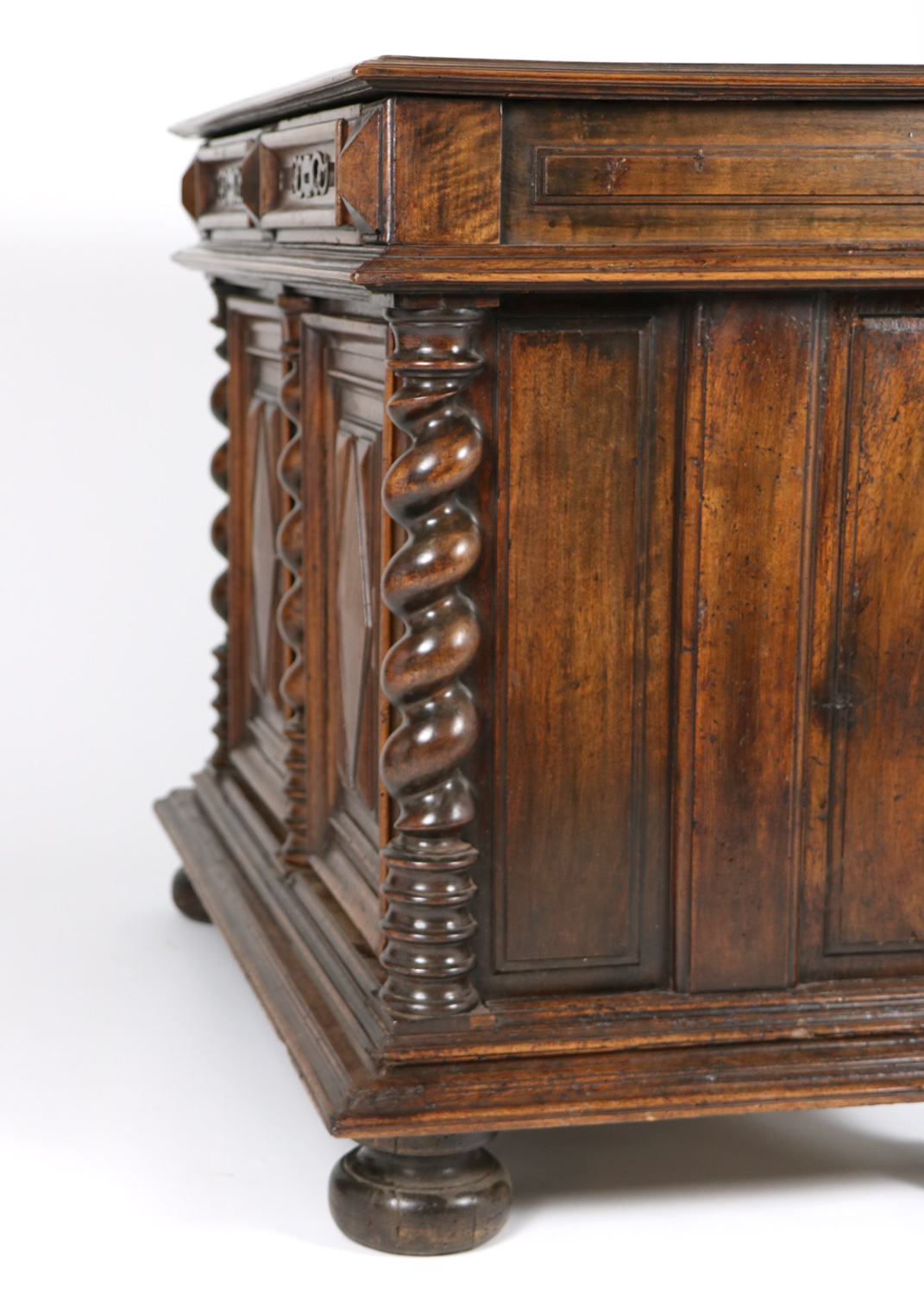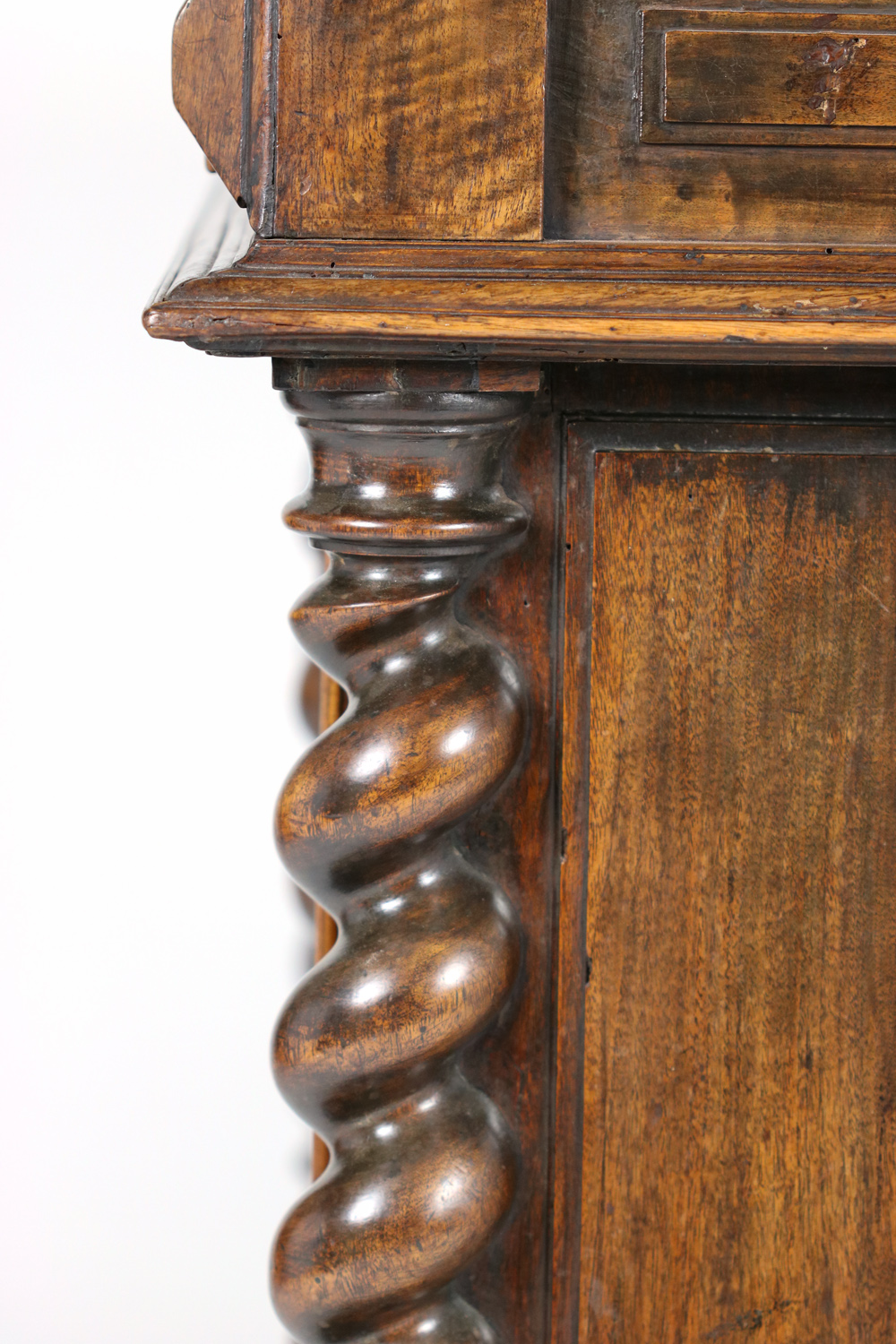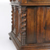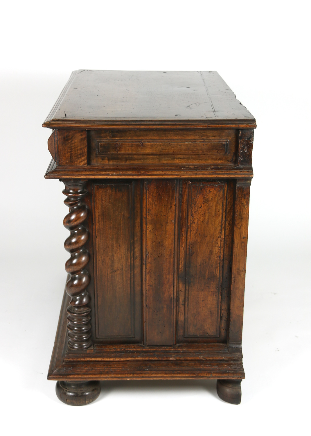 A Baroque Period carved walnut buffet; French, circa 1680; Two moulded drawers over two carved panel doors with diamond and pryamid shapes. Barley twist carved elements frame the doors and between; sides of moulded panels of walnut all on large carved bun feet.