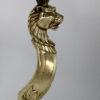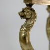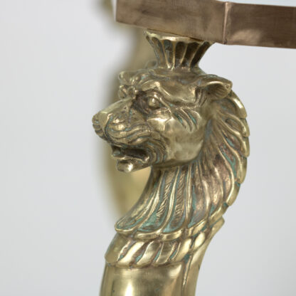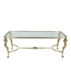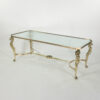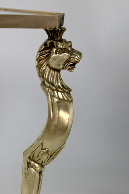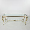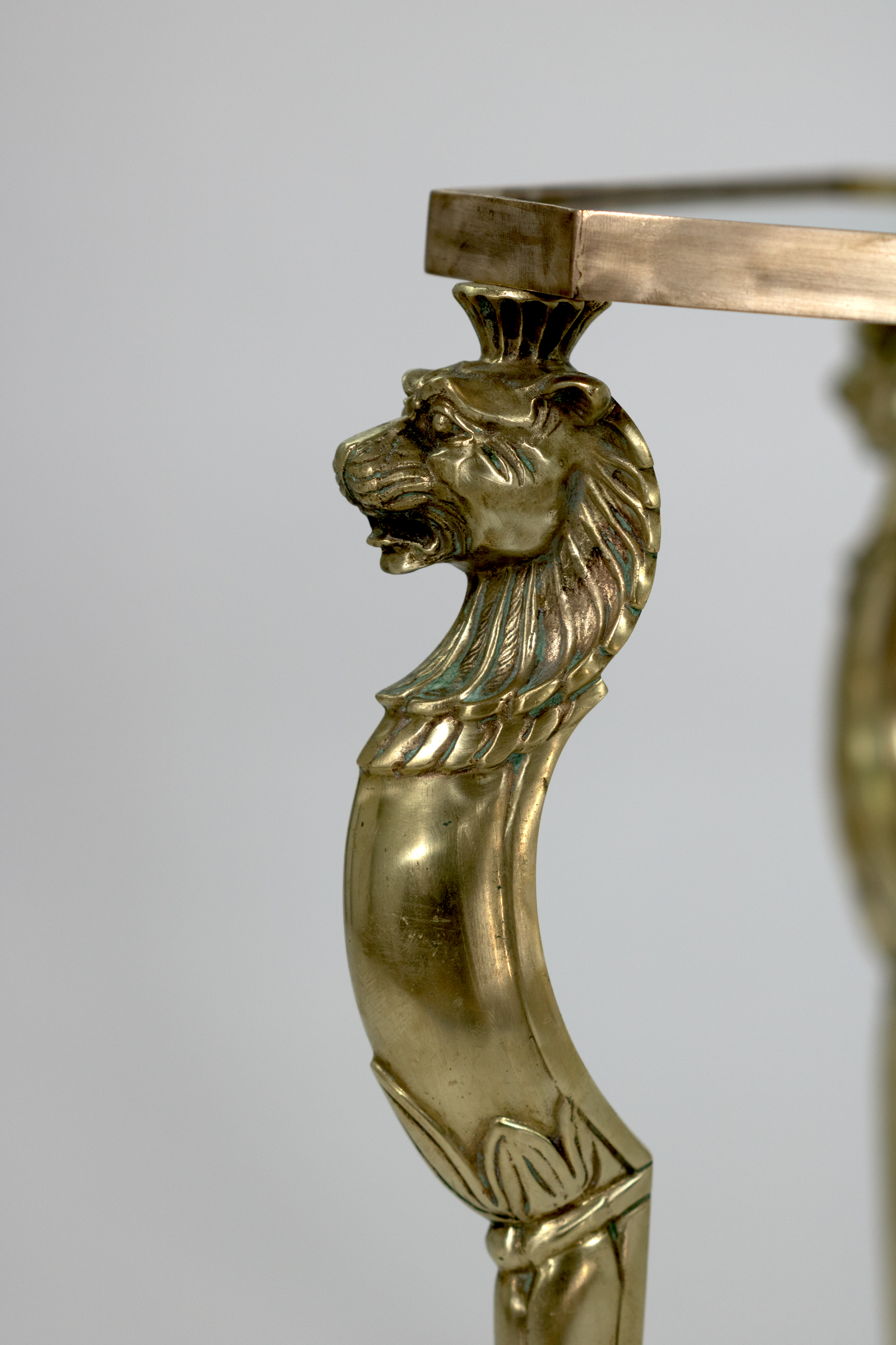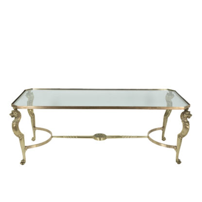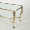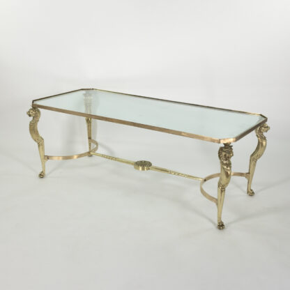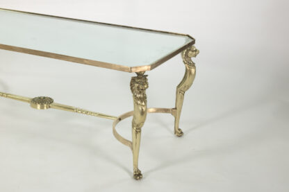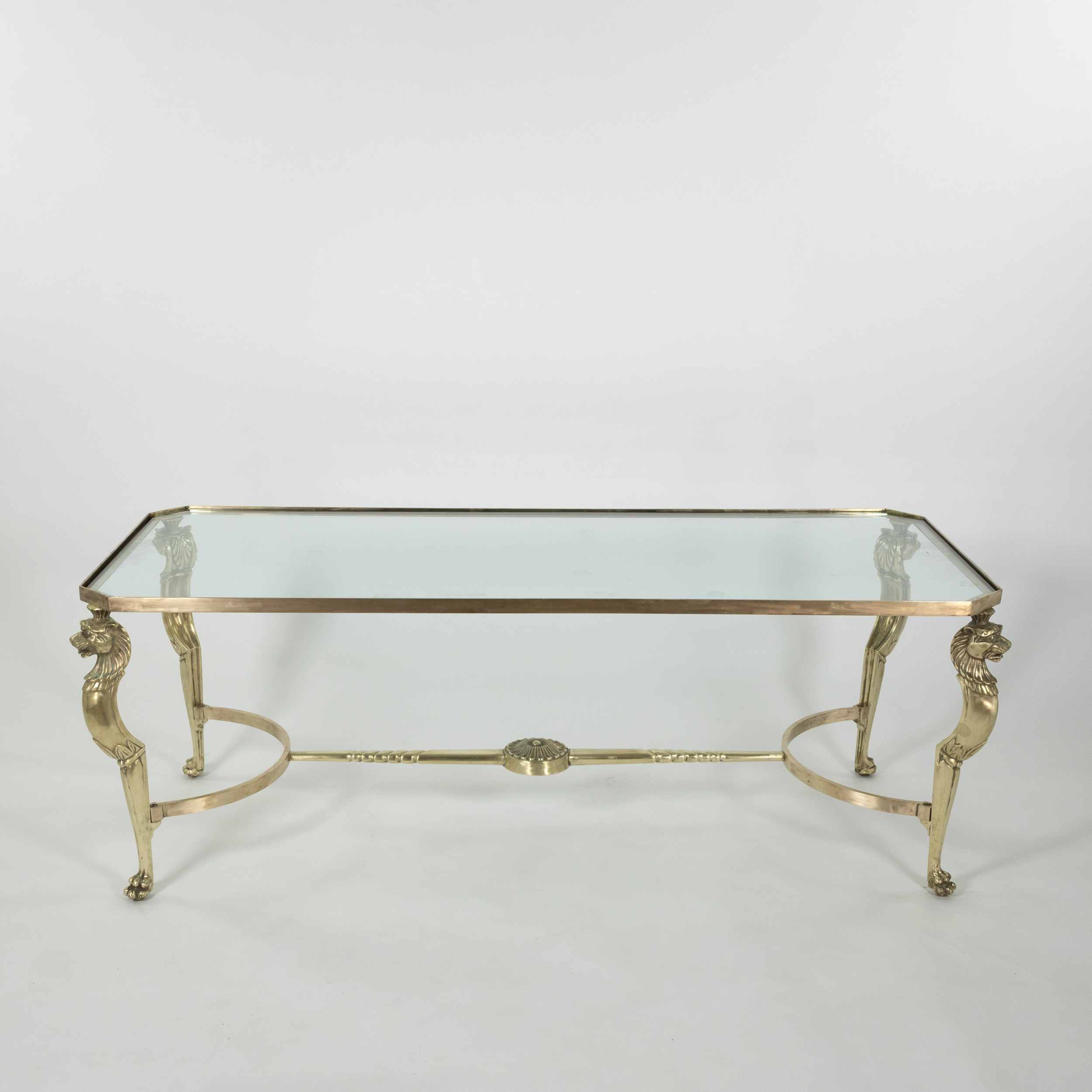 An elegant mid-20th century French coffee table in polished cast bronze, featuring lion head motifs and paw feet, in the manner of Maison Jansen. This table presents a rectangular glass top, which is anchored by the pronounced heads of lions at the junction of each leg flowing into sleek, muscular forms that terminate with detailed cast paw feet. This sturdy and decorative table is stabilized by stretchers centered with a decorative rosette medallion.