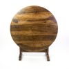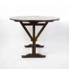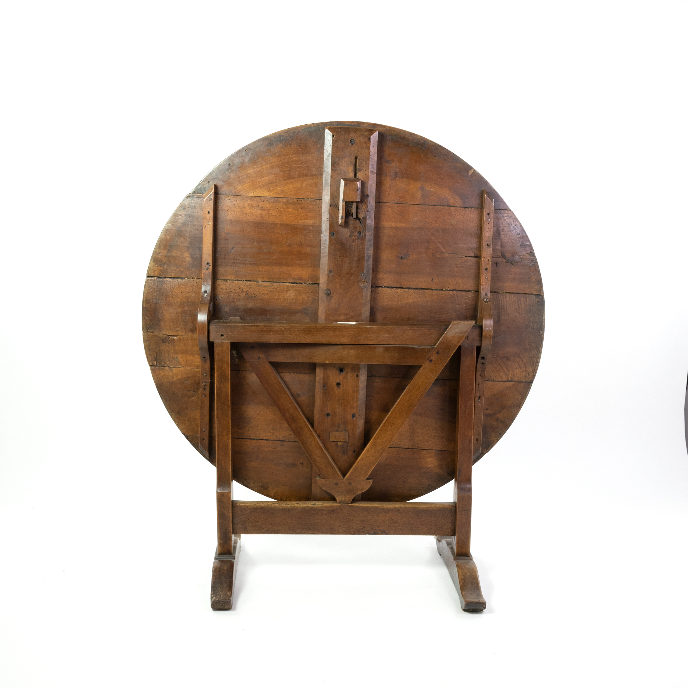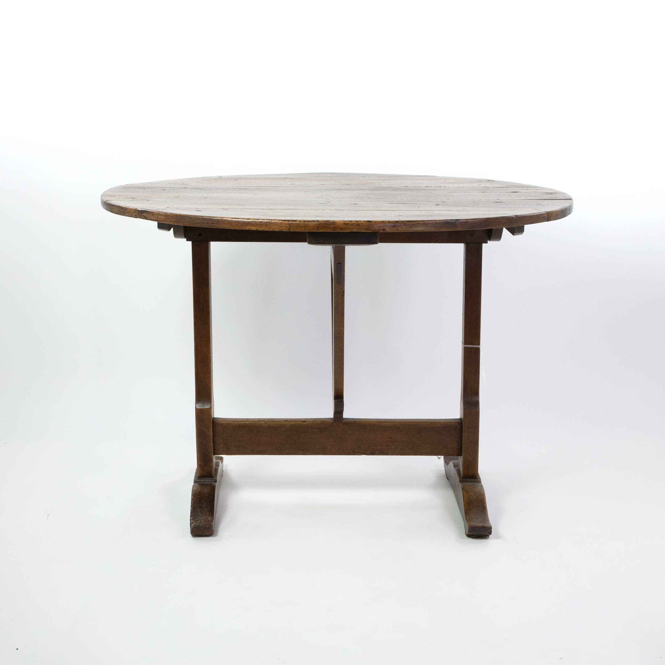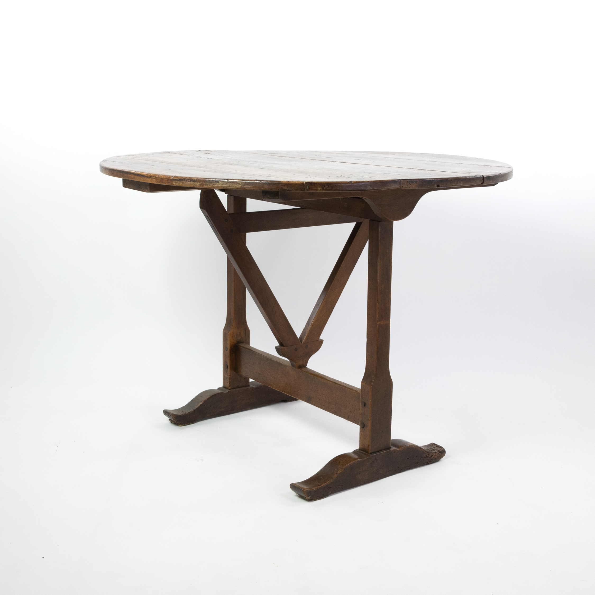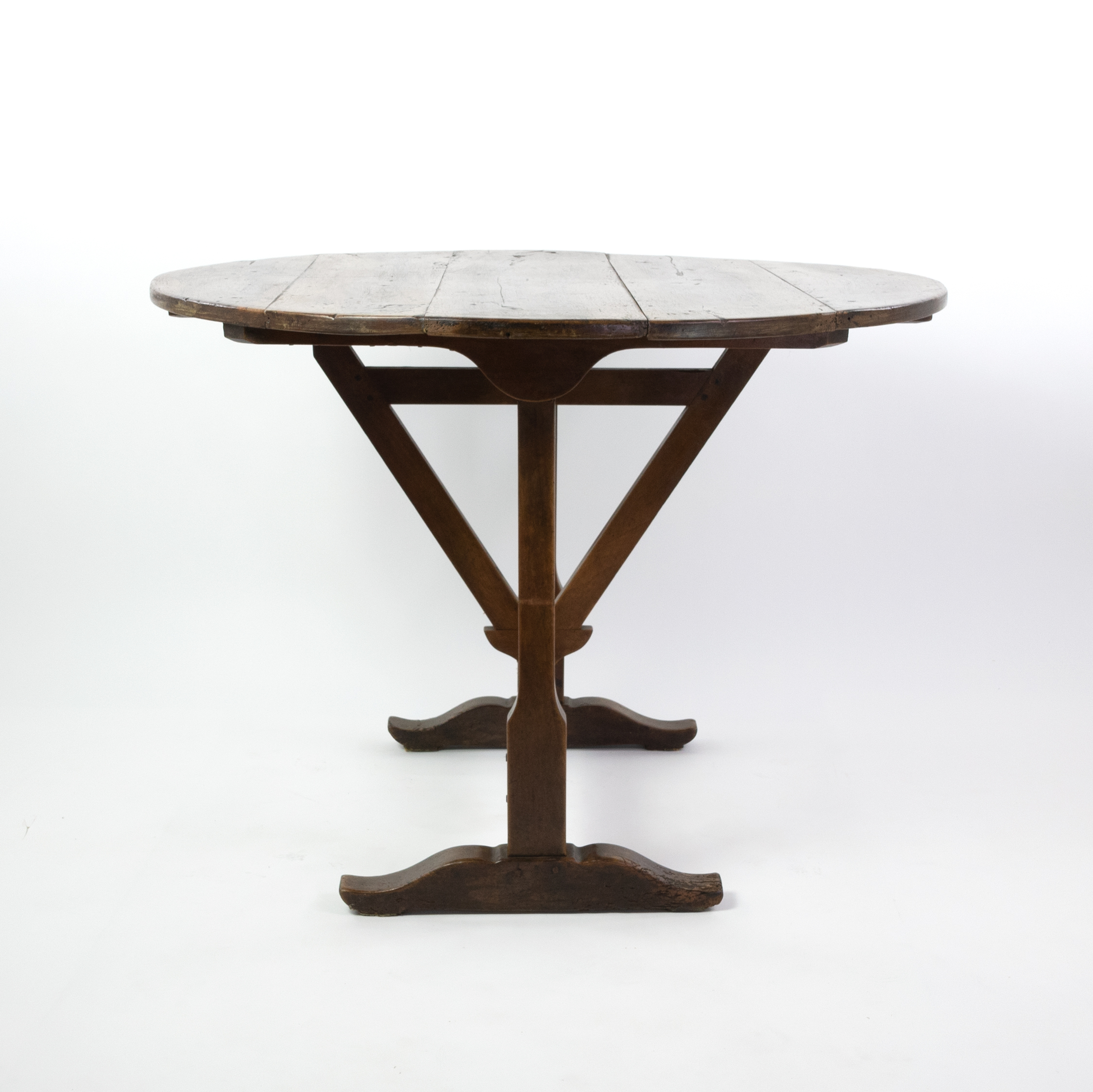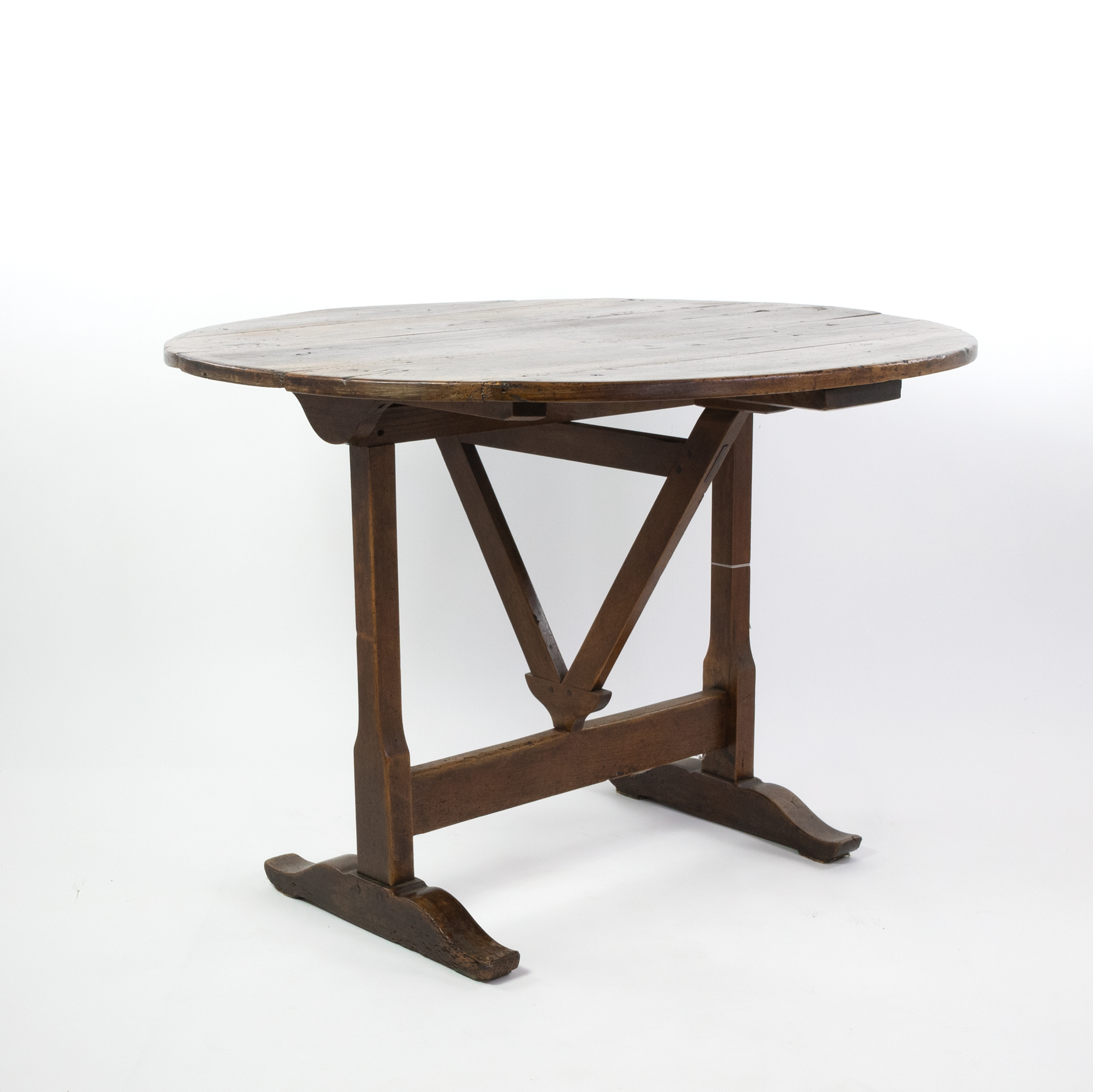 A provincial round vendange tilt top table with beautiful, richly-grained plank top and trestle supports, French circa 1870; Vendange tables are integral to French wine history. The tilt top function allows them to be stored in cellars and easily transported for wine testing. The vendange, wine harvest, begins in August and can finish as late as the end of October. Once months of hard work come to an end, it’s time to taste the wine and celebrate with friends and family.