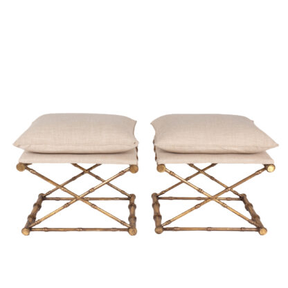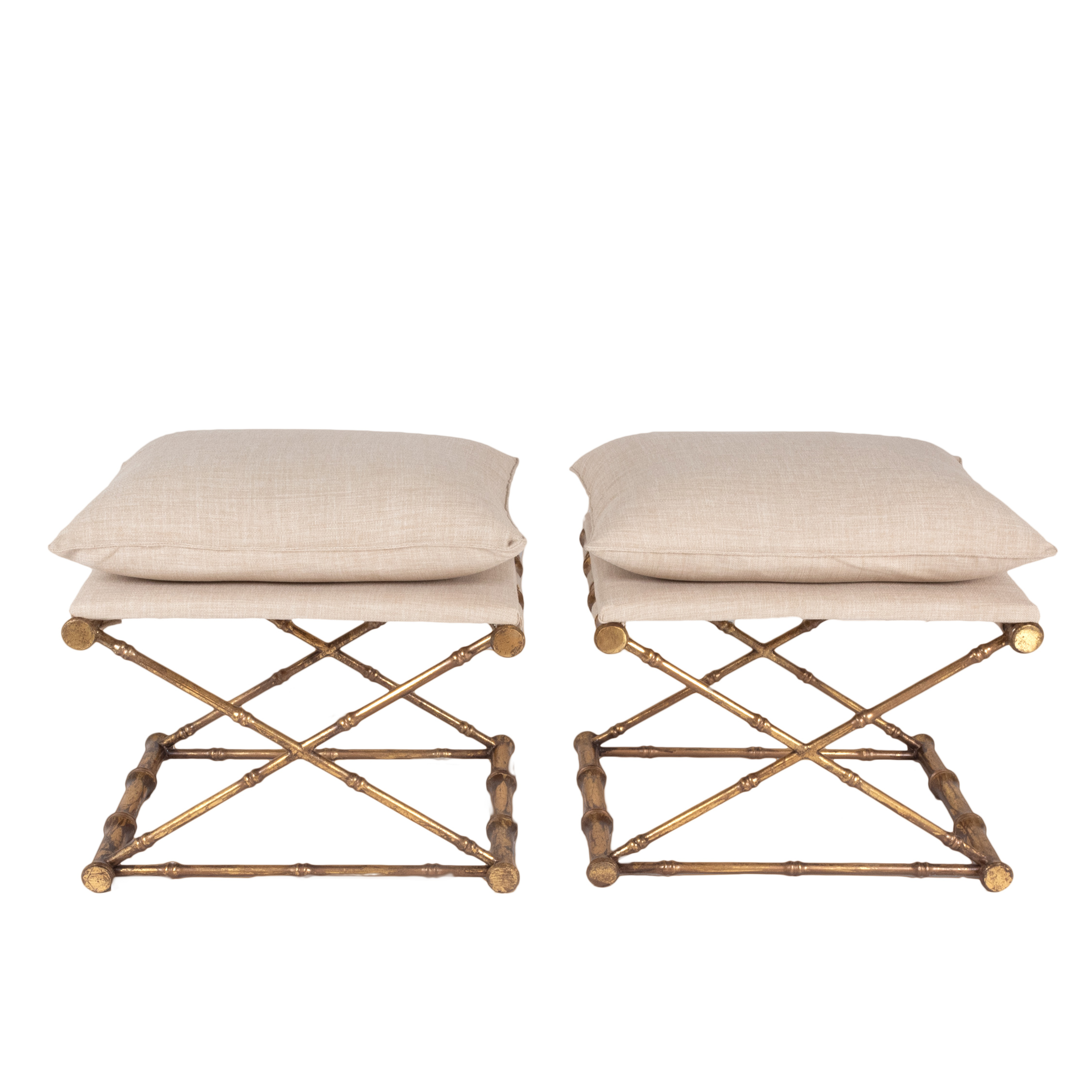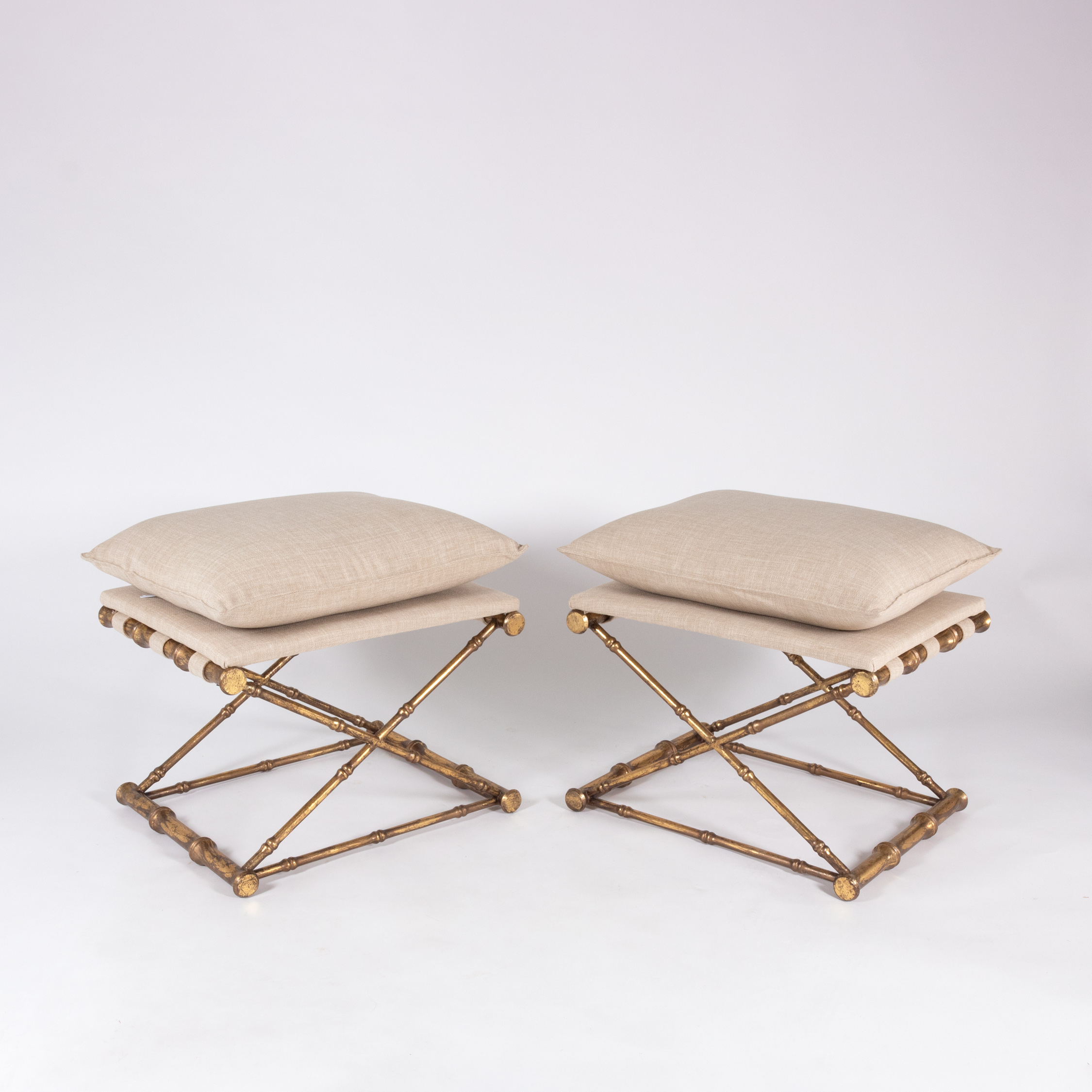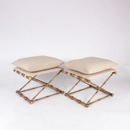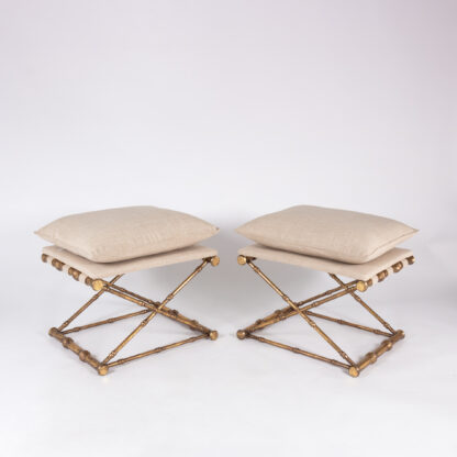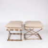 Gilt-metal, faux bamboo stools with linen upholstered seats, French, 20th century.