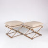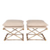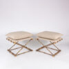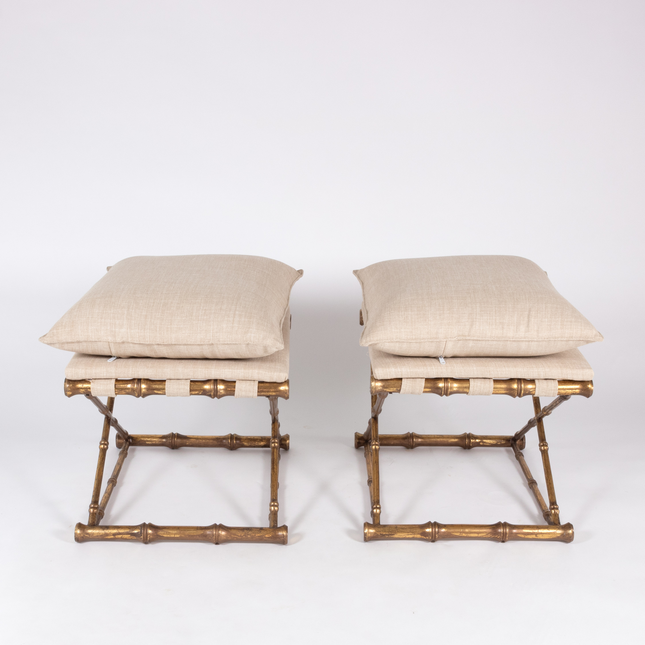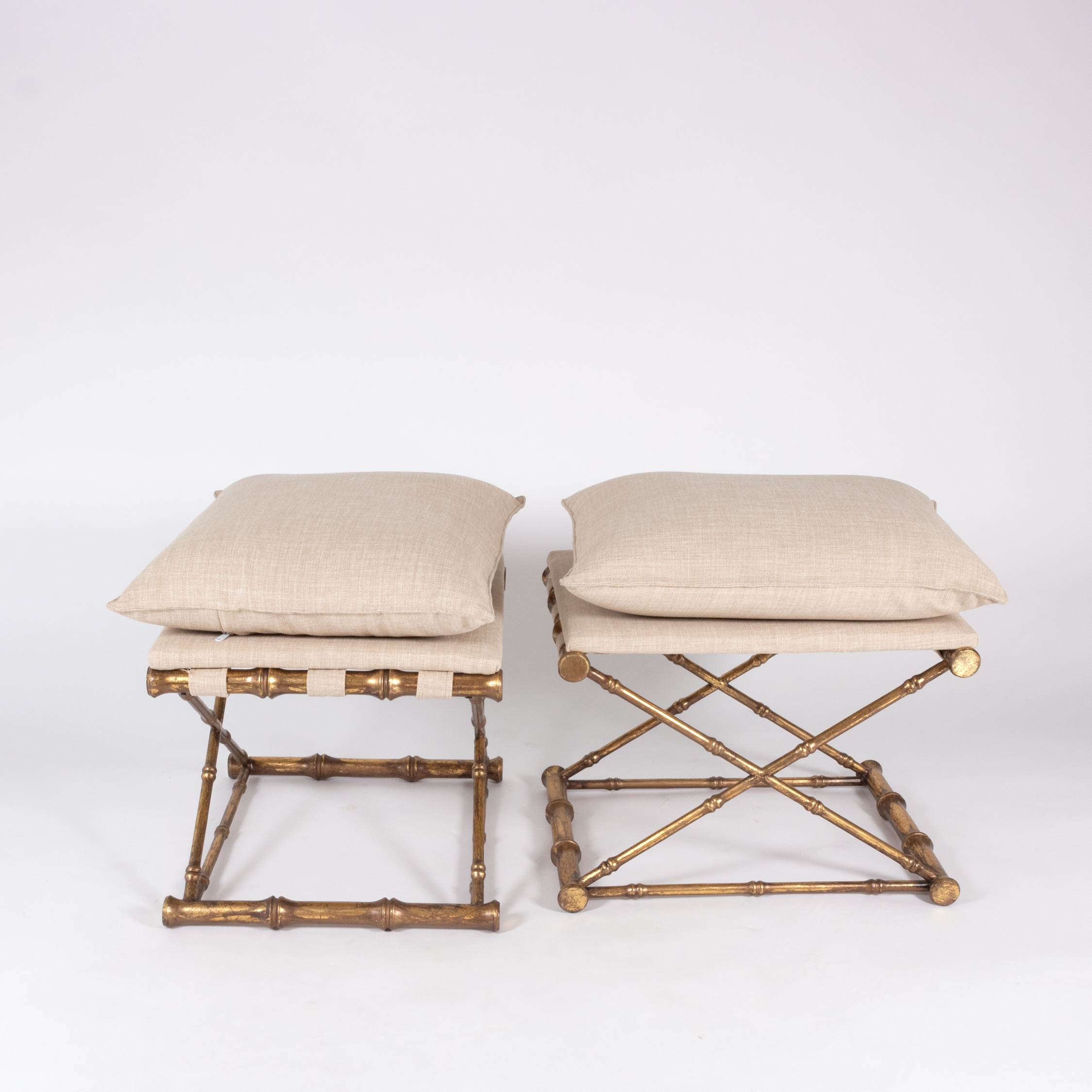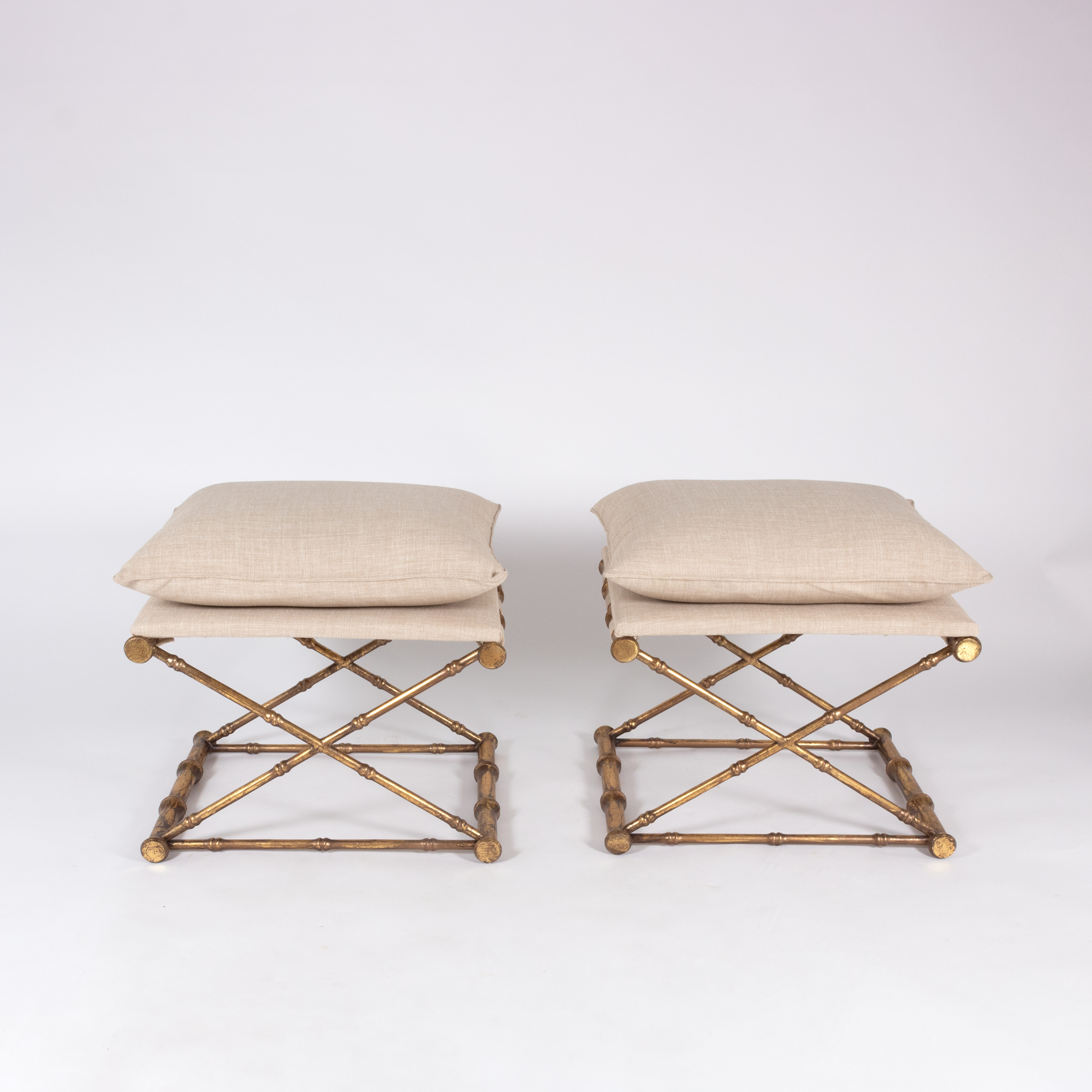 Gilt-metal, faux bamboo stools with linen upholstered seats, French, 20th century.