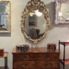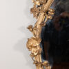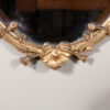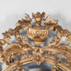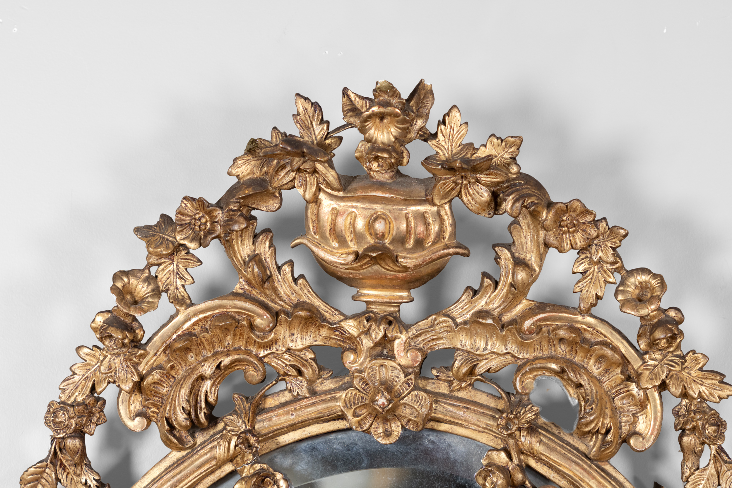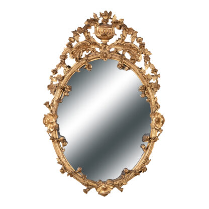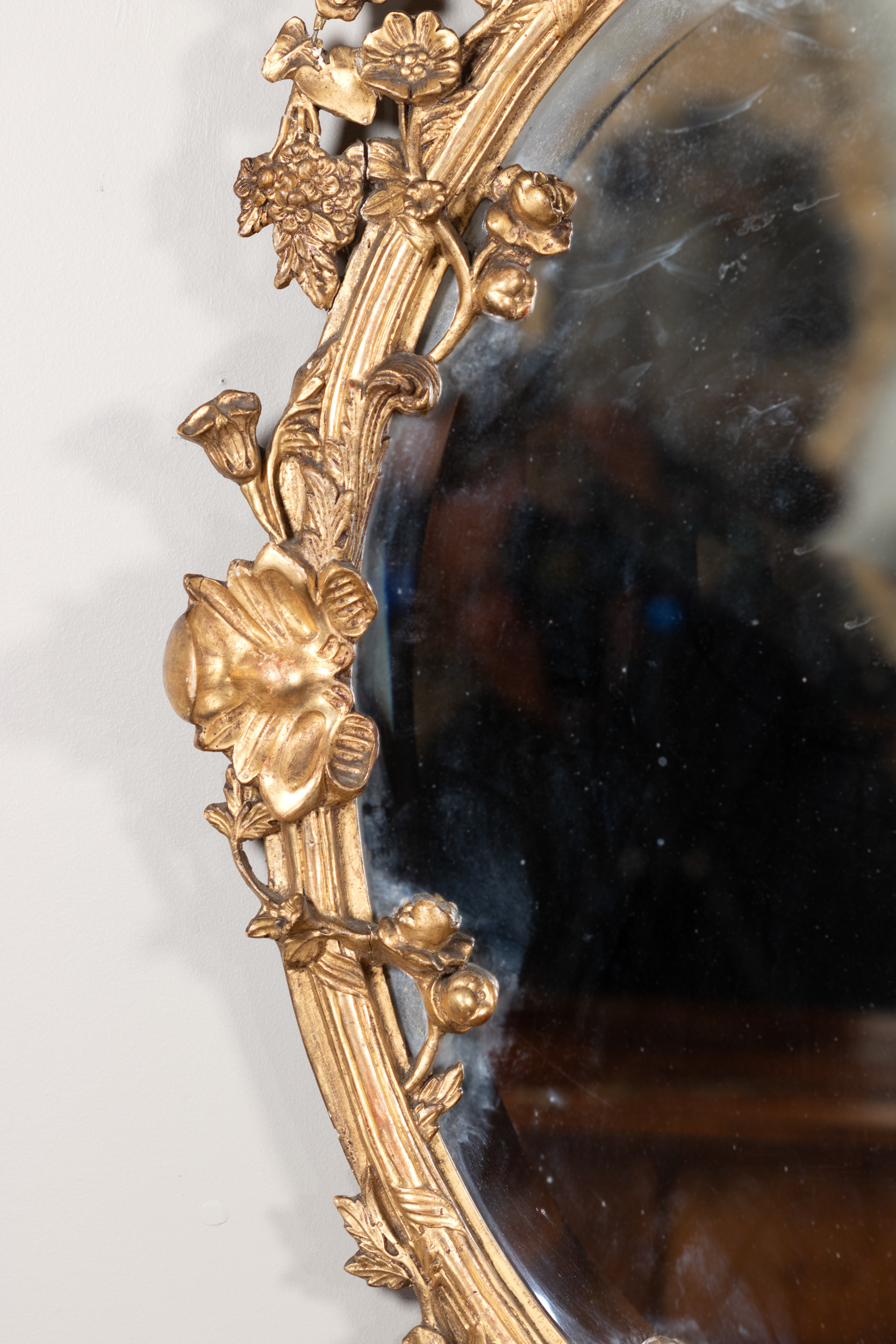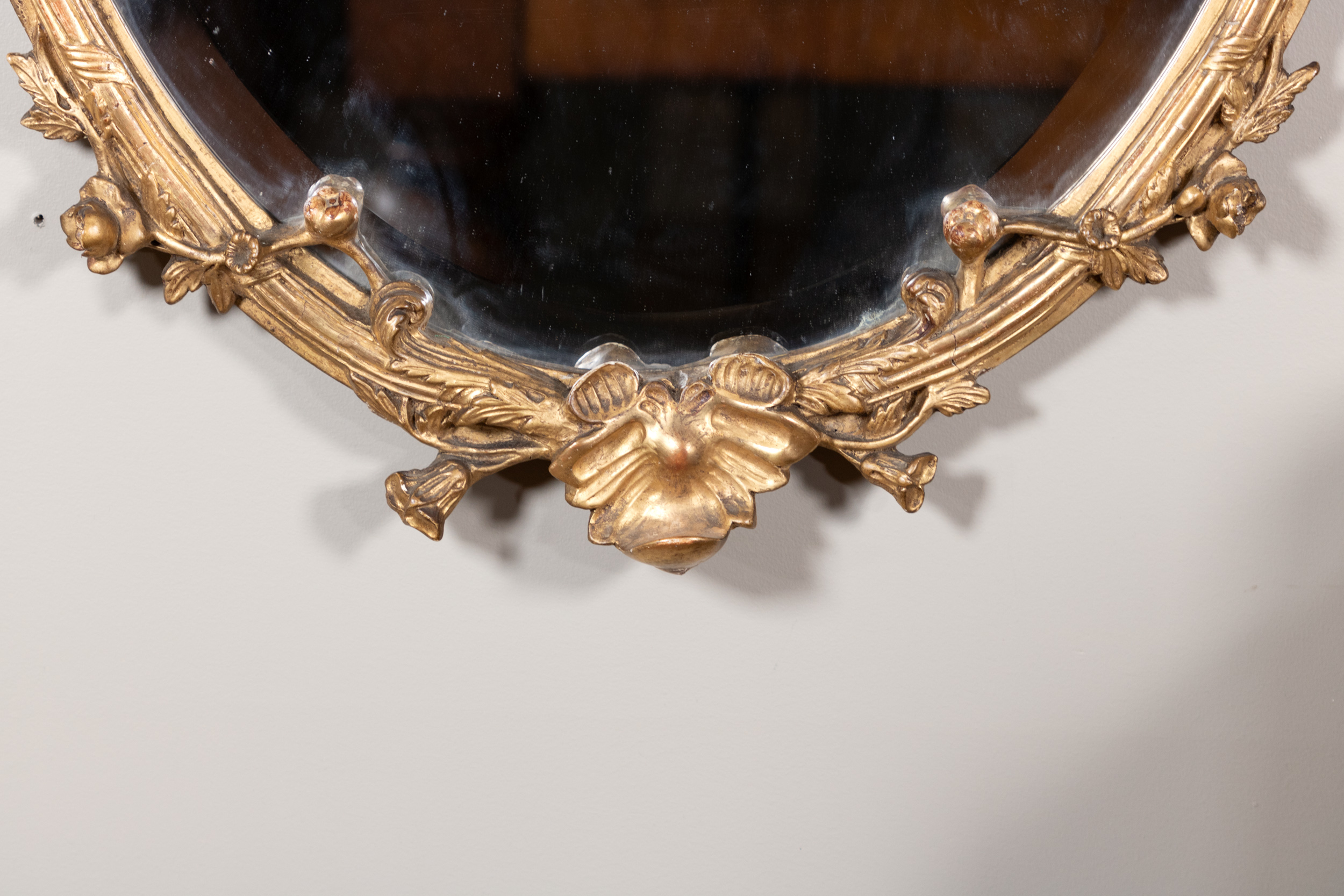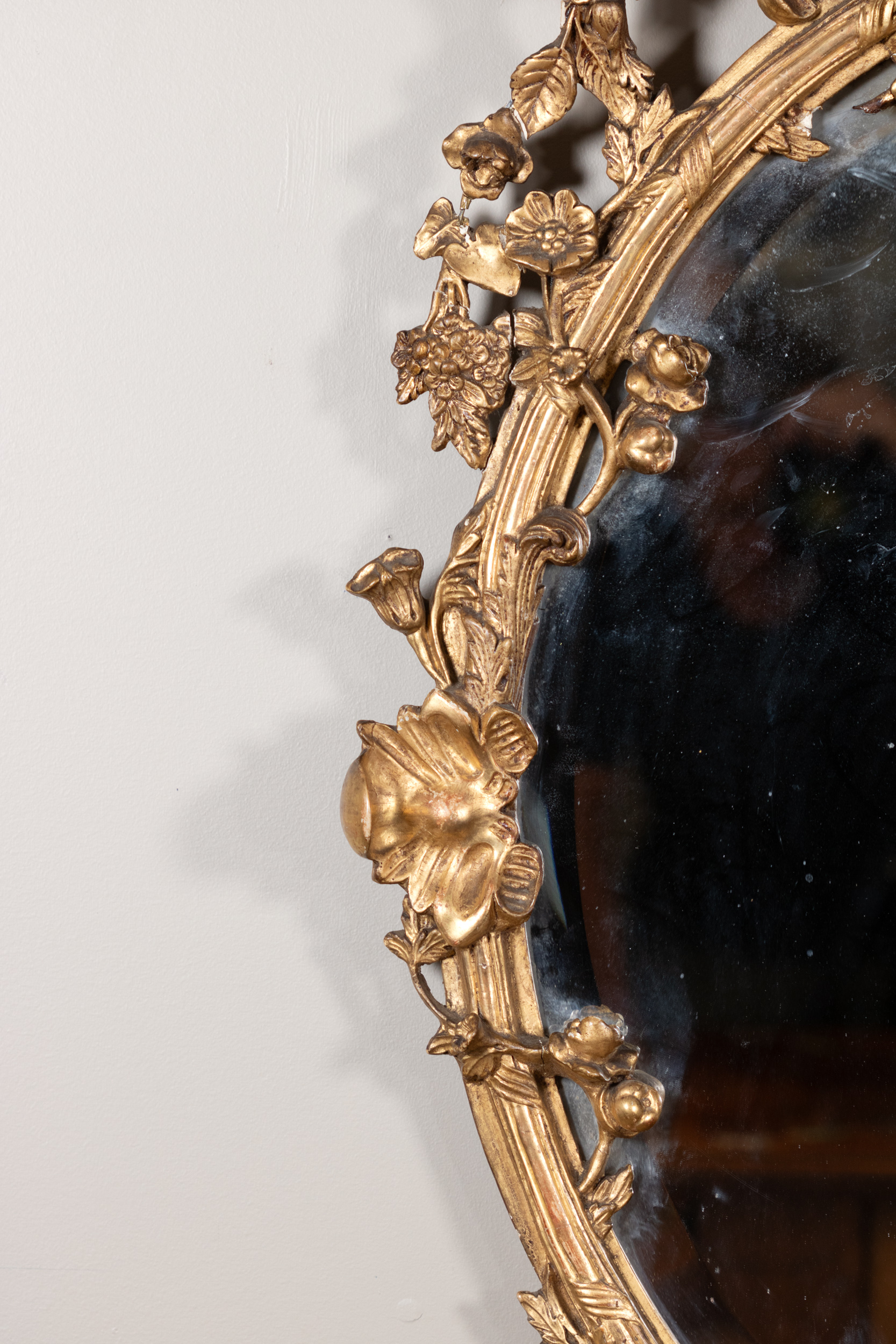 An elegant French giltwood oval mirror, circa 1870, framed by naturalistic motifs of flowers, vines, leaves, and ribbon-and-reed; a crested urn motif also with scrolling and raised botanical carvings, the apron terminating with a pair of spring buds and a leaf. French circa 1870