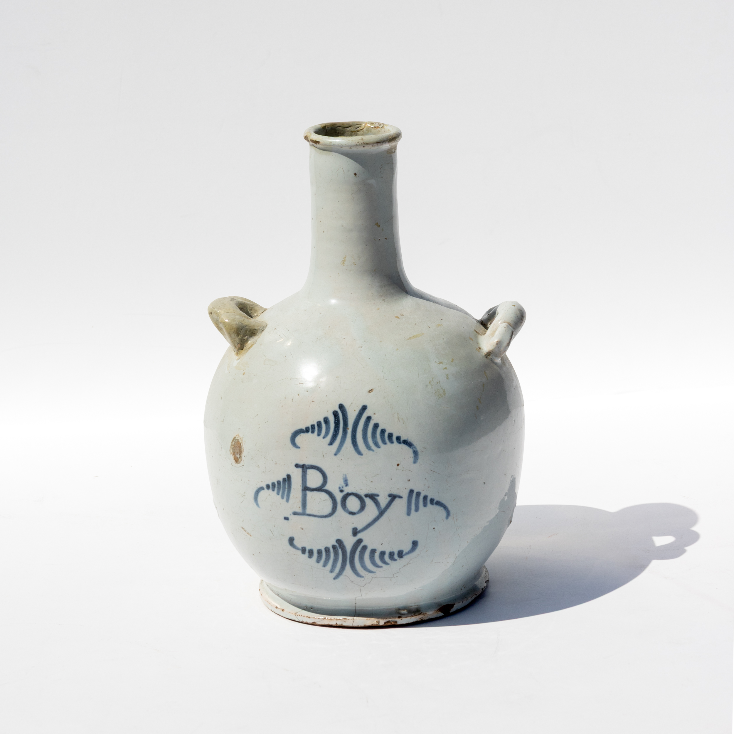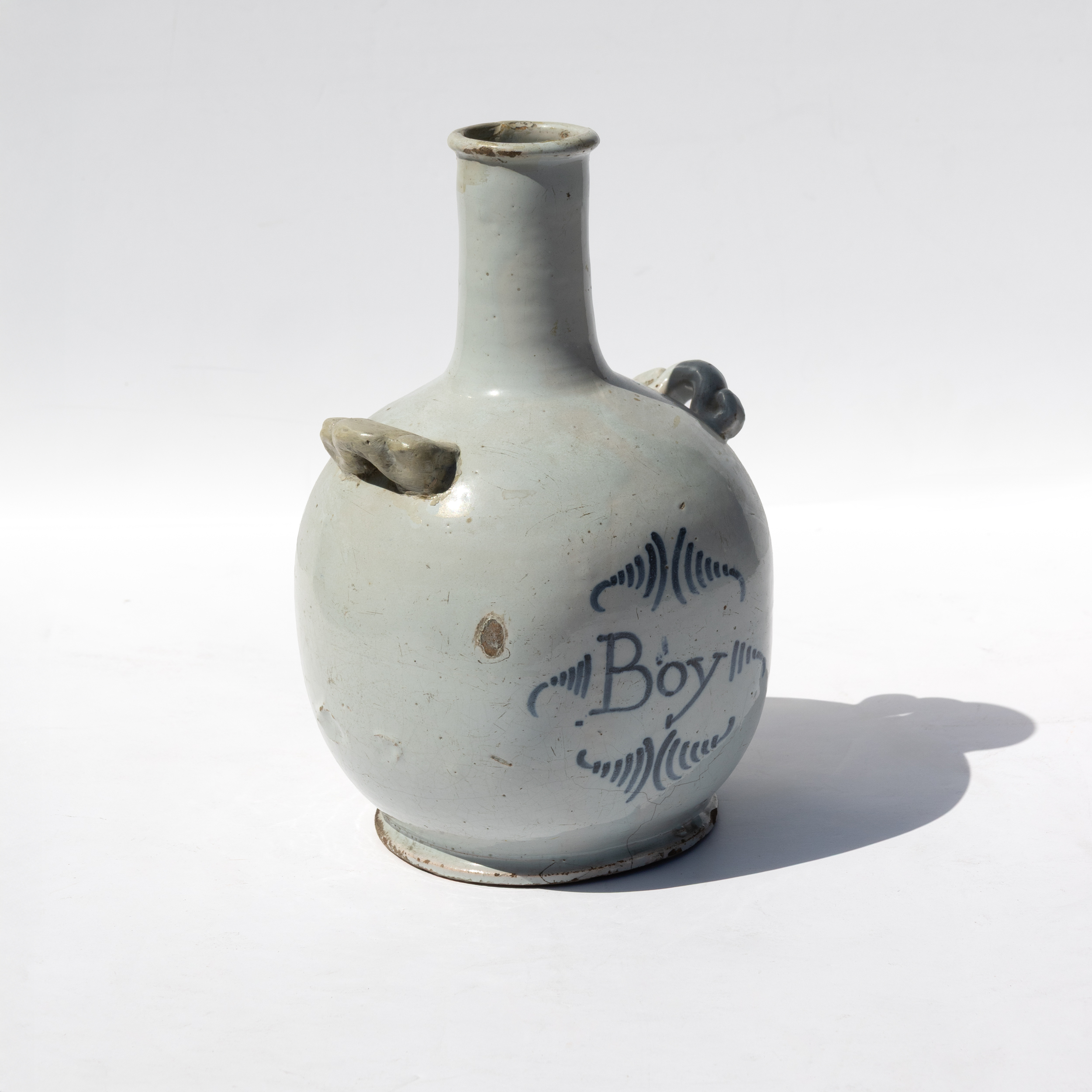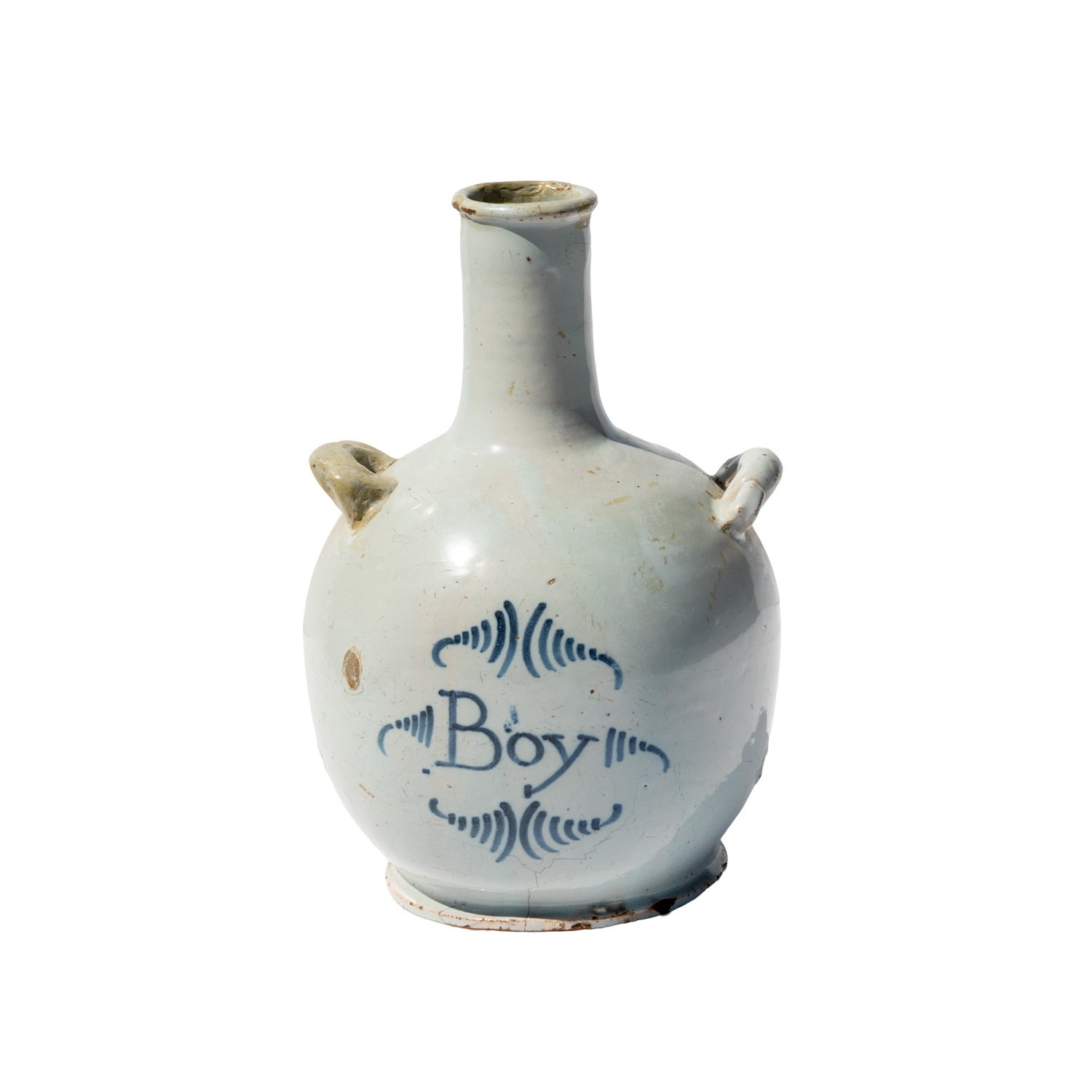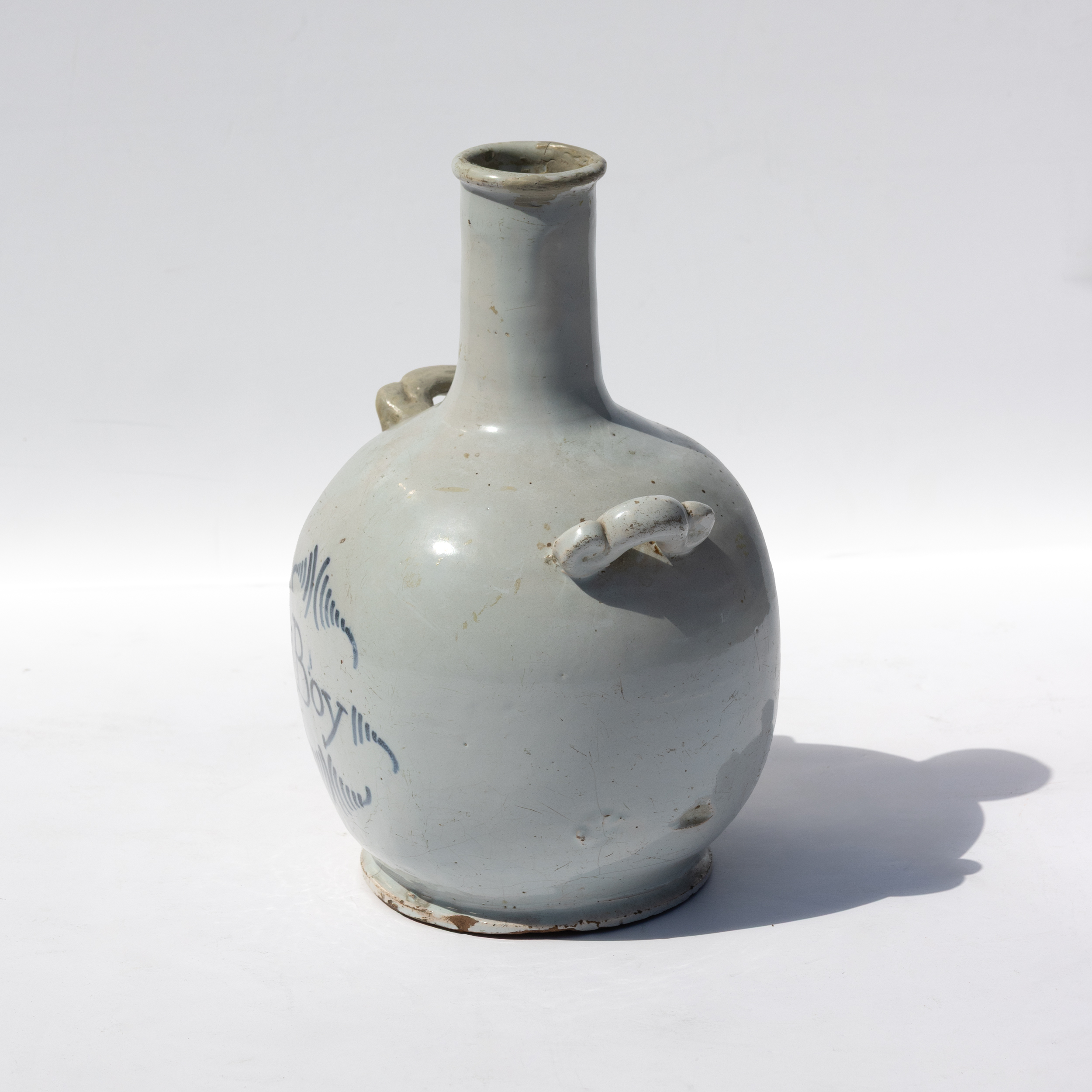 A French low flame glazed 1 pottery water jug of baluster form with narrow cylindrical neck and everted rim. The body bears cobalt blue script inscription “Boy” within decorative flourishes. Two strap handles extend from the shoulder. The pale grey-white low flame glaze shows characteristic speckling and exhibits expected crazing consistent with 18th-century French faience. The unglazed foot rim reveals the buff earthenware body. Period earthenware water jugs of this type were produced in various French pottery centers, with similar examples attributed to workshops in Nevers, Rouen, or regional centers following established faience traditions.