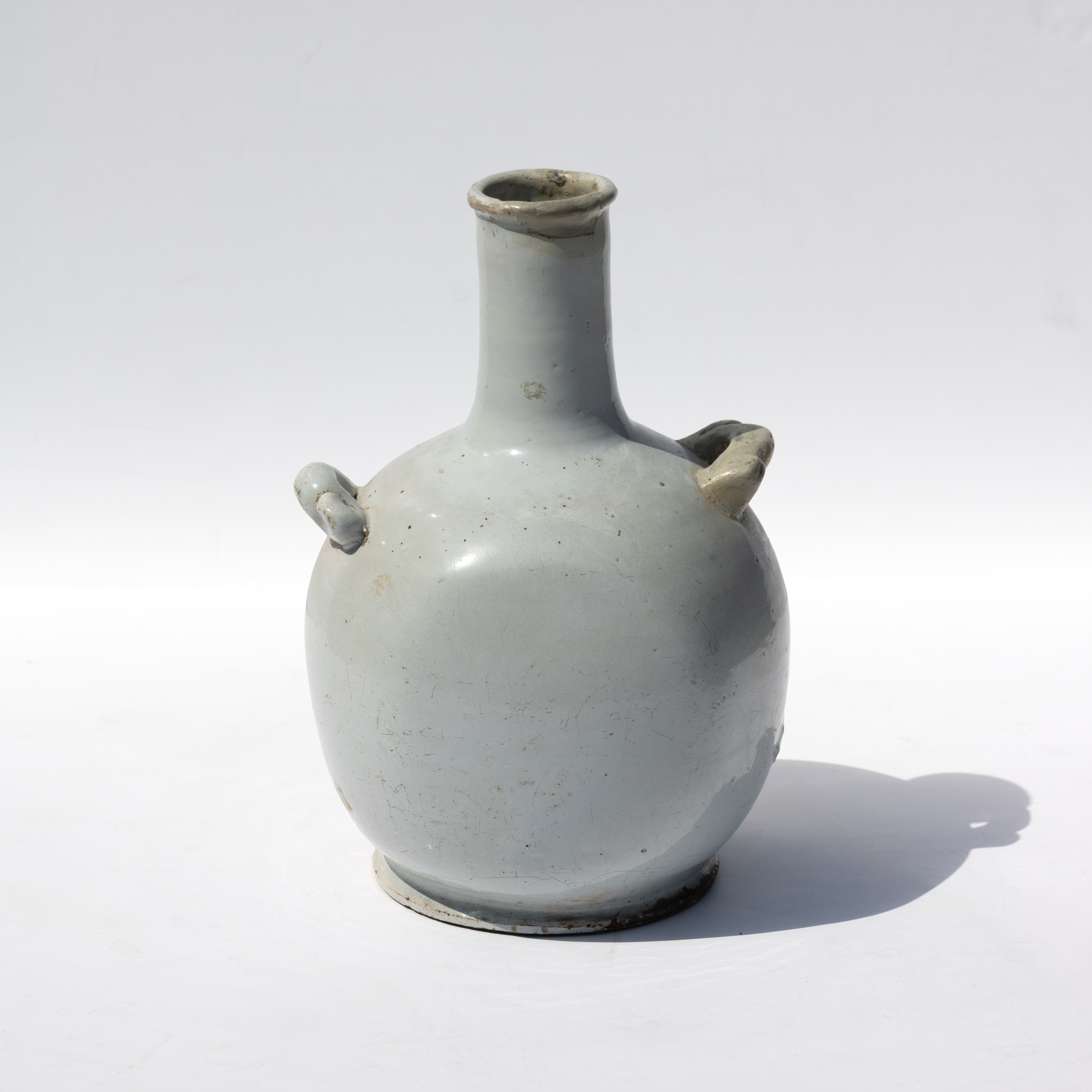 French faience is divided into two primary techniques. Grand feu (high fire) describes pieces decorated with glaze and metallic oxides before being fired once at approximately 1650°F (900°C). Petit feu (low-fire) faience, developed in the second half of the eighteenth century, involves firing the clay body before glazing and decorating with metallic oxides, then firing again at a lower temperature. The lower firing temperature of petit feu faience enabled both greater precision in painting techniques and variety in the range of colors, allowing for decorative elements like the cobalt blue script decoration seen on this water jug. The composition and firing temperature of petit feu glazes render them particularly susceptible to crazing, with the glaze remaining reactive to environmental fluctuations, making the characteristic network of fine surface cracks an expected feature of aged examples. ↩