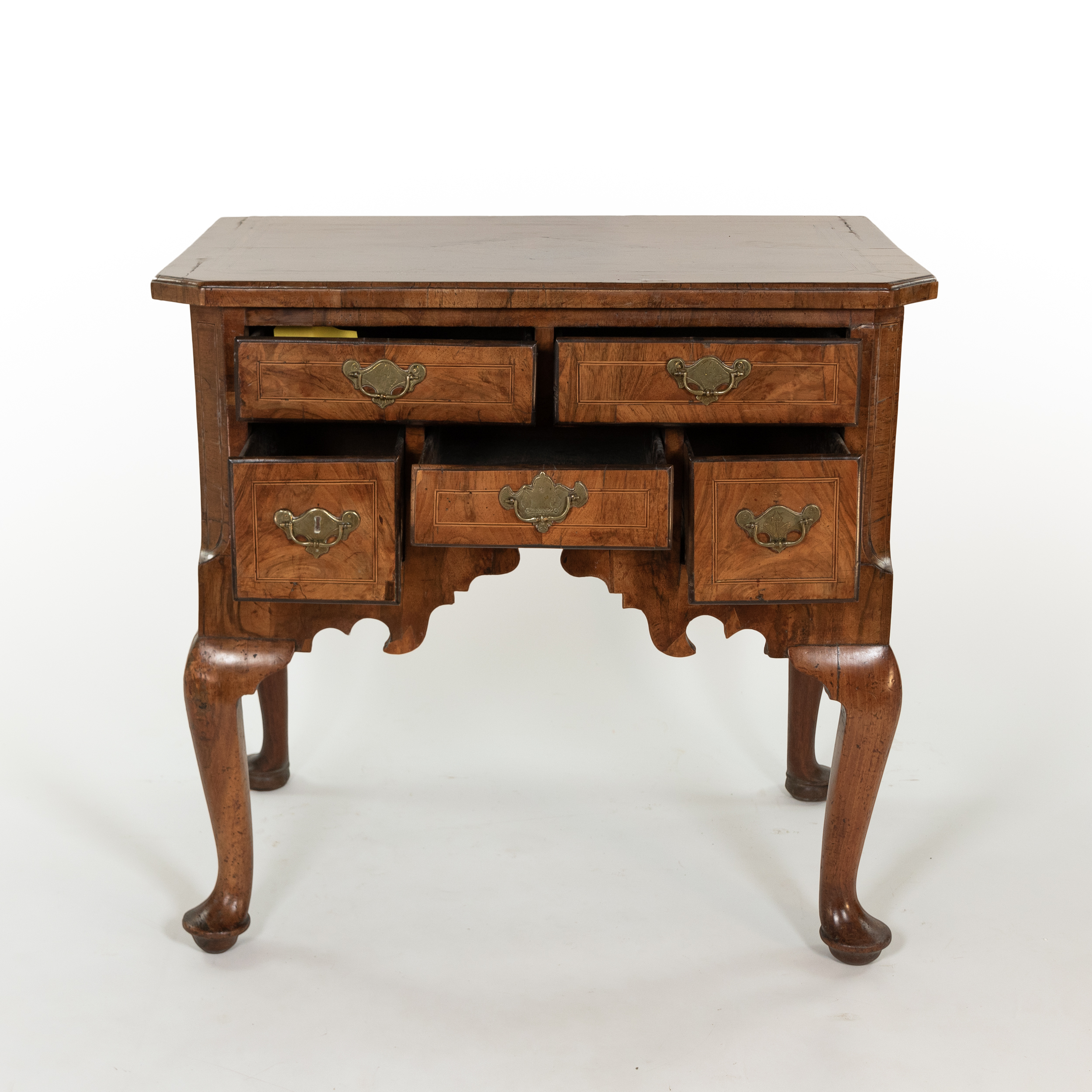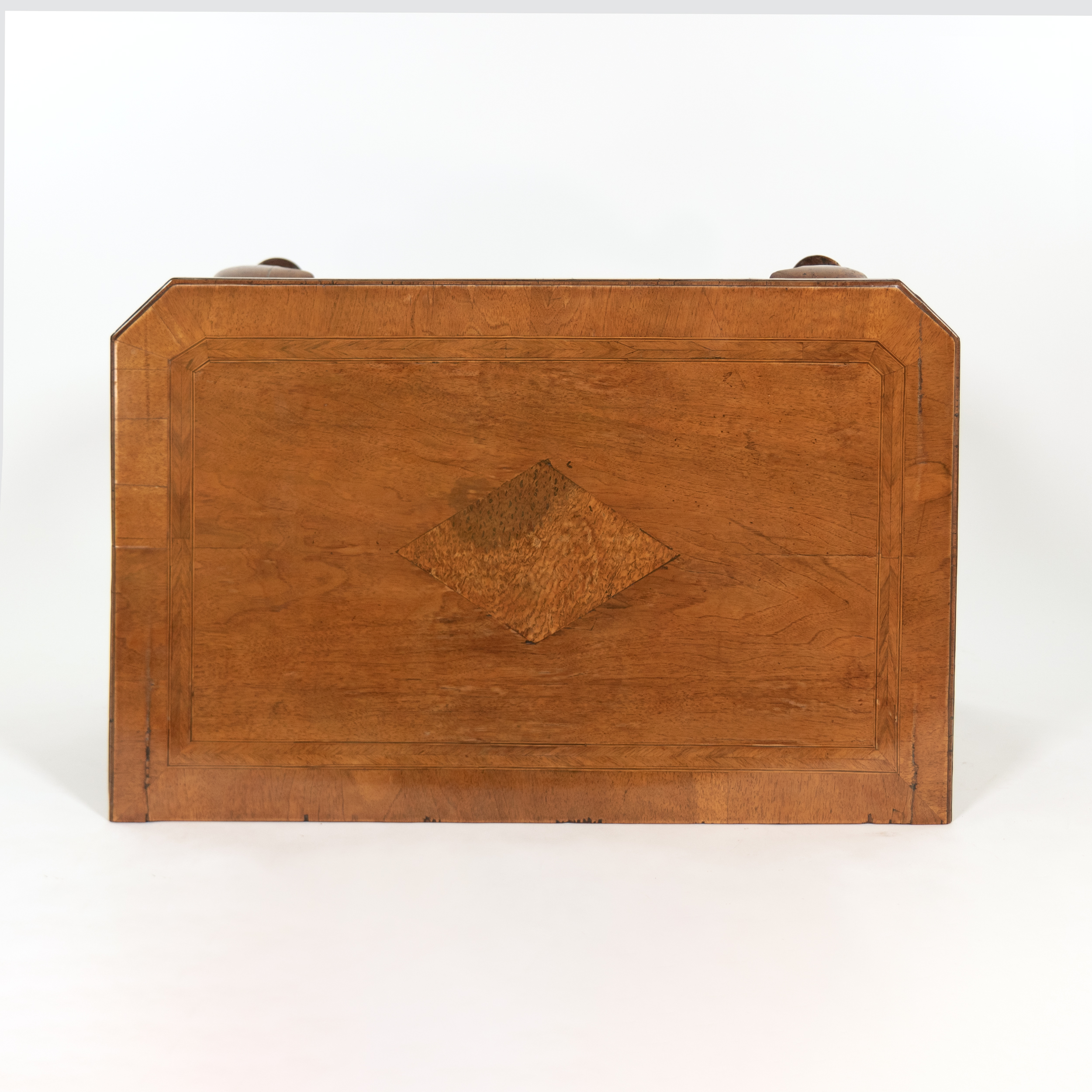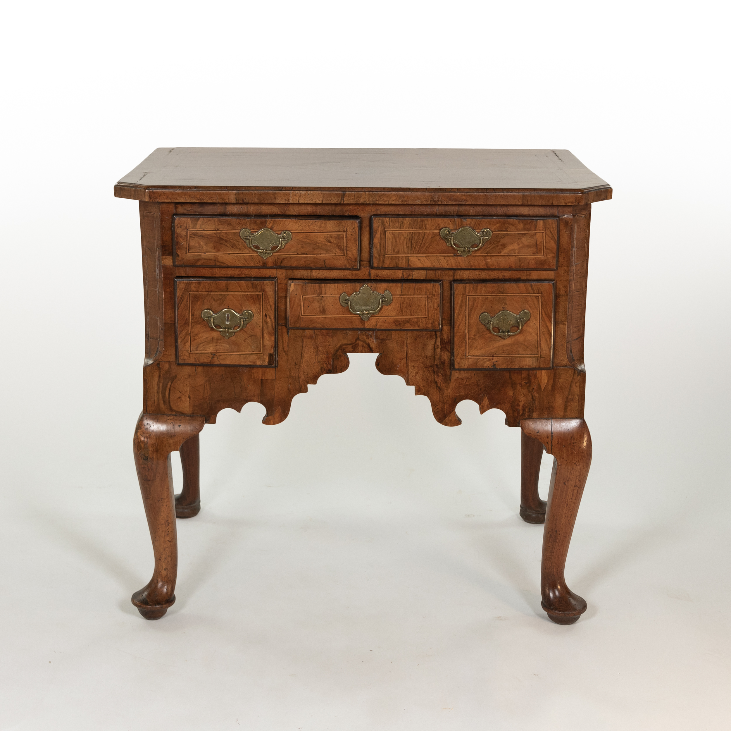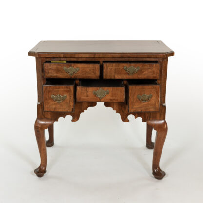 A handsome George II walnut lowboy with burl inlaid top in diamond pattern and canted corners; two larger drawers over three smaller drawers, all with brass hardware and inlaid satinwood borders, scalloped apron on cabriolet legs on pad feet. English circa 1760.