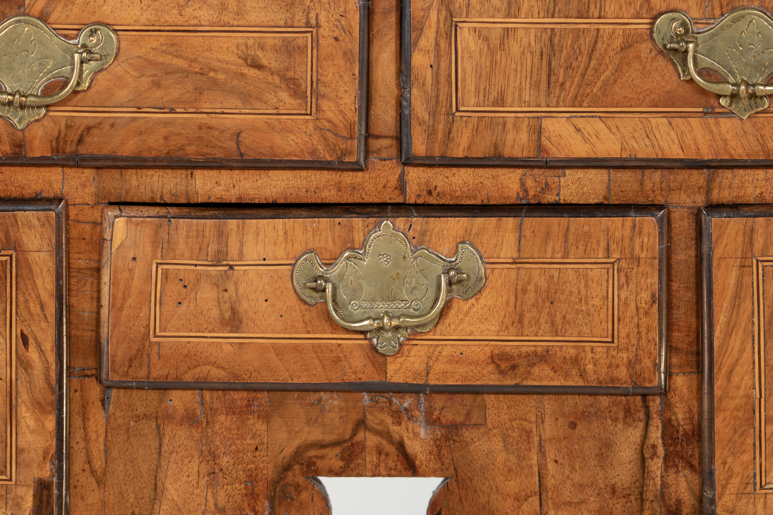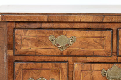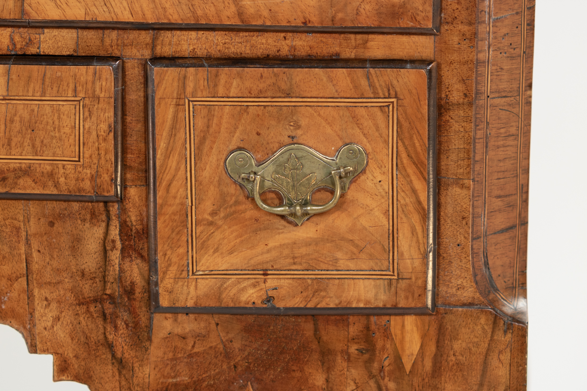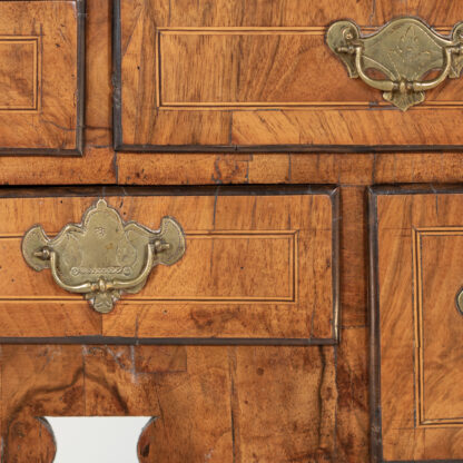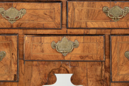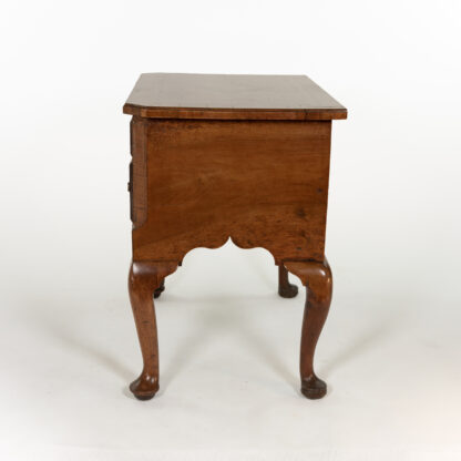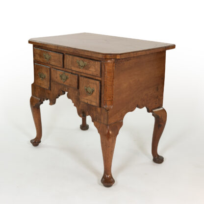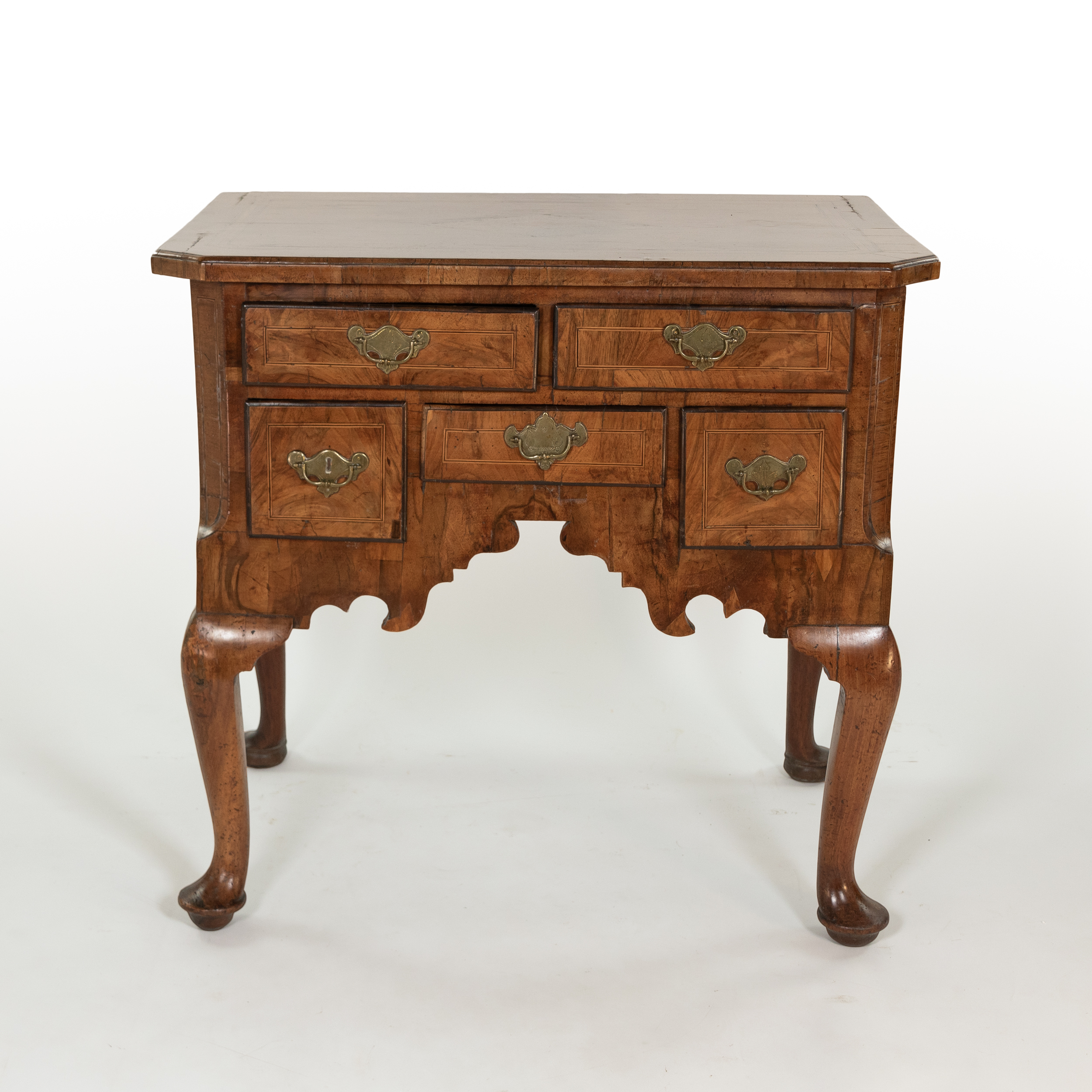 A handsome George II walnut lowboy with burl inlaid top in diamond pattern and canted corners; two larger drawers over three smaller drawers, all with brass hardware and inlaid satinwood borders, scalloped apron on cabriolet legs on pad feet. English circa 1760.