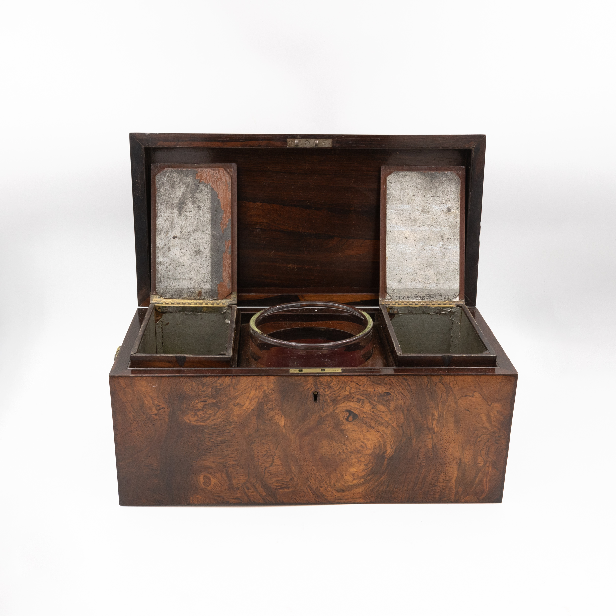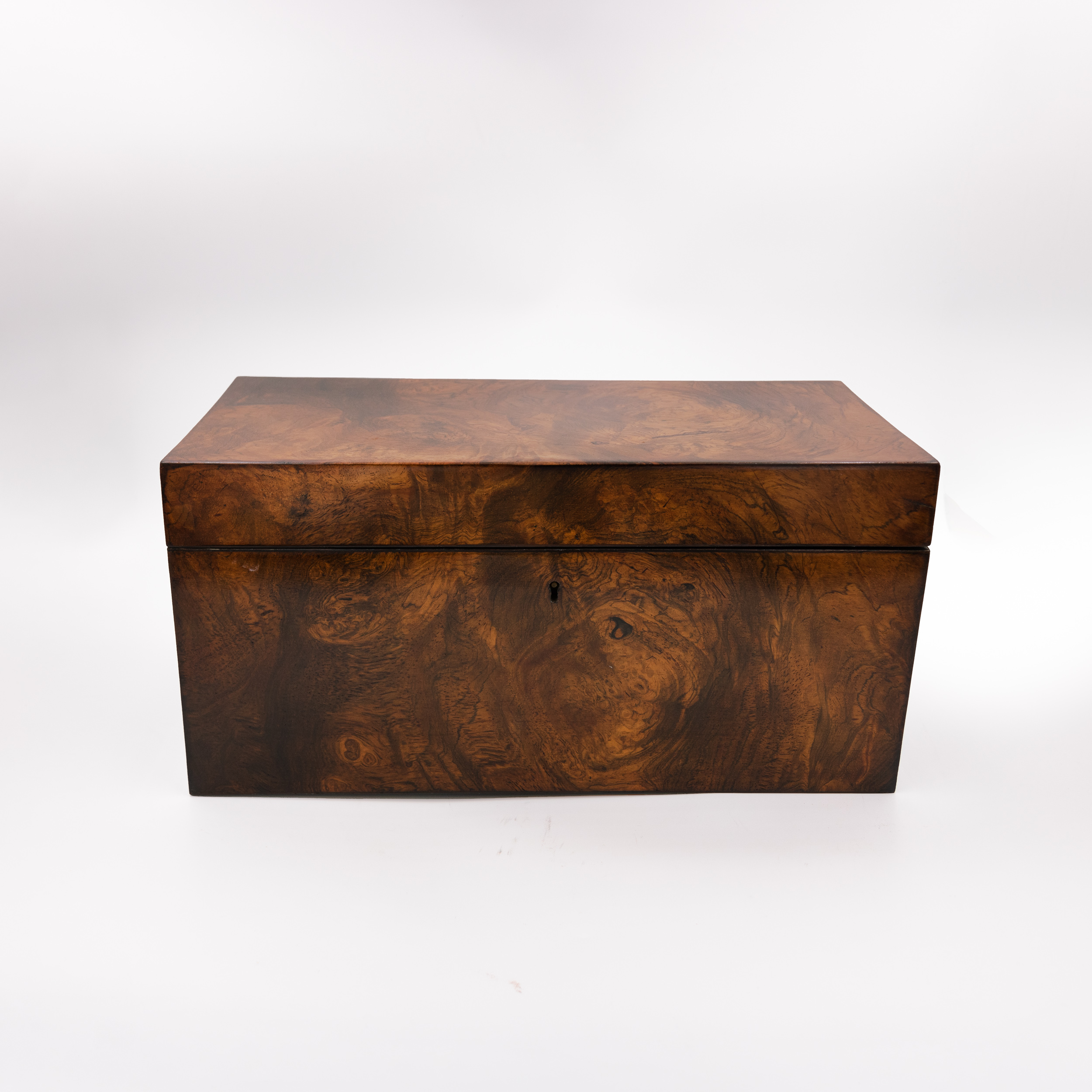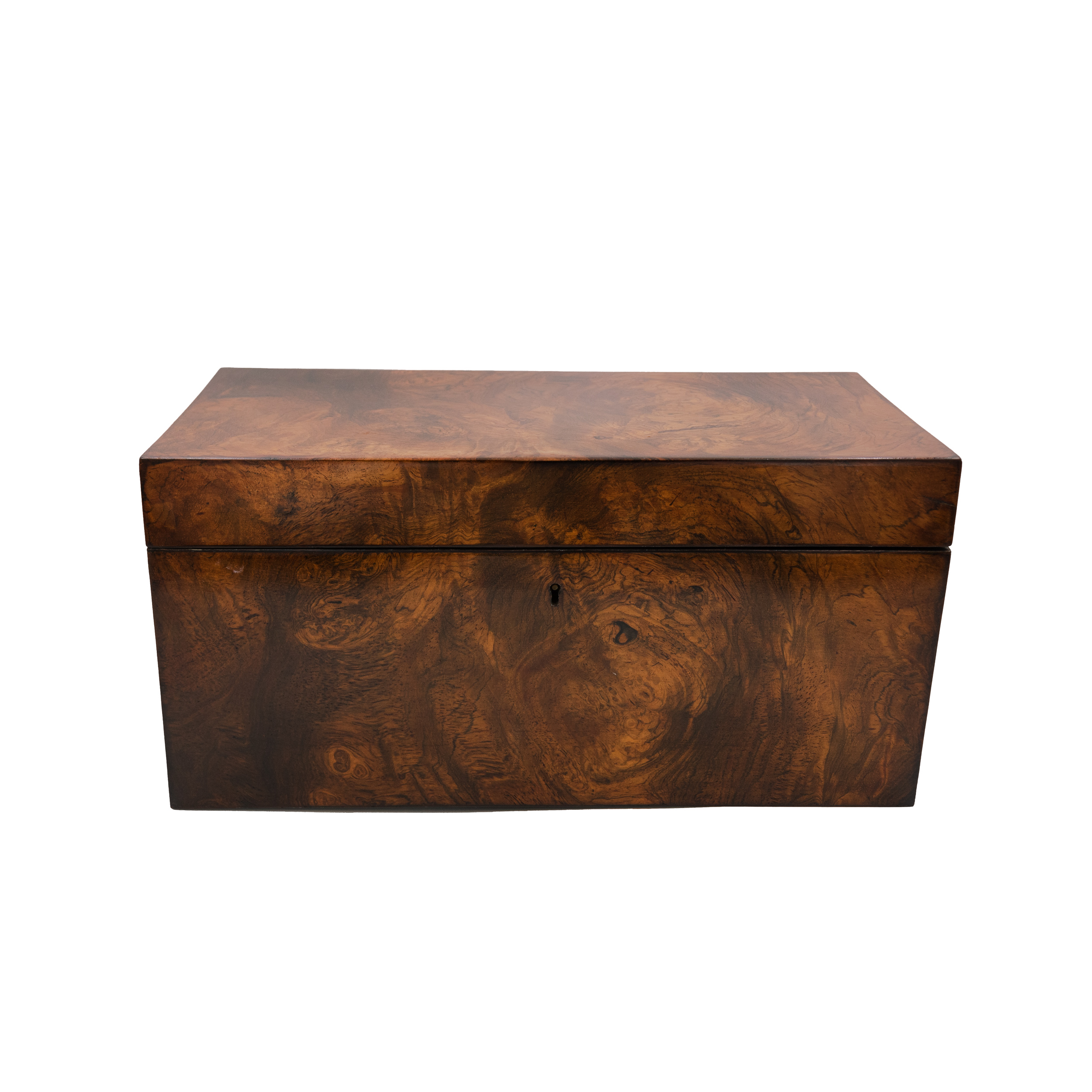 Large scale George III period burl walnut tea caddy of rectangular form in richly figured walnut burl, the hinged lid opening to reveal a fitted interior with twin compartmented tea canisters flanking a central glass sugar bowl. The exterior appointed with cast brass ring handles and lock escutcheon. Original brass hinges. English, circa 1800