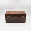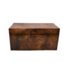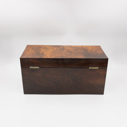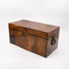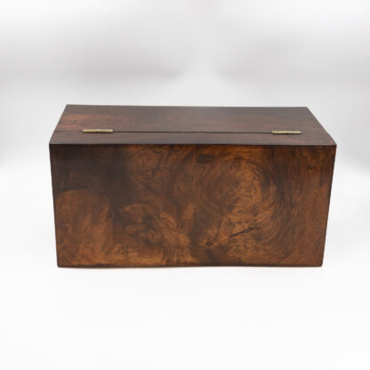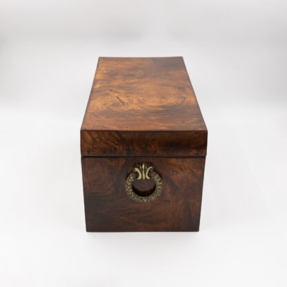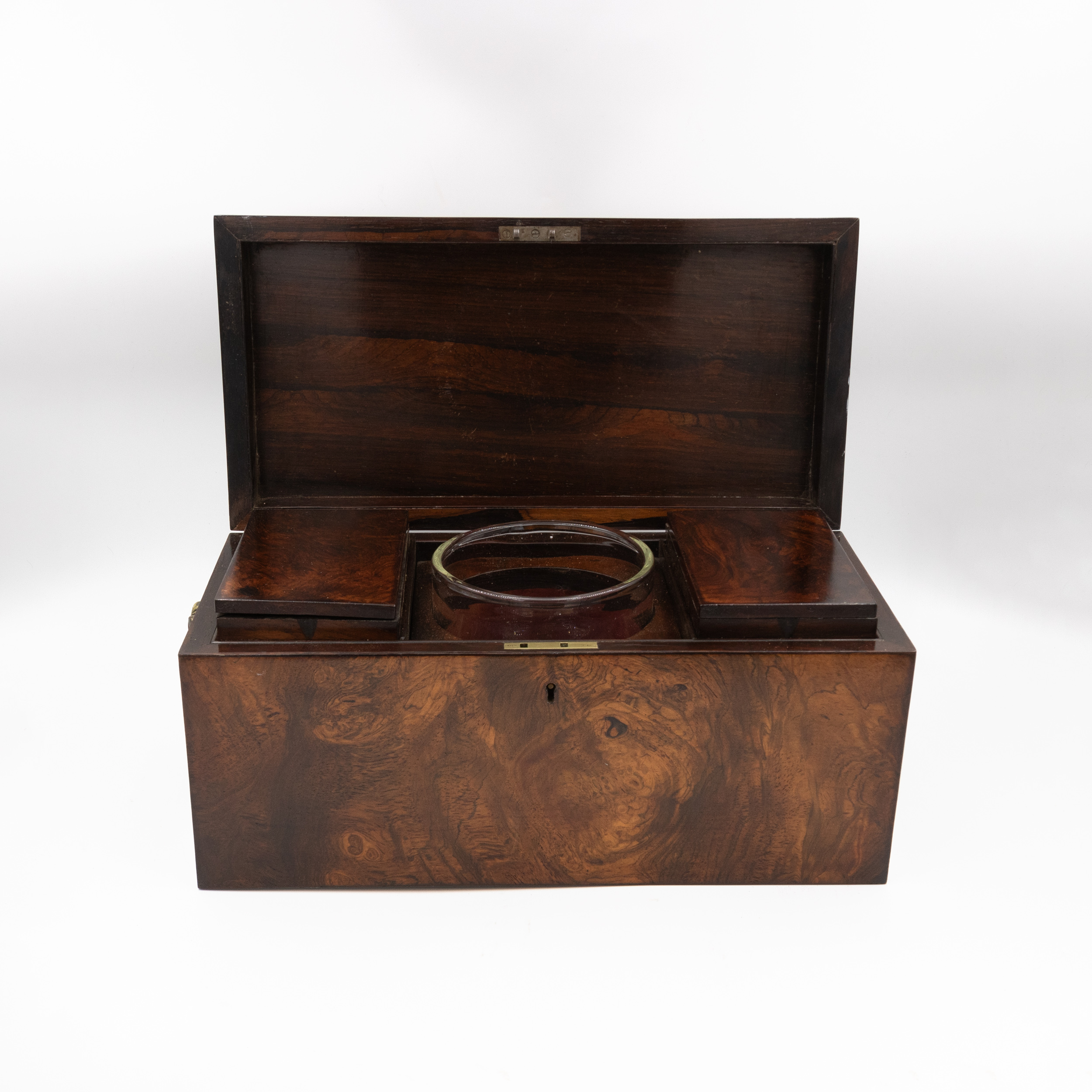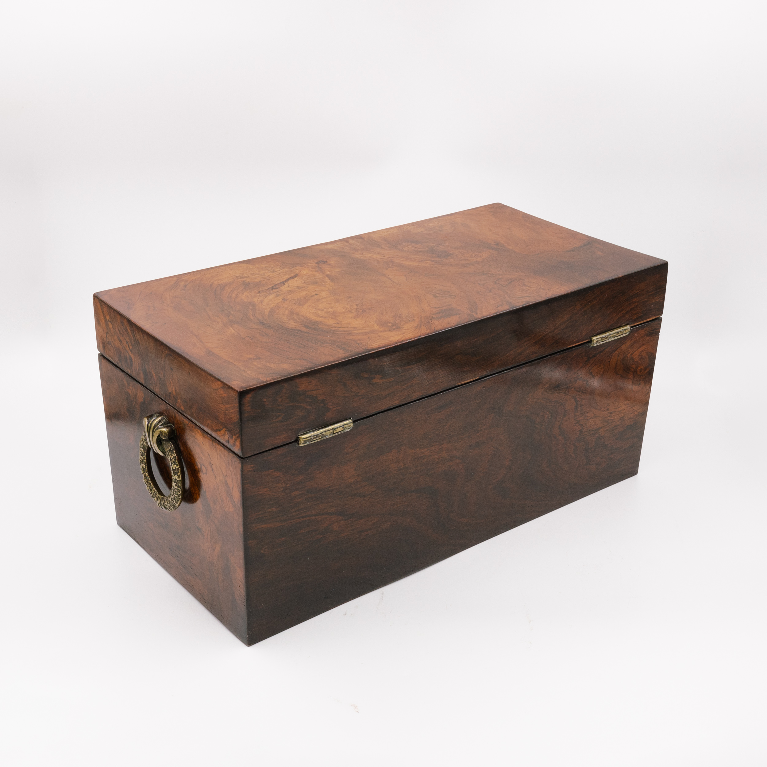 Large scale George III period burl walnut tea caddy of rectangular form in richly figured walnut burl, the hinged lid opening to reveal a fitted interior with twin compartmented tea canisters flanking a central glass sugar bowl. The exterior appointed with cast brass ring handles and lock escutcheon. Original brass hinges. English, circa 1800