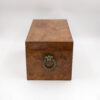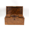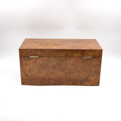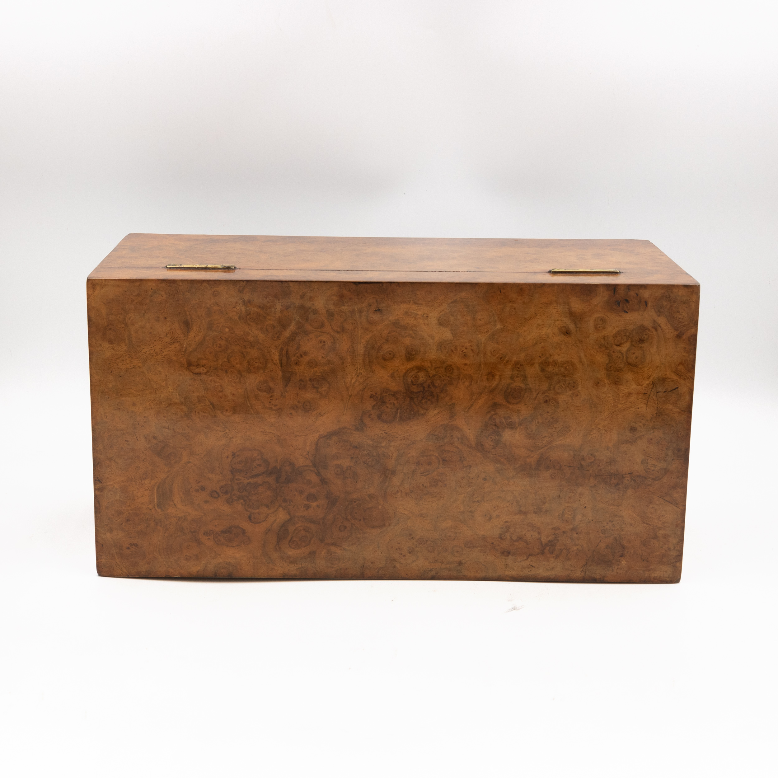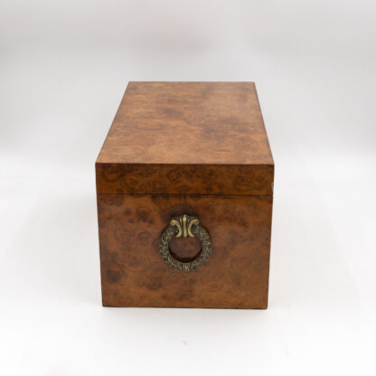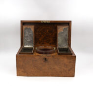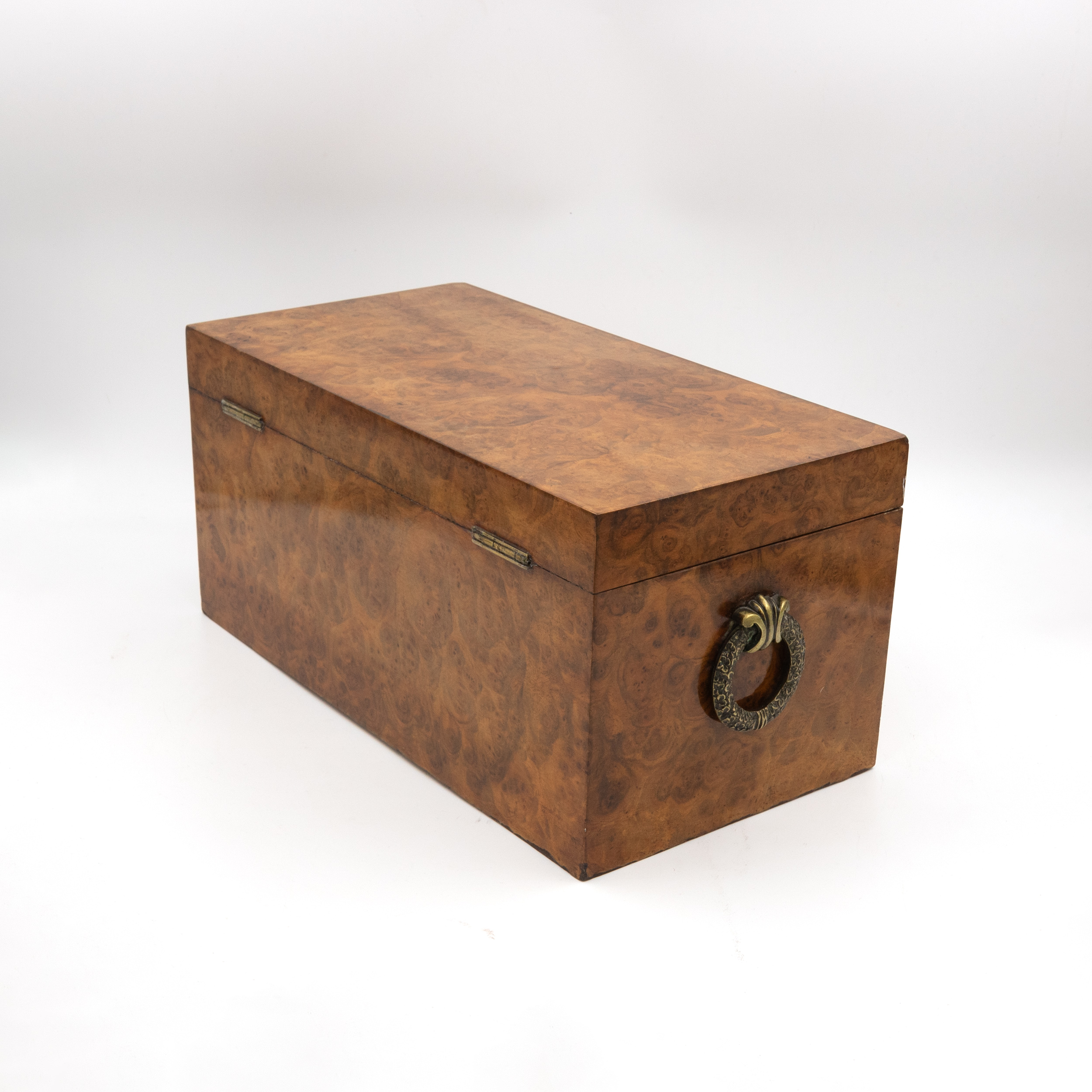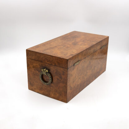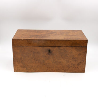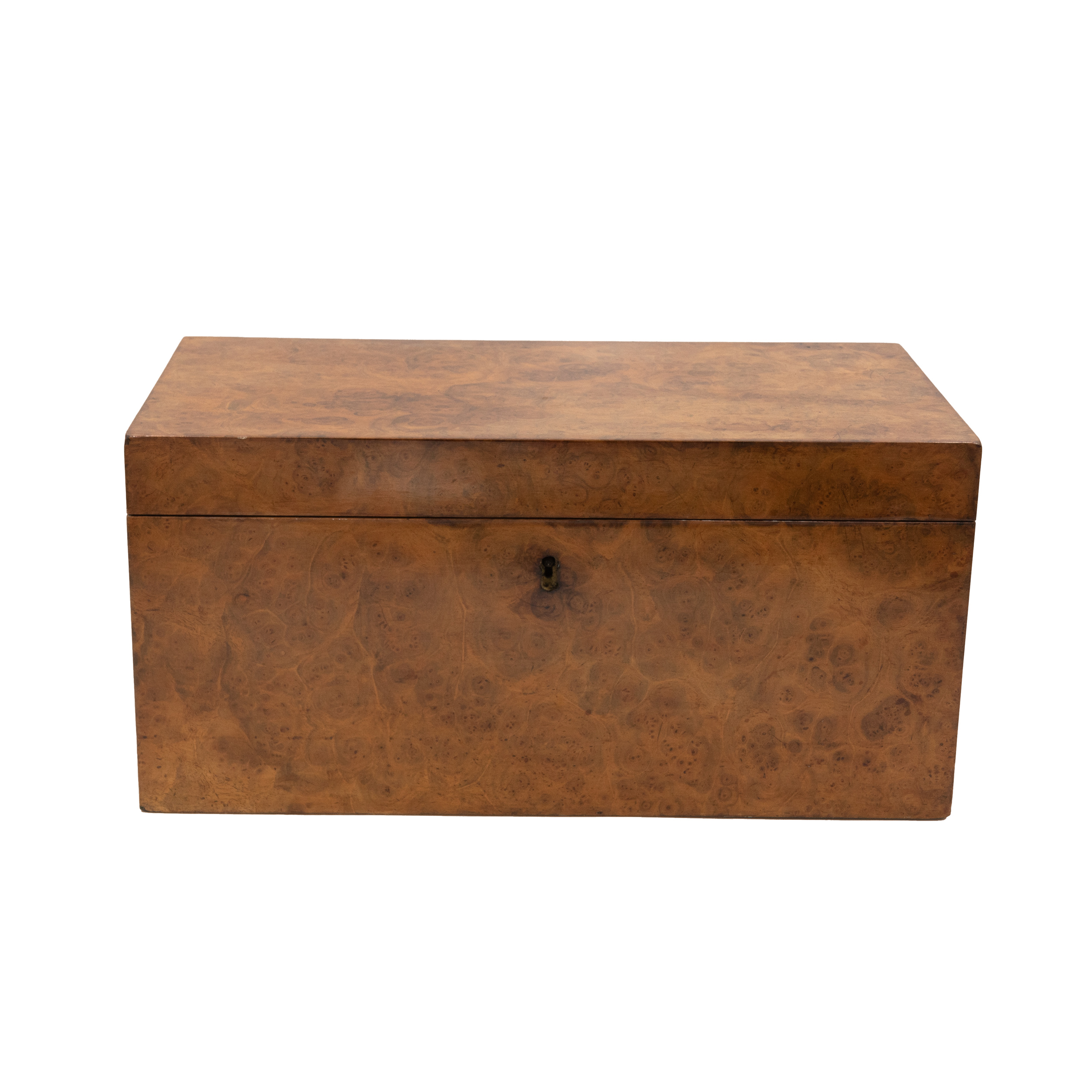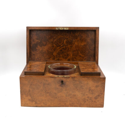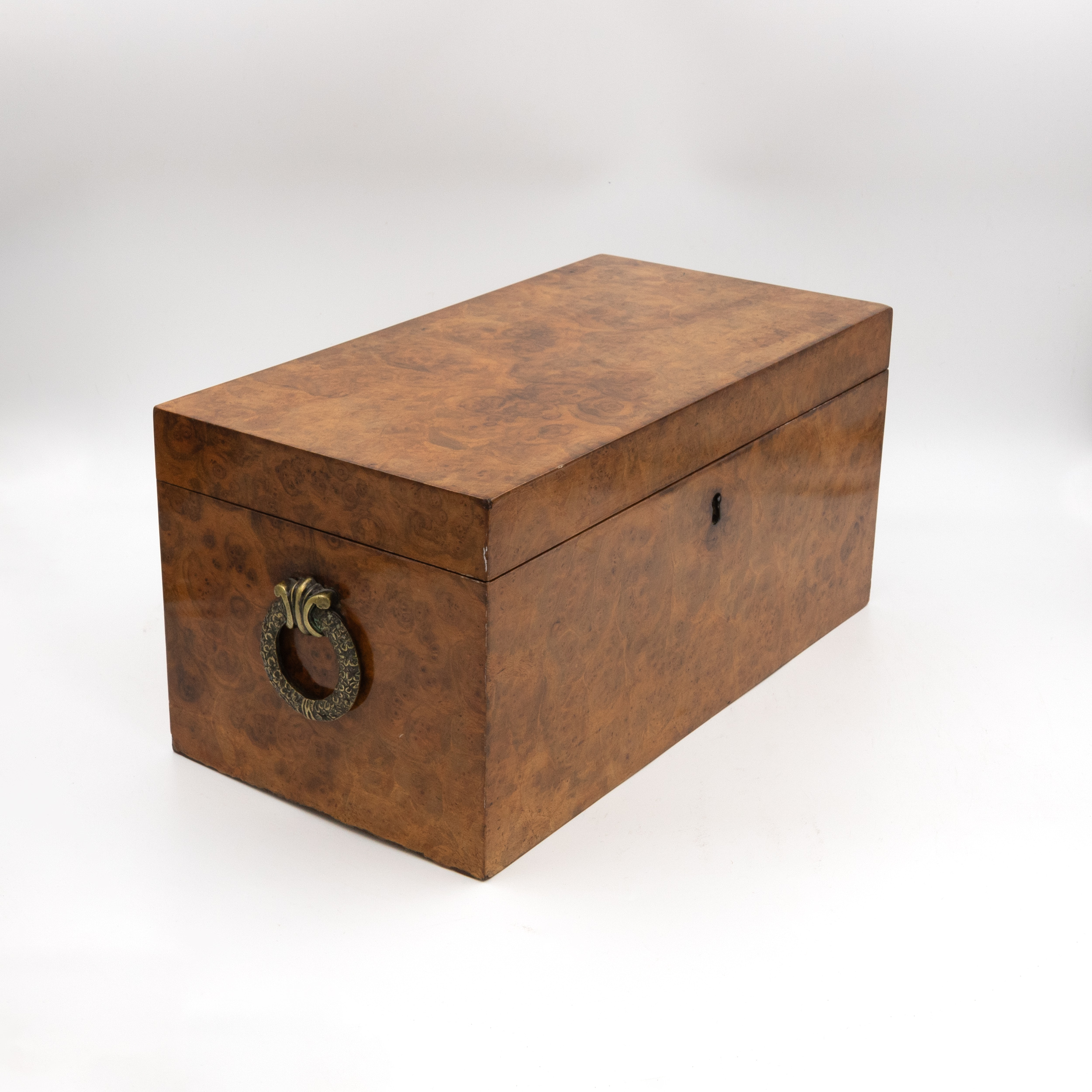 Large scale George III period burr yew wood tea caddy of rectangular form with cast brass ring handles, hinged lid revealing compartmentalized interior with two lidded canisters flanking a central glass sugar bowl. The exterior featuring fine burr yew wood veneers with distinctive figured grain patterns throughout. Original brass hardware and working lock. English, circa 1800.